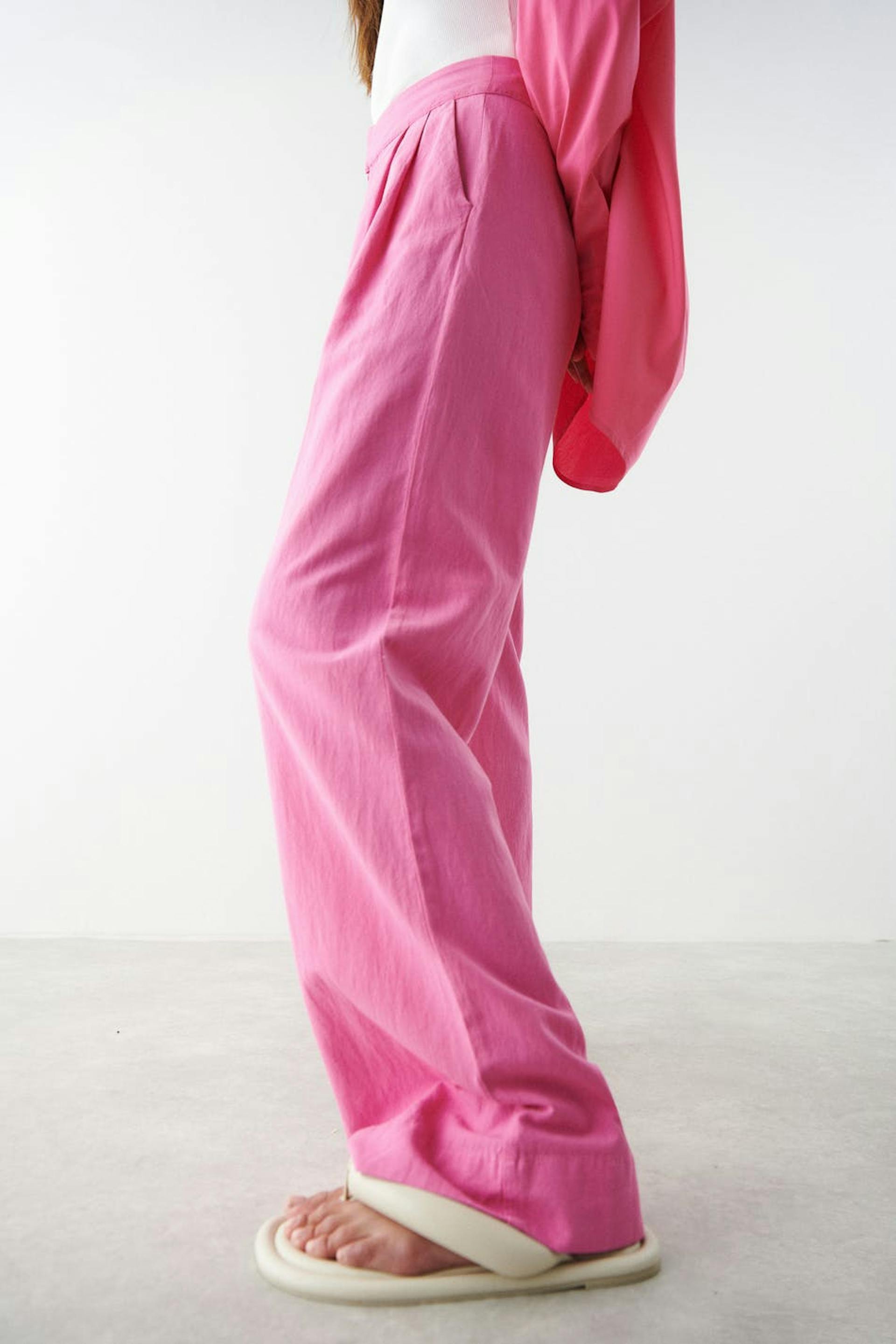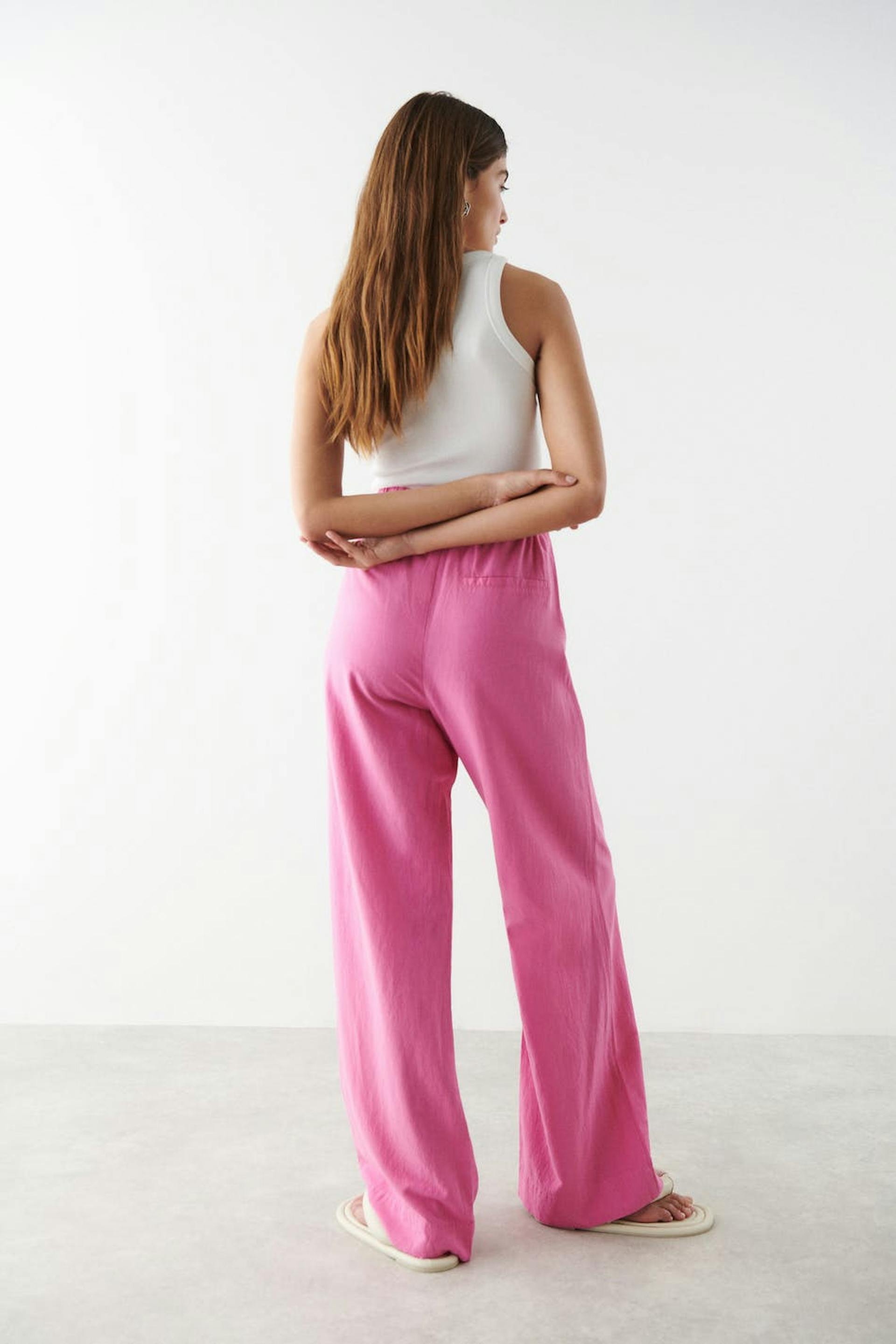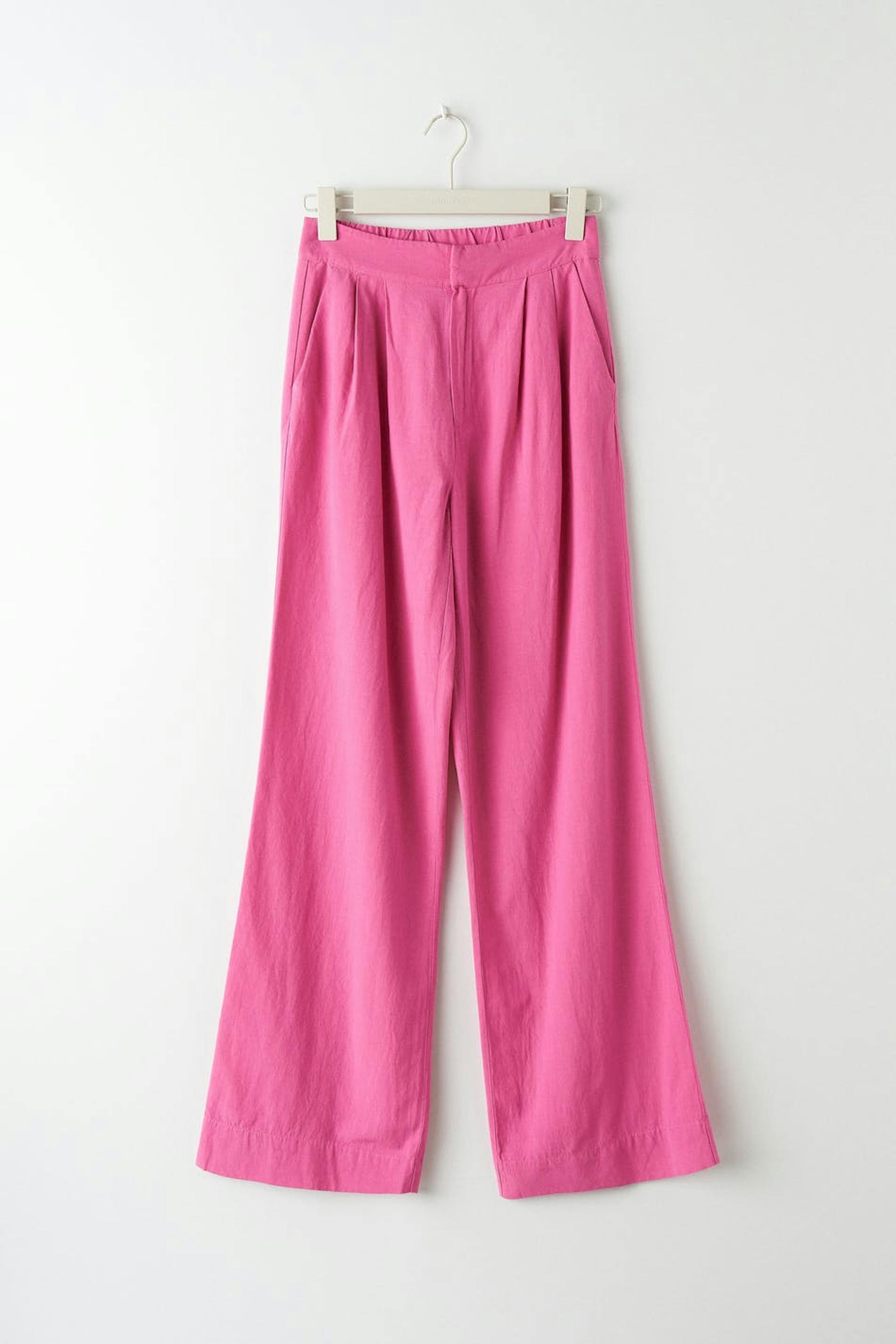 Housut vekeillä edessä. Housut ovat pinkkejä ja niissä on suora, löysä istuvuus. Niissä on sivutaskut, kuminauha vyötärön takaosassa ja pellava-look.