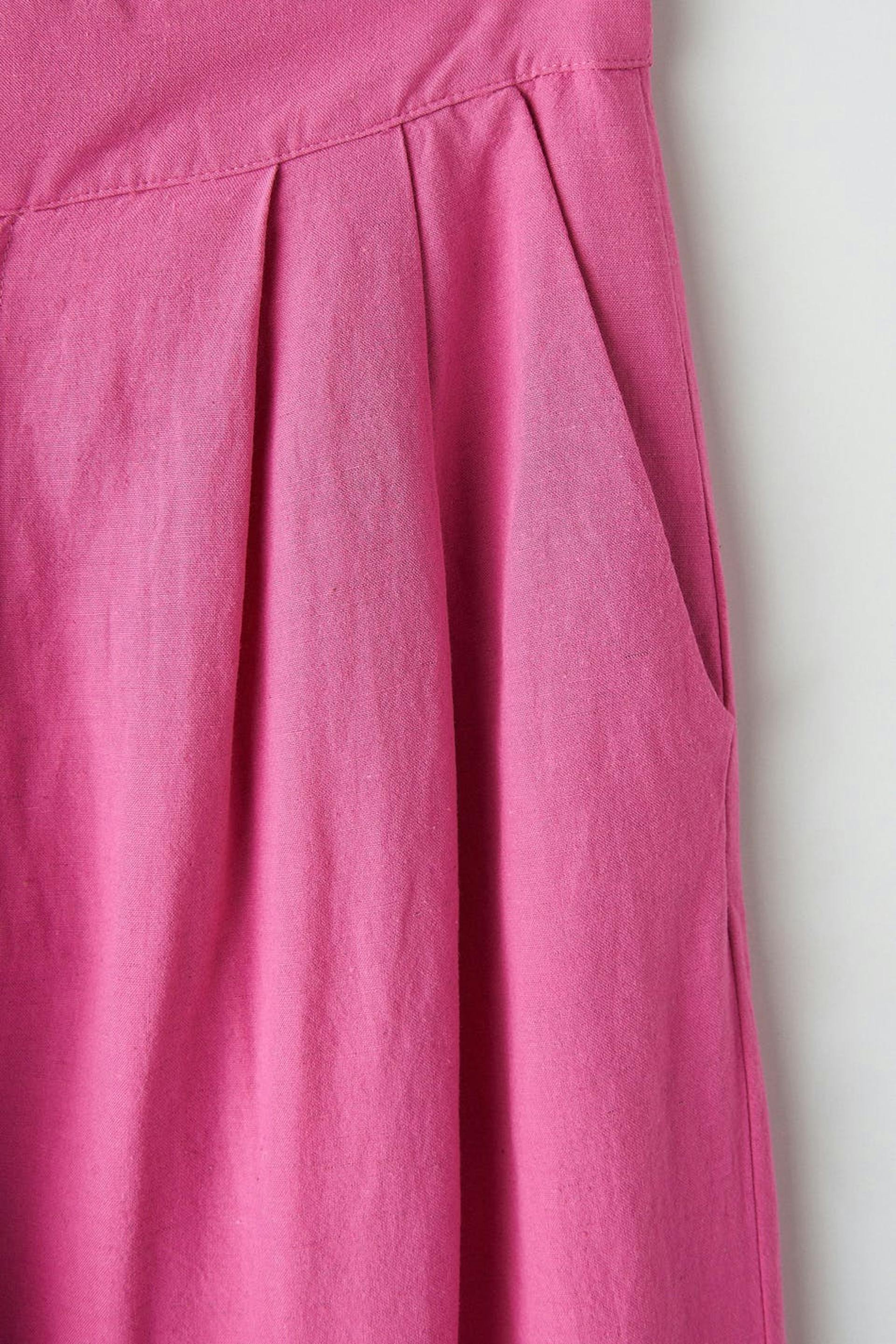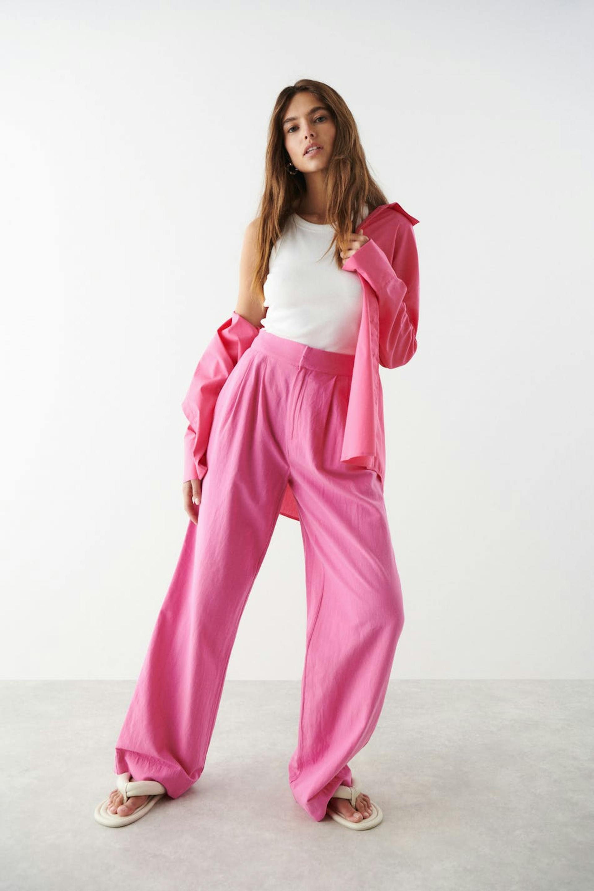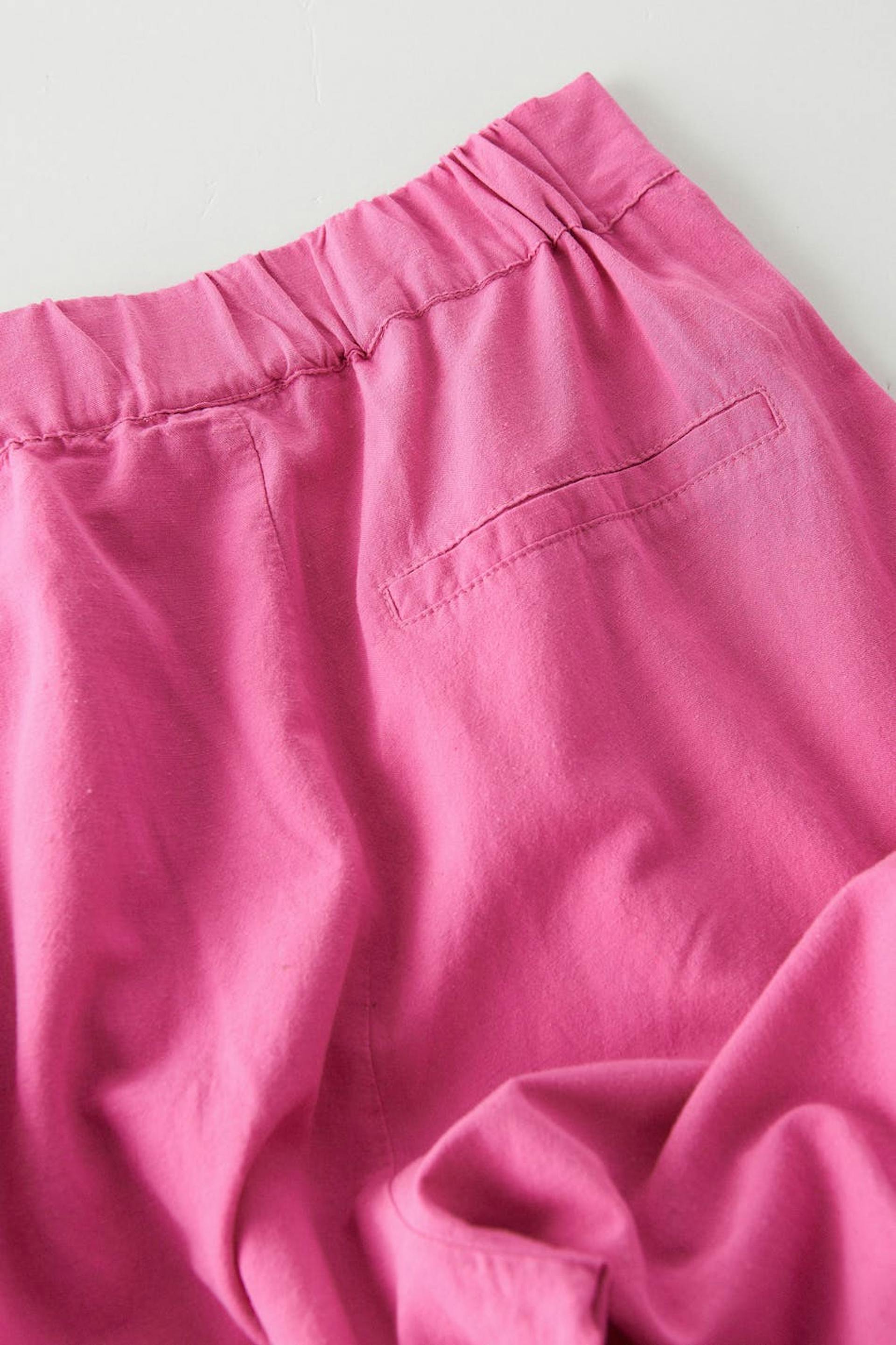 Housut vekeillä edessä. Housut ovat pinkkejä ja niissä on suora, löysä istuvuus. Niissä on sivutaskut, kuminauha vyötärön takaosassa ja pellava-look.