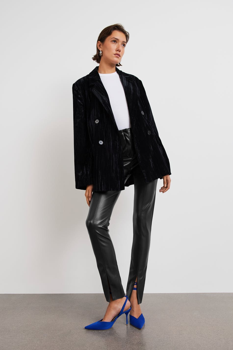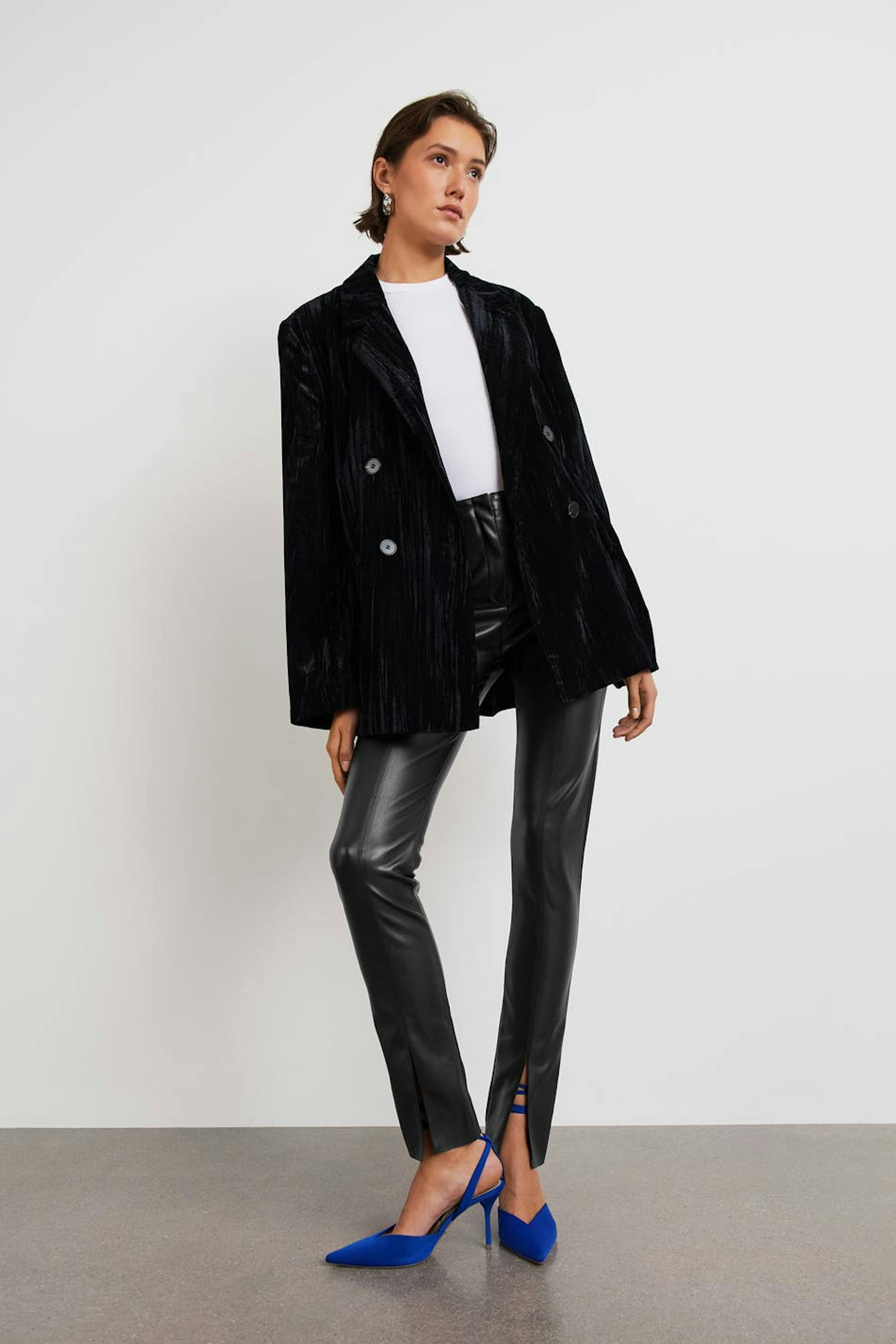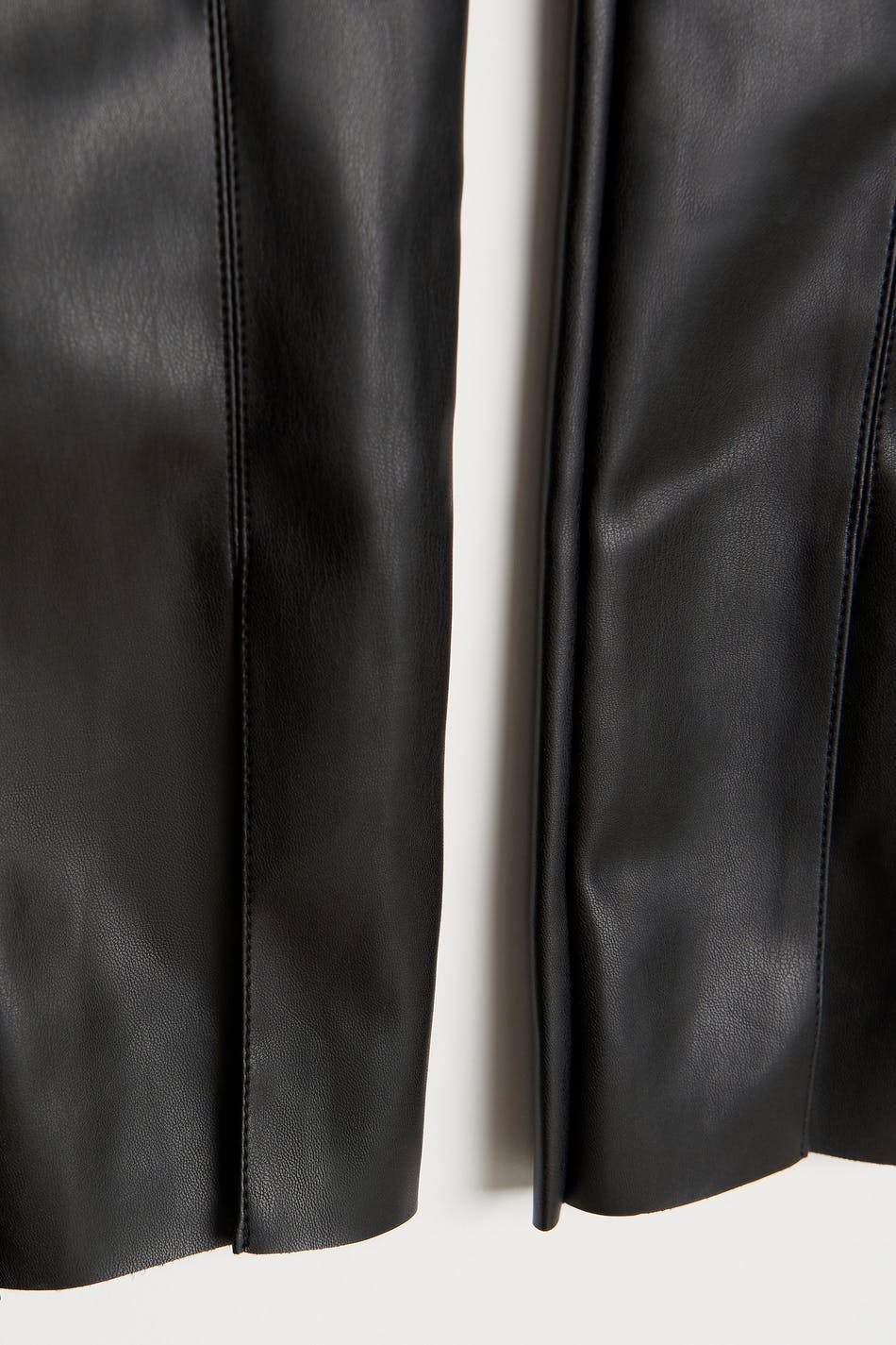 Keinonahkaat housut halkiolla lahkeiden lopuissa. Housut ovat mustia ja niissä on saumayksityiskohdat edessä. Niissä on sepalus vetoketjulla.