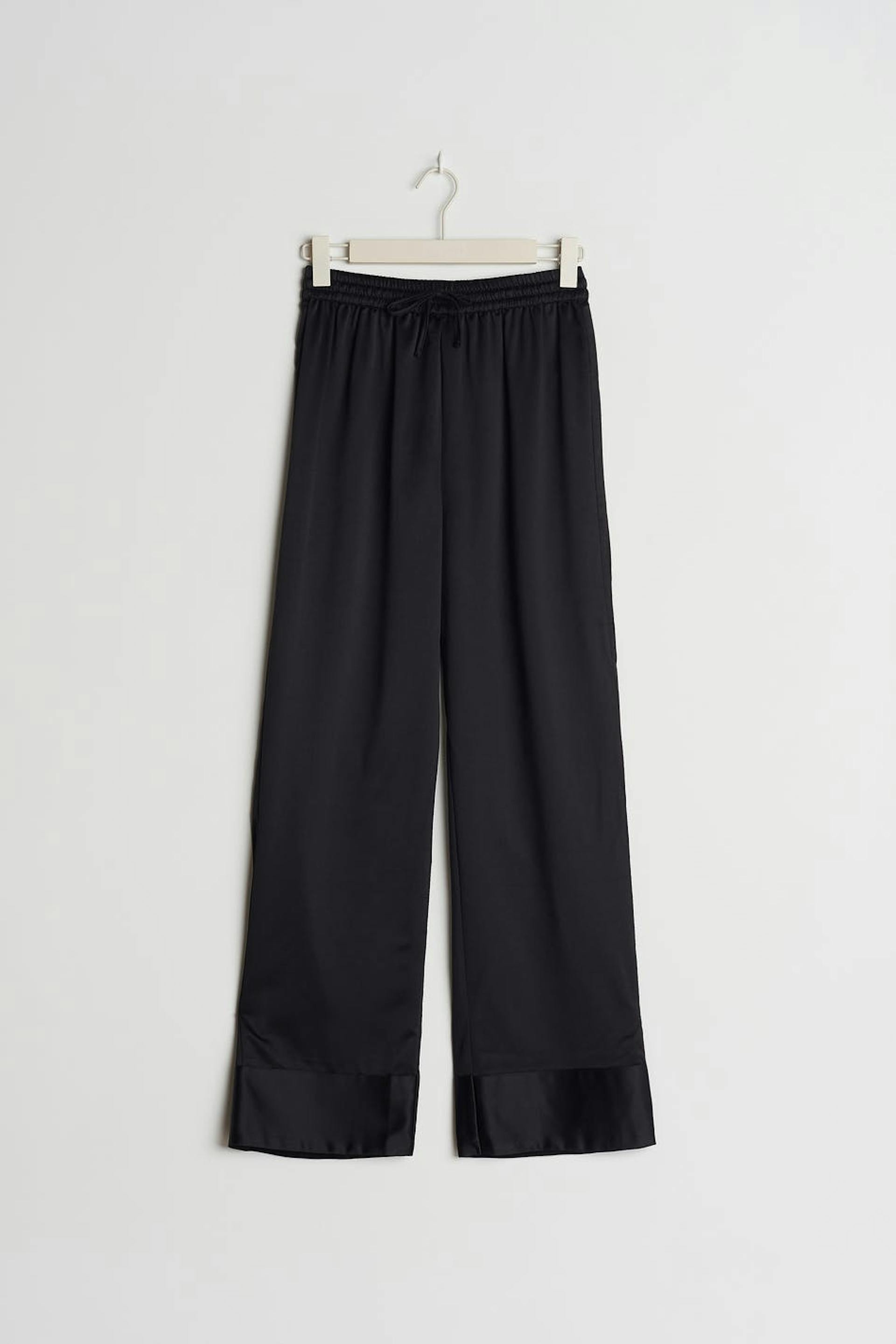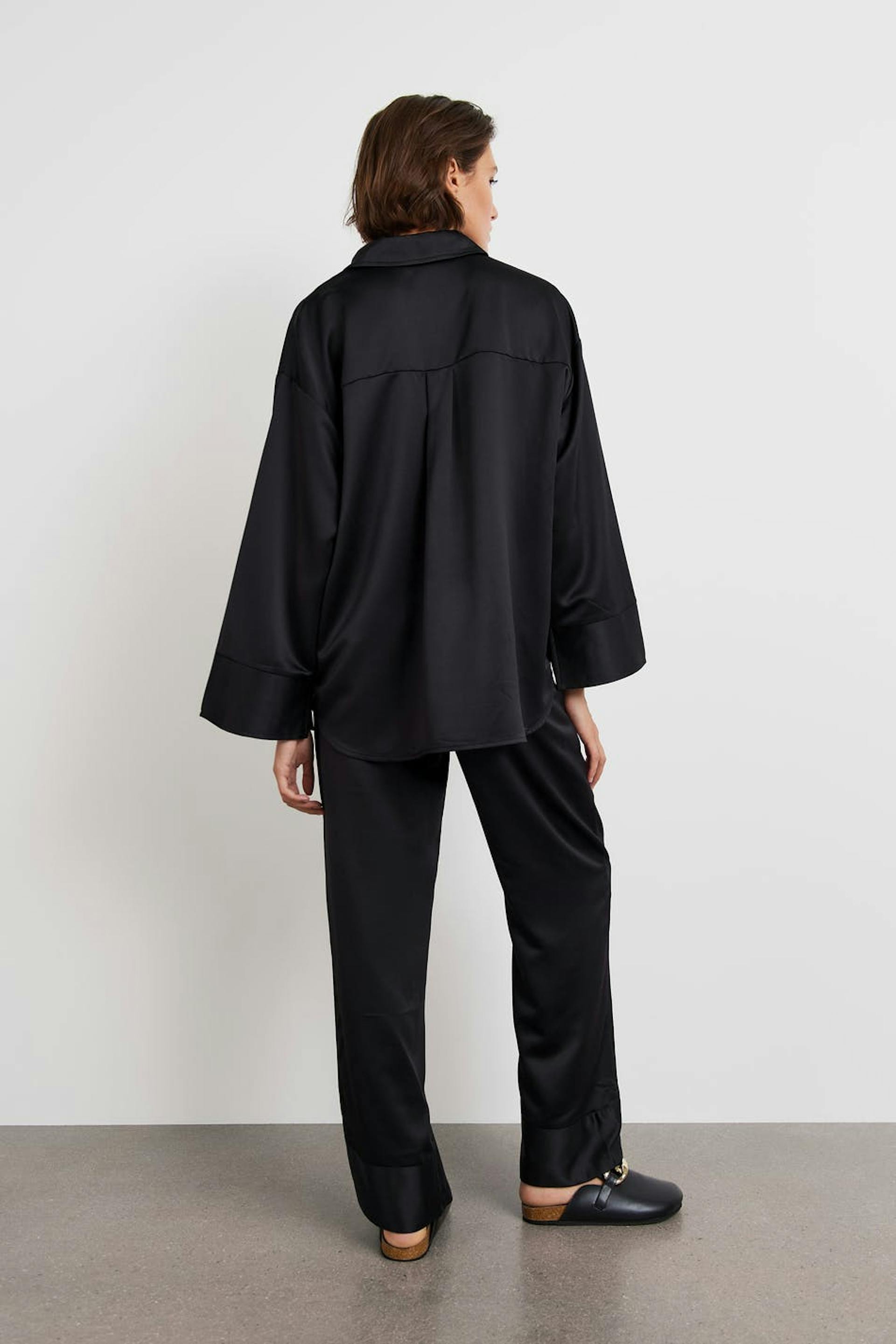 Oversize pyjamahousut satiinituntumalla. Pyjamahousut ovat mustia ja niissä on leveät lahkeet. Niissä on elastinen kiristysnyöri vyötäröllä ja korkeat hihansuut lahkeiden lopuissa.