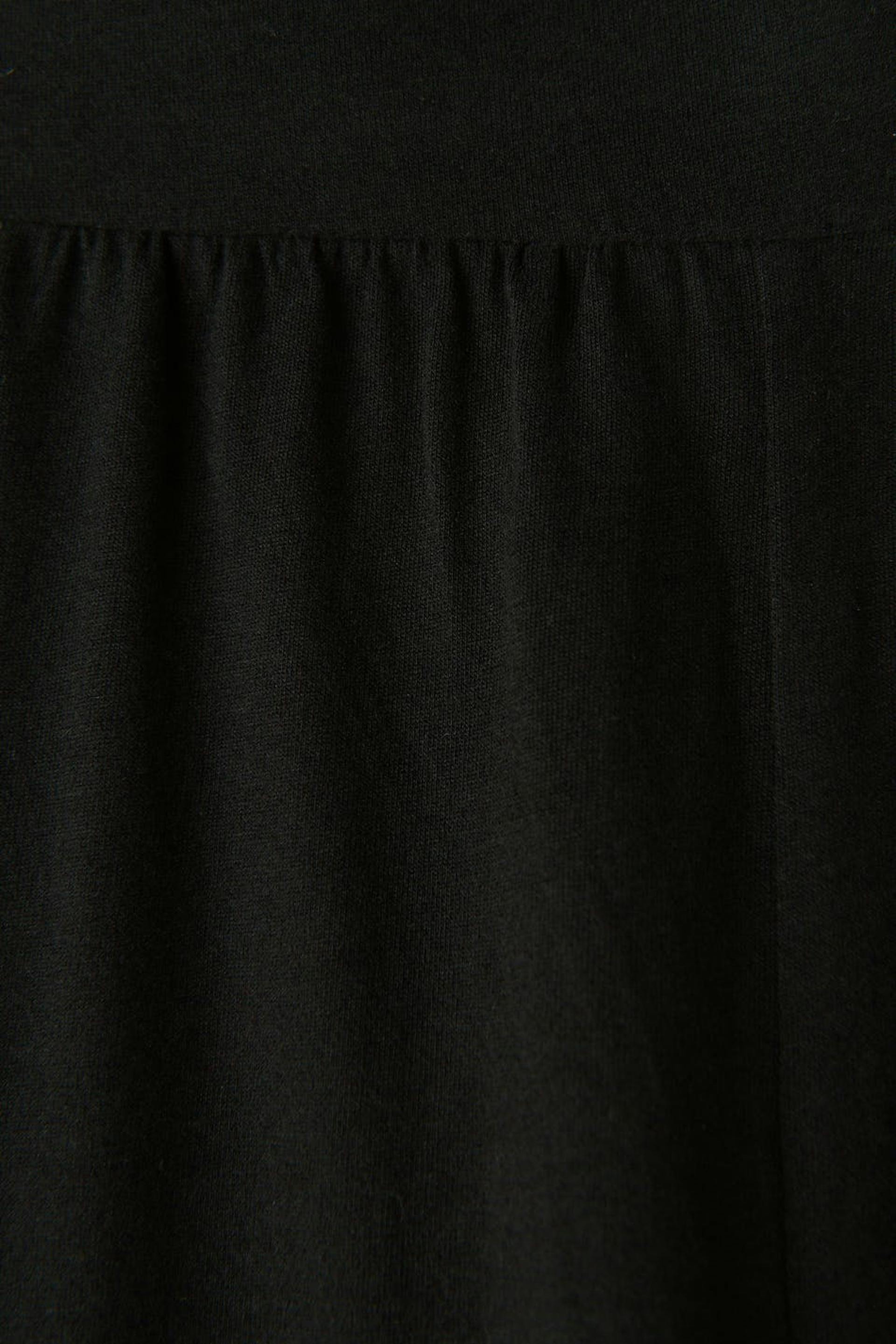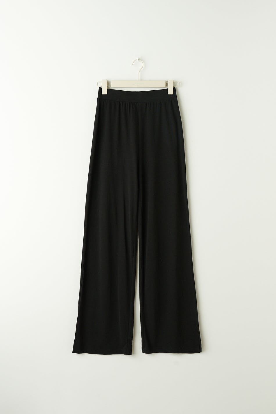 Collegehousut pehmeästä laadusta korkealla vyötäröllä. Housut ovat mustia ja niissä on leveät lahkeet. Niissä on halkio alhaalla ja kuminauha vyötäröllä.