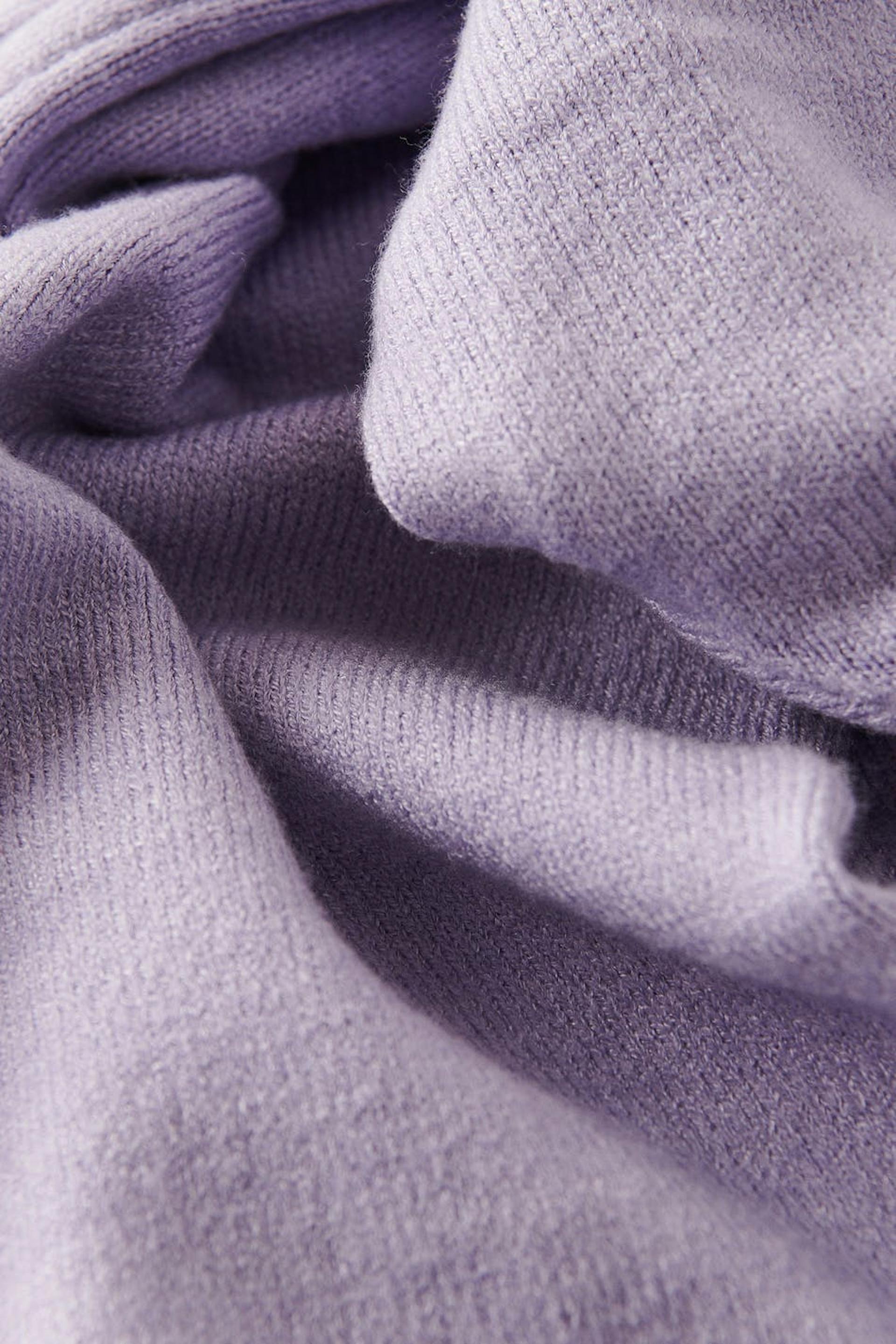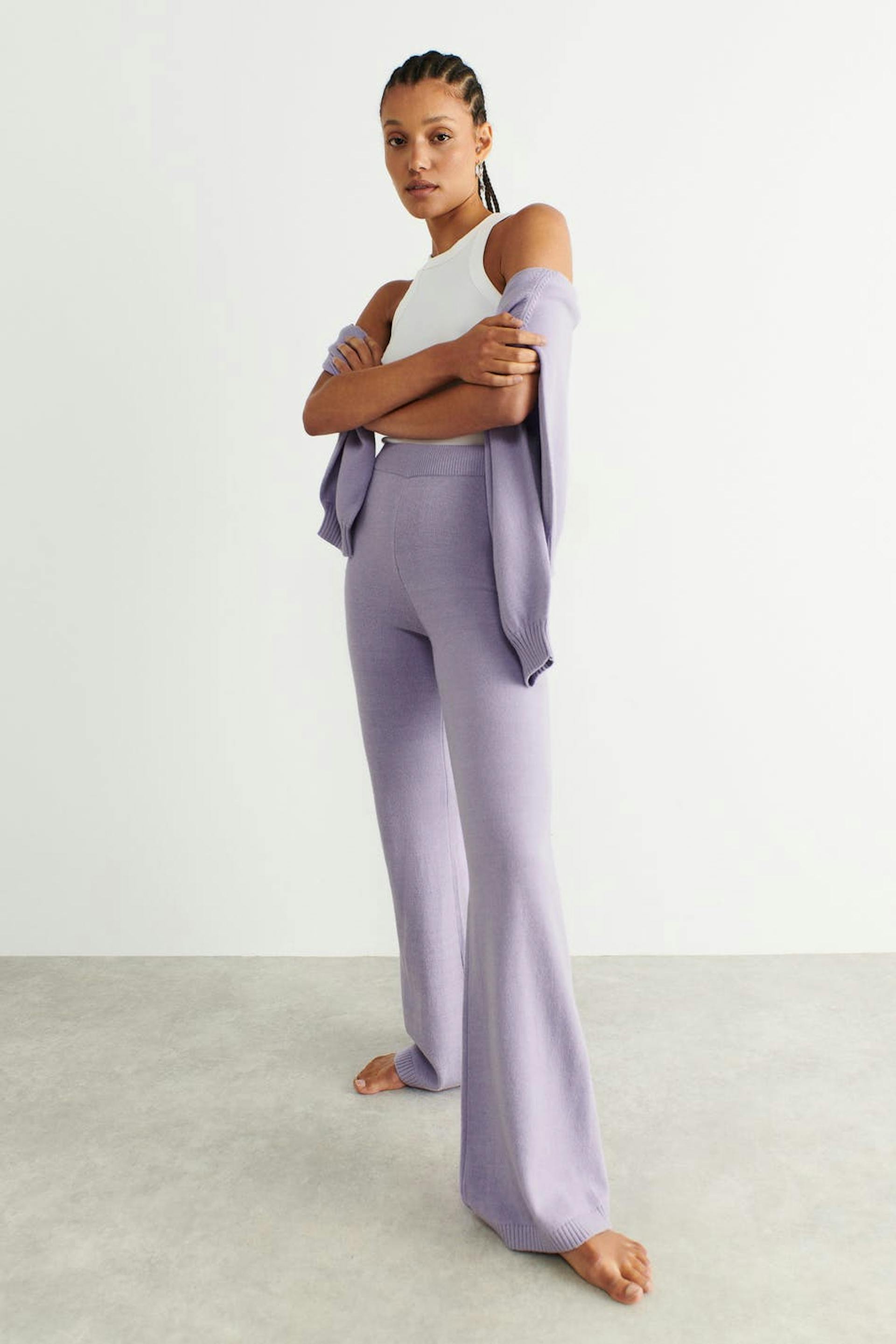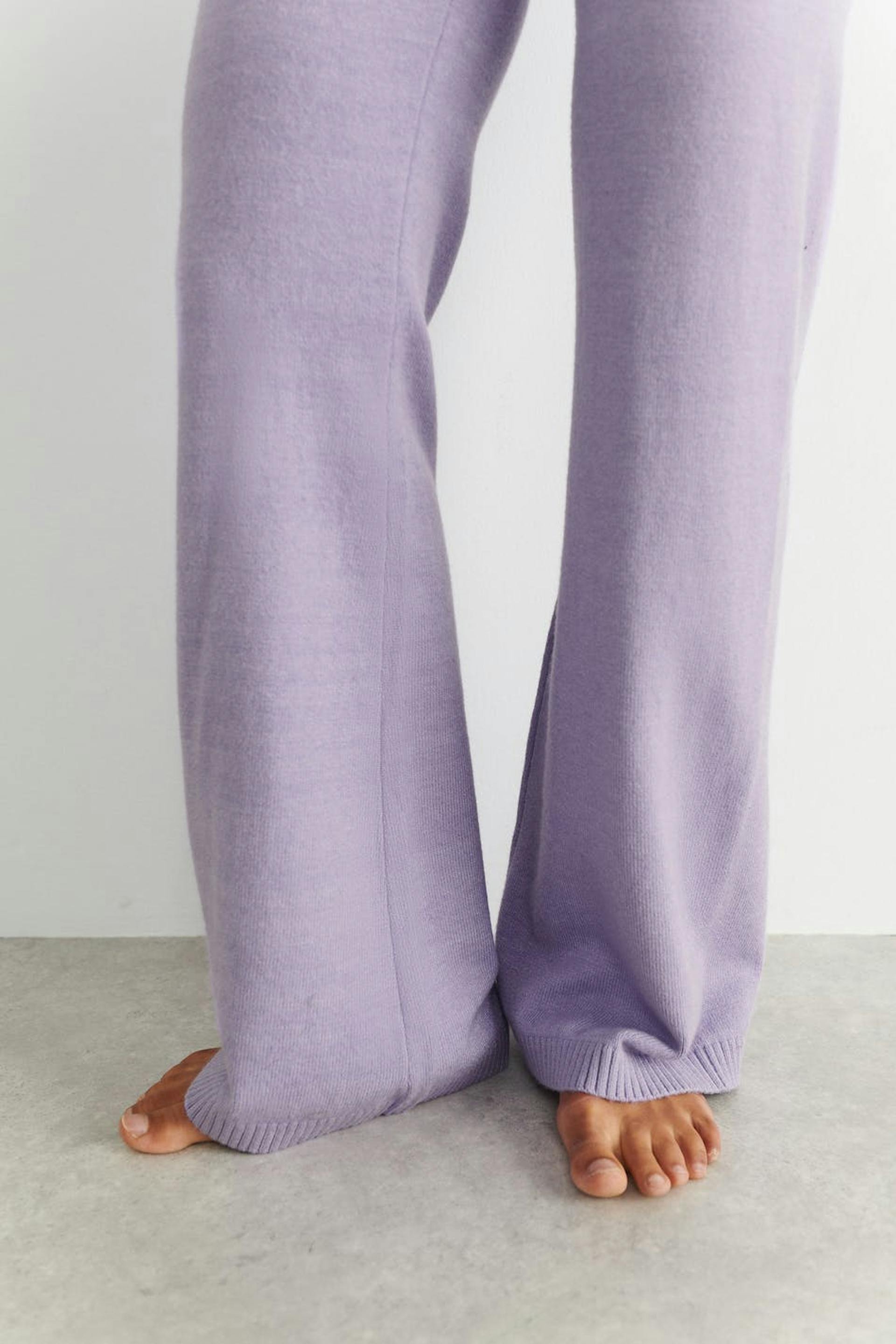 Pehmeästi kudotut housut vartalonmyötäisellä vyötäröllä. Housut ovat liiloja ja niissä on flare-lahkeet väljällä mallilla. Niissä on resorihelma ja kuminauha vyötäröllä.
