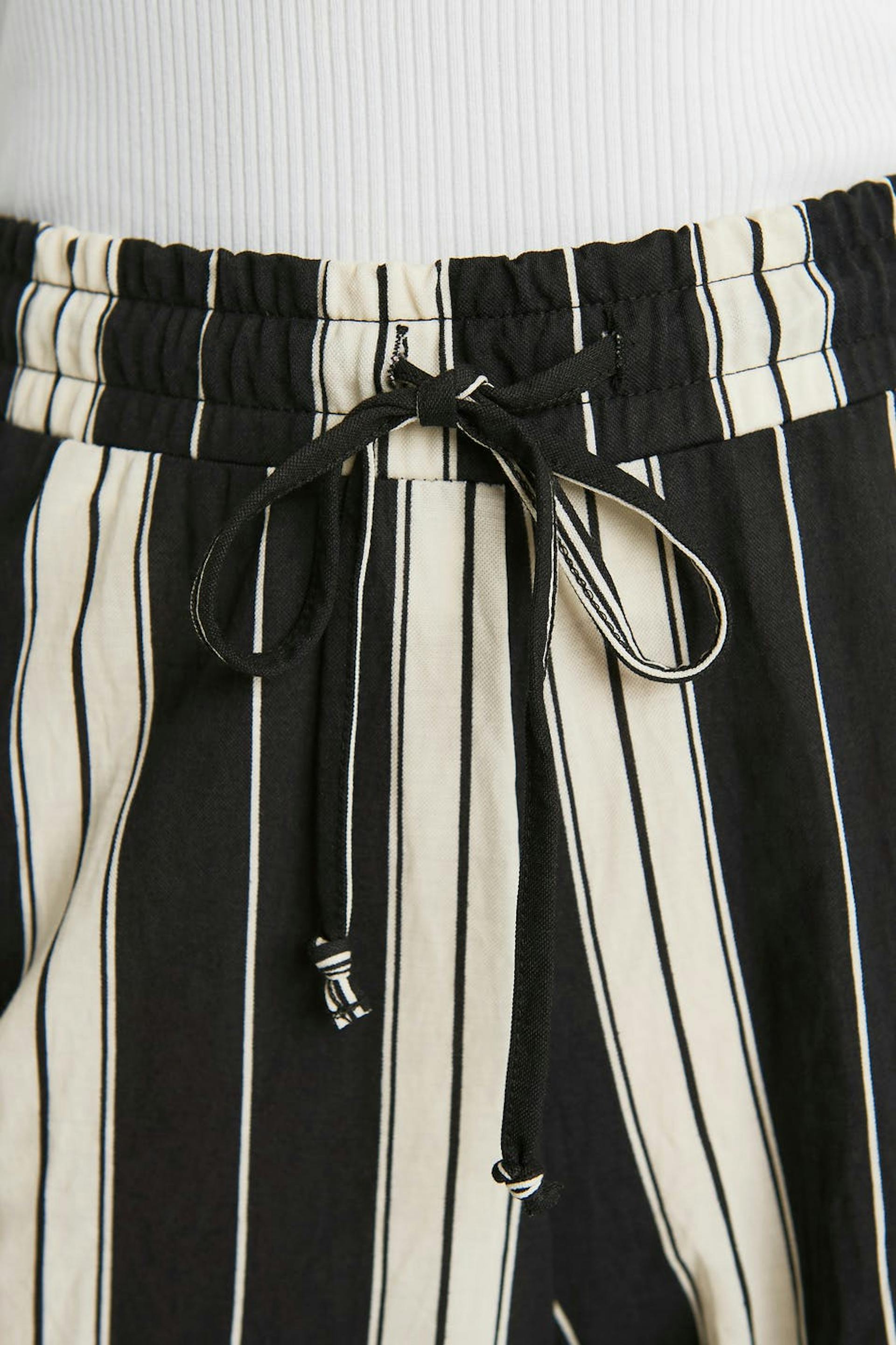 Raidallinen culottes leveillä housujen lahkeilla. Culottes on musta ja valkoinen ja siinä on vyötärö kuminauhasta kiristysnyörillä. Se valmistetaan trikoosta ja siinä on rento istuvuus.