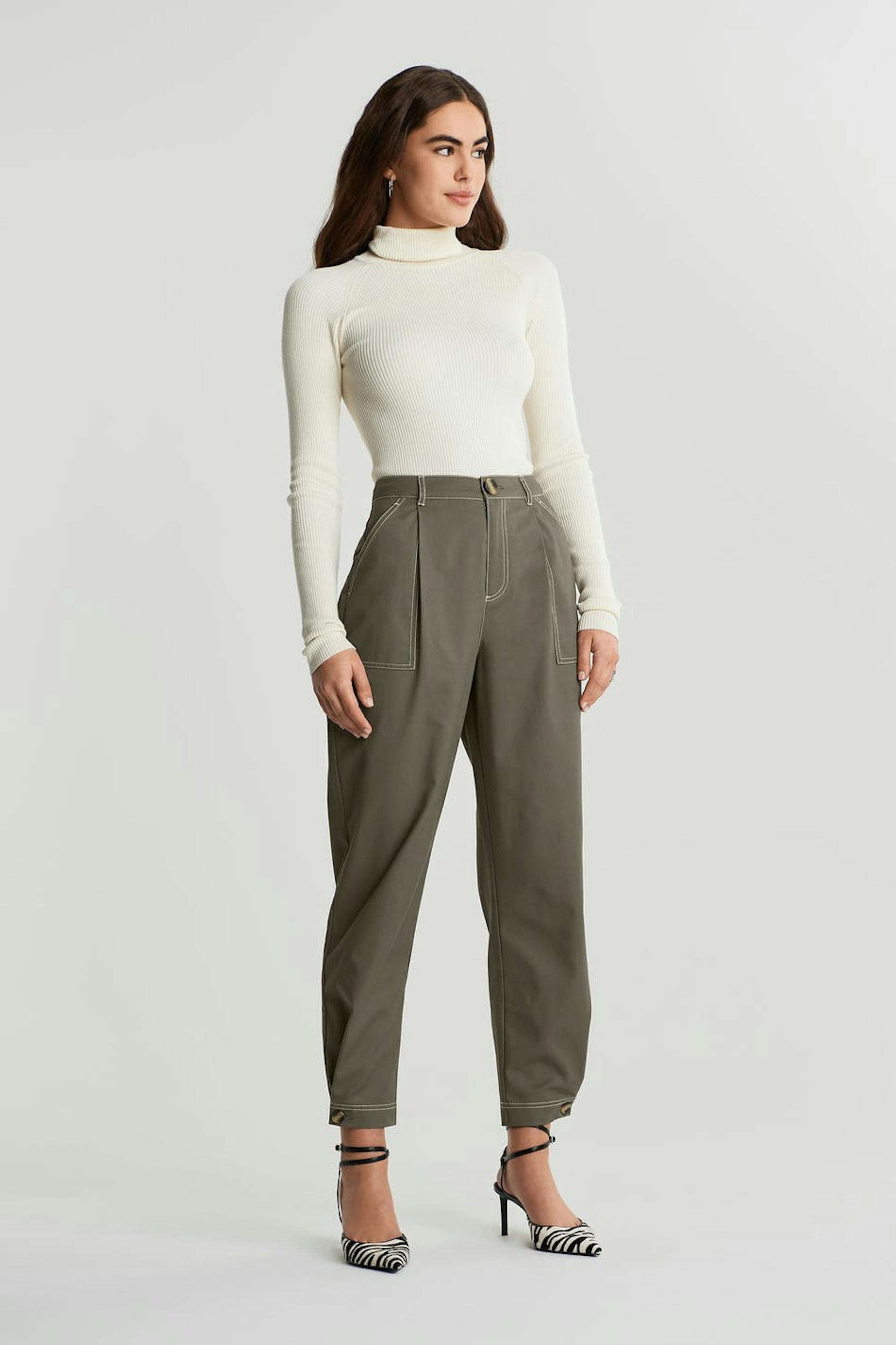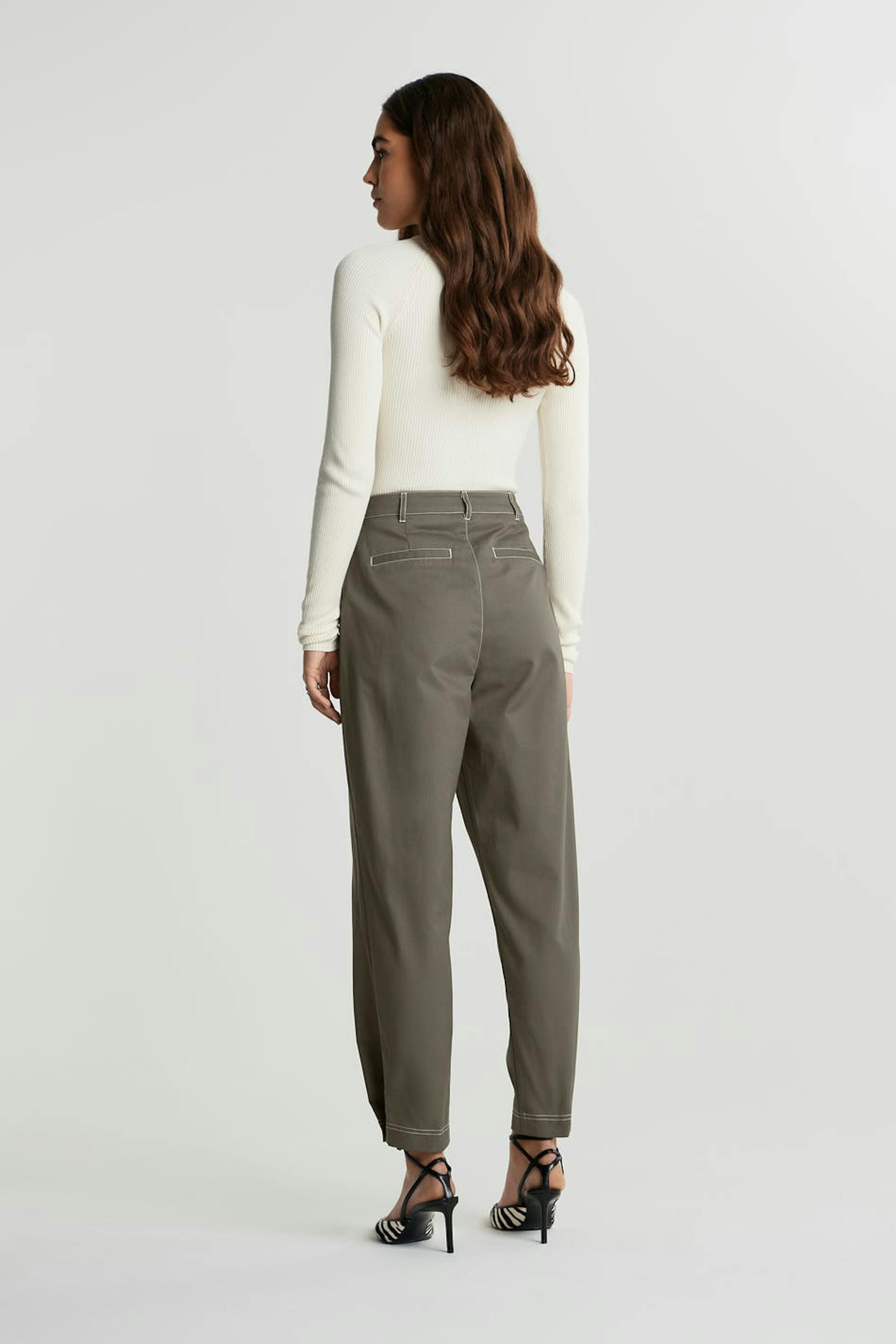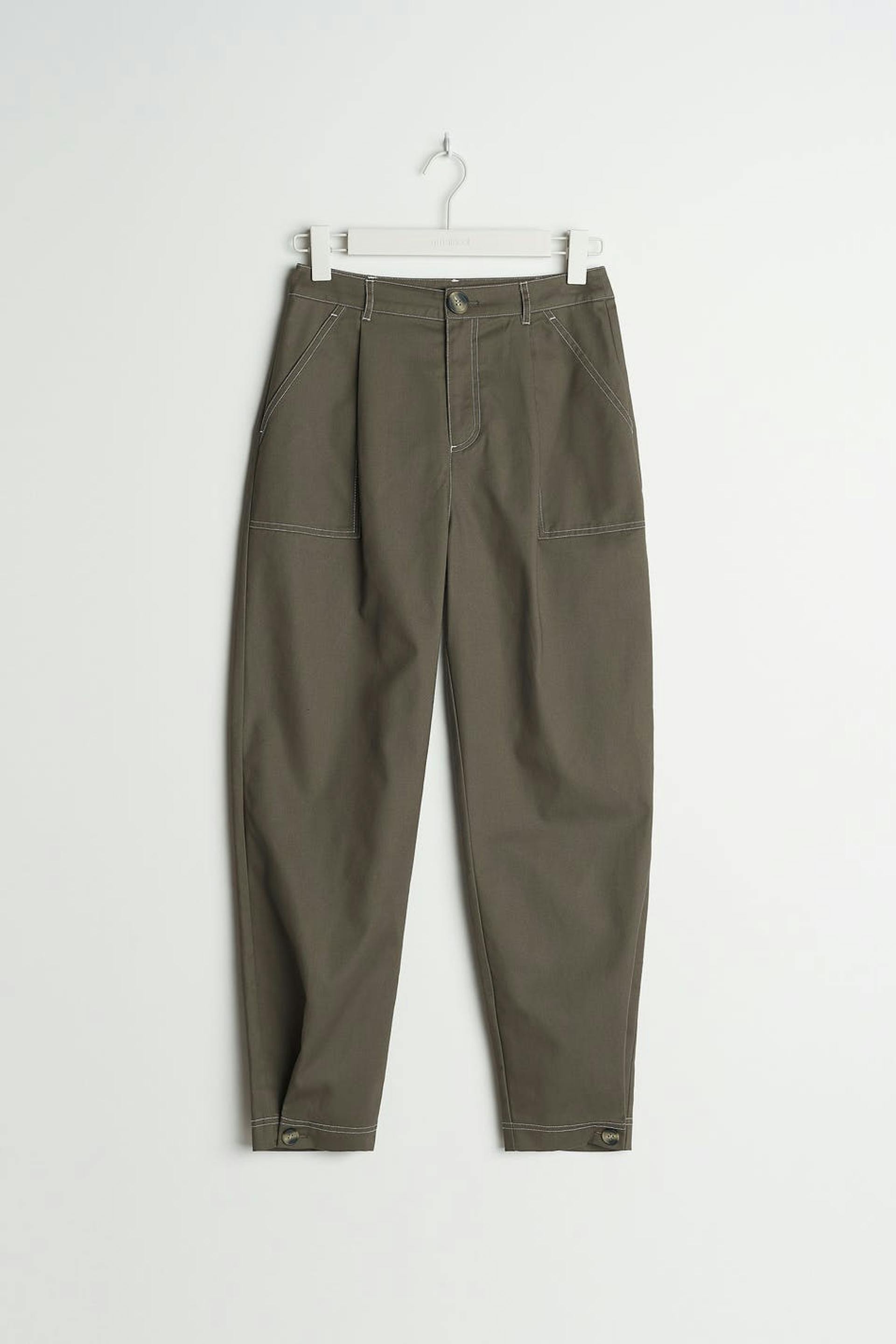 Housut cargo-muotoilulla. Housut ovat harmaita ja niissä on korkea vyötärö. Niissä on kapenevat lahkeet ja korostetut sivutaskut.