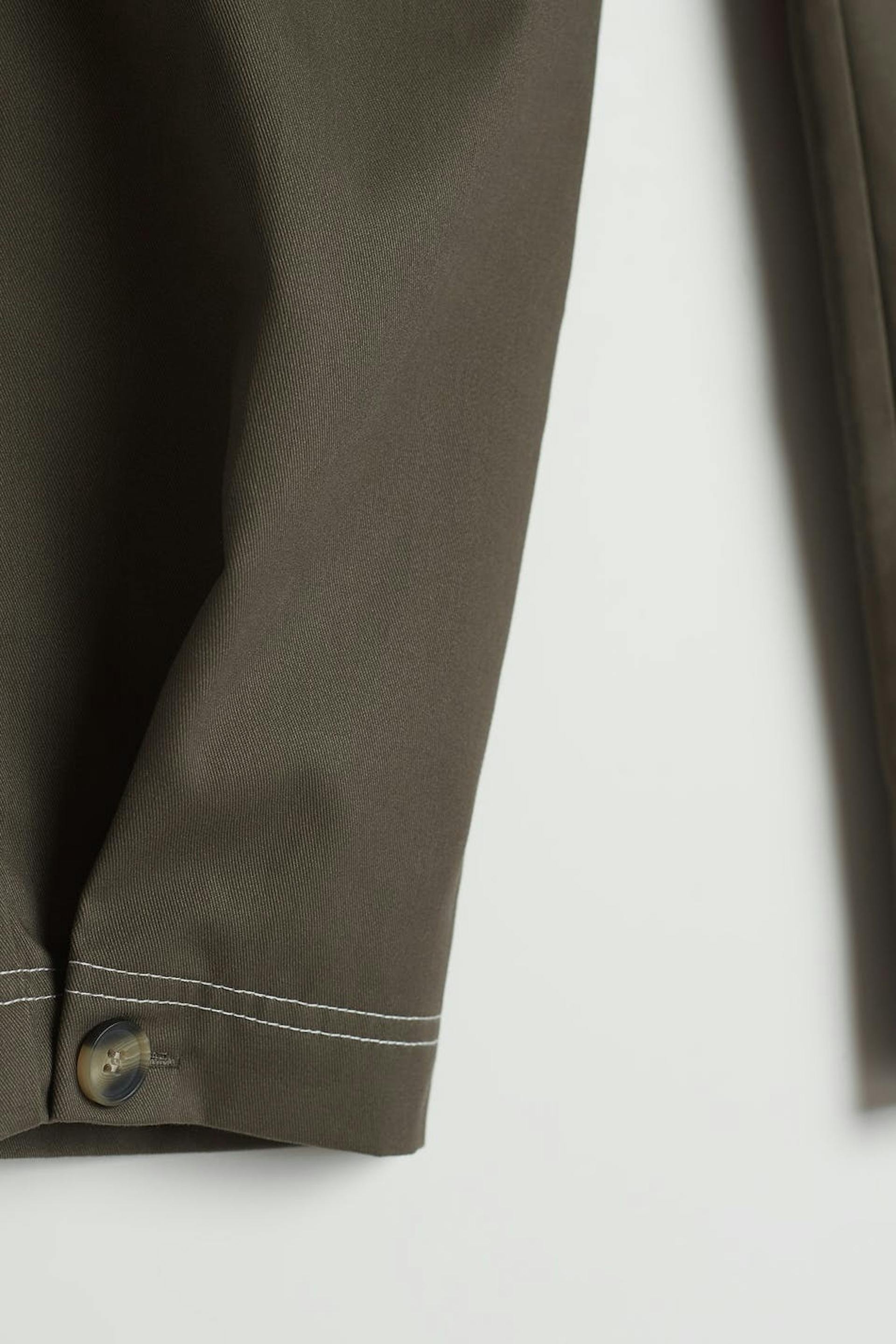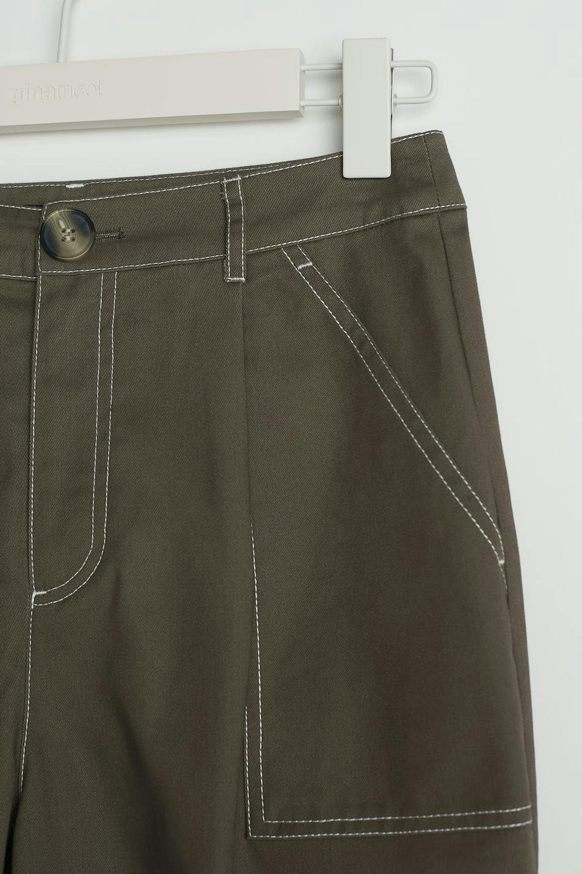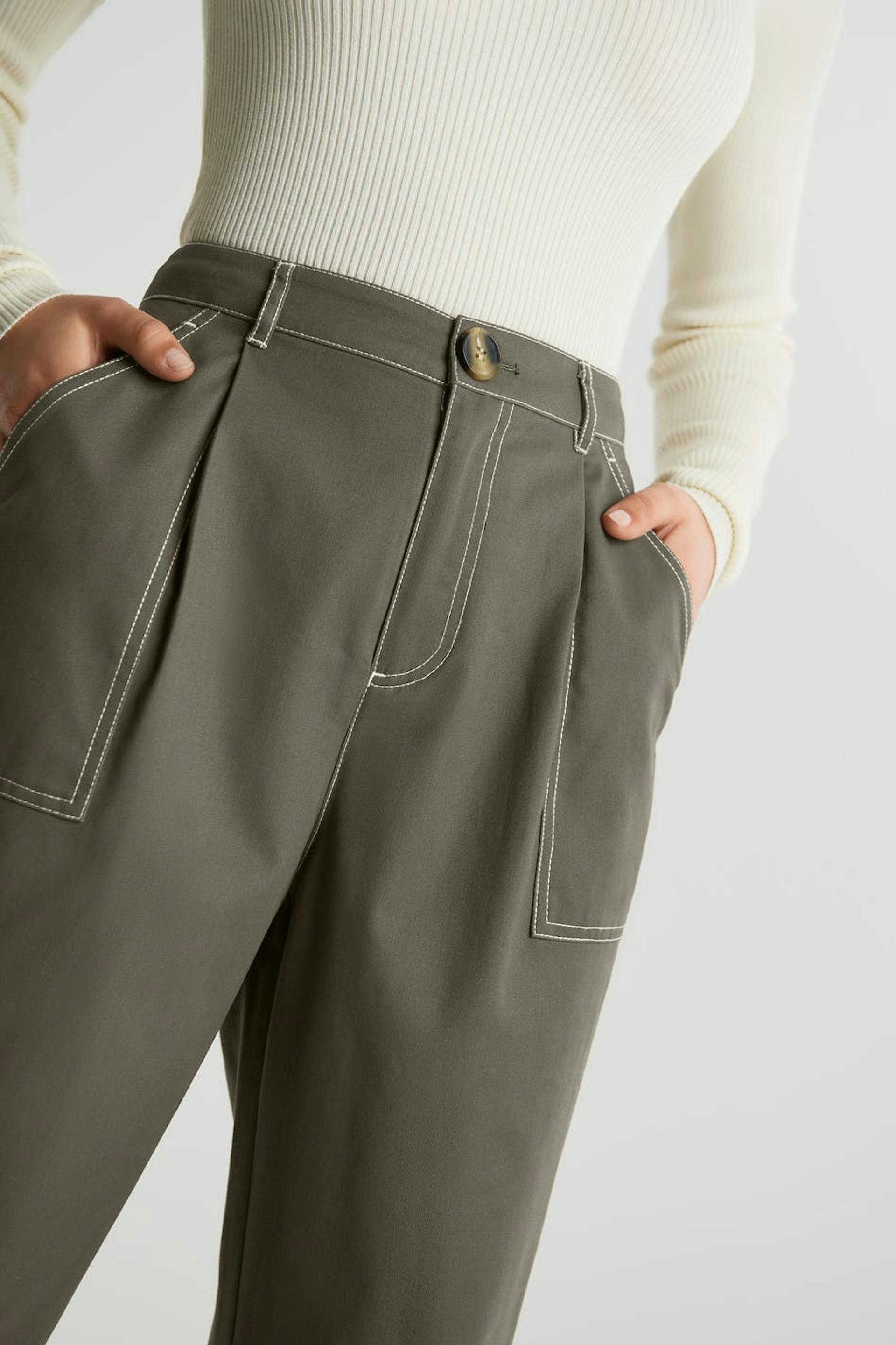Housut cargo-muotoilulla. Housut ovat harmaita ja niissä on korkea vyötärö. Niissä on kapenevat lahkeet ja korostetut sivutaskut.