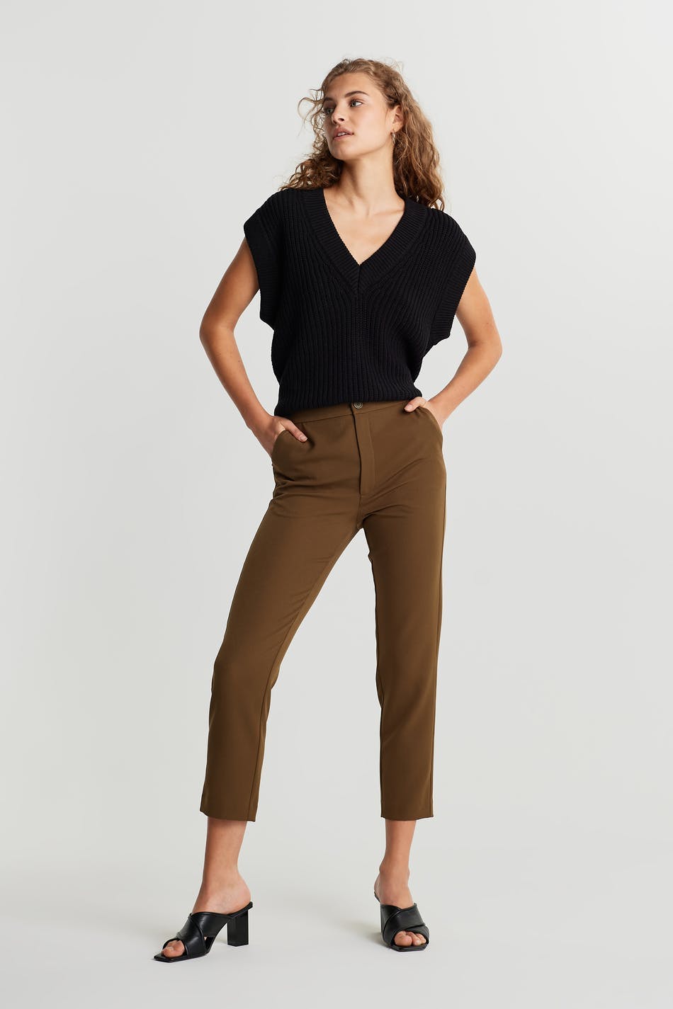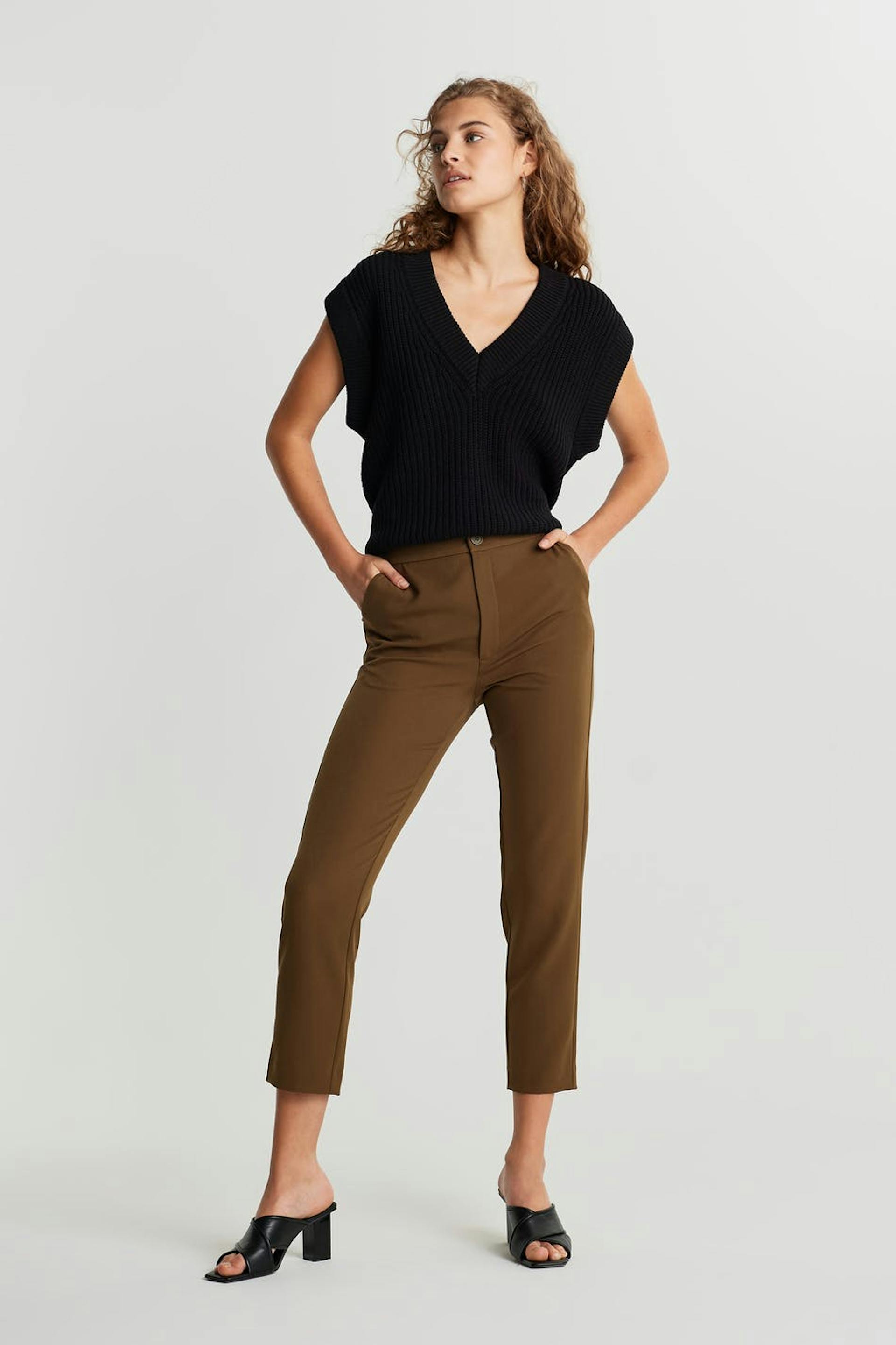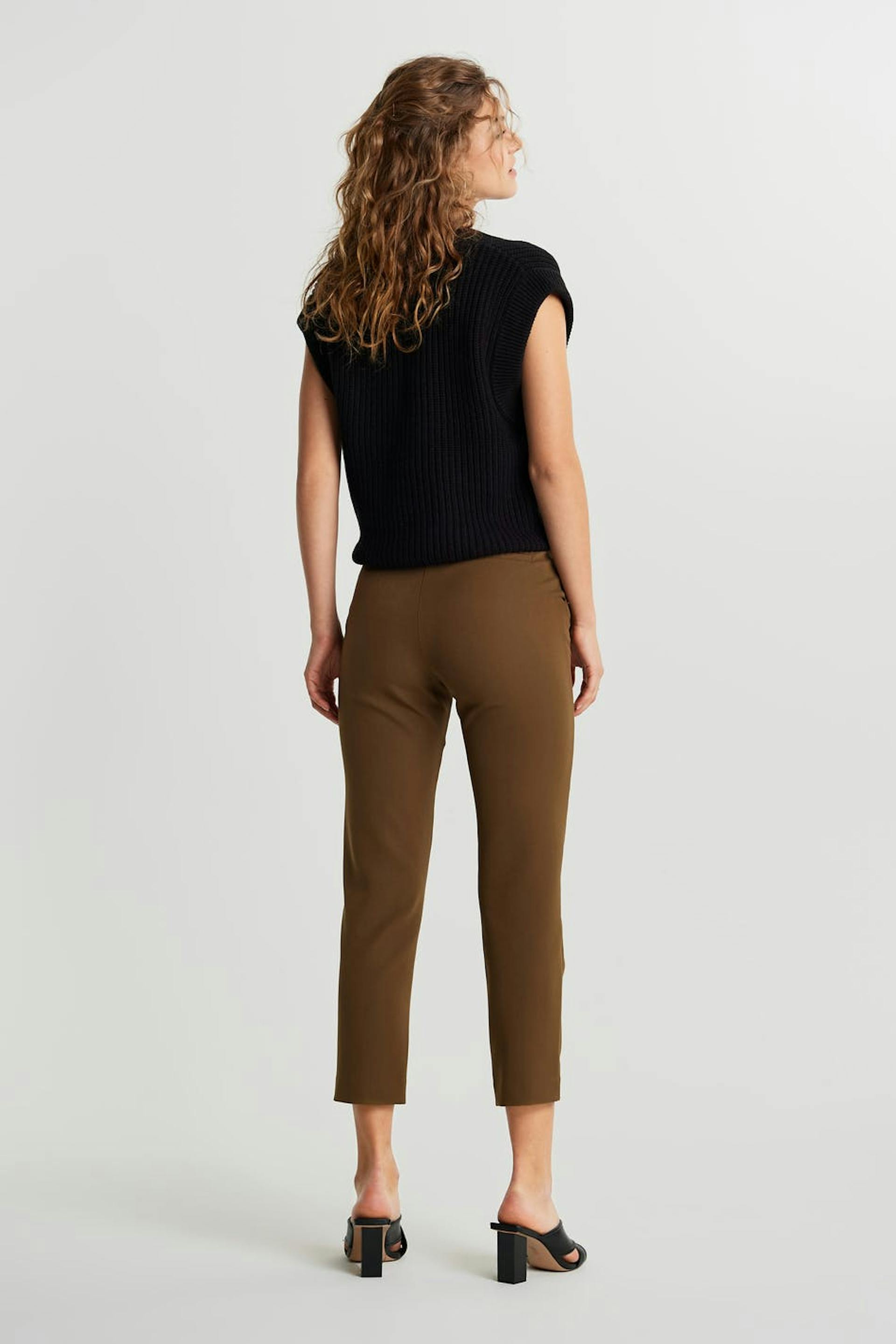 Suorat housut slim-leikkauksella. Housut ovat ruskeita ja niissä on korkea vyötärö. Niissä on lyhyemmät jalat.