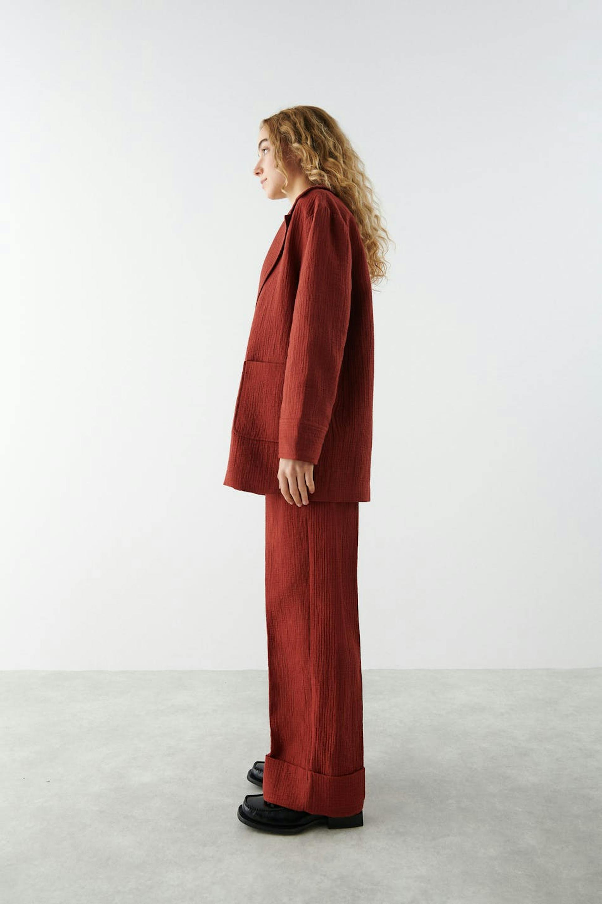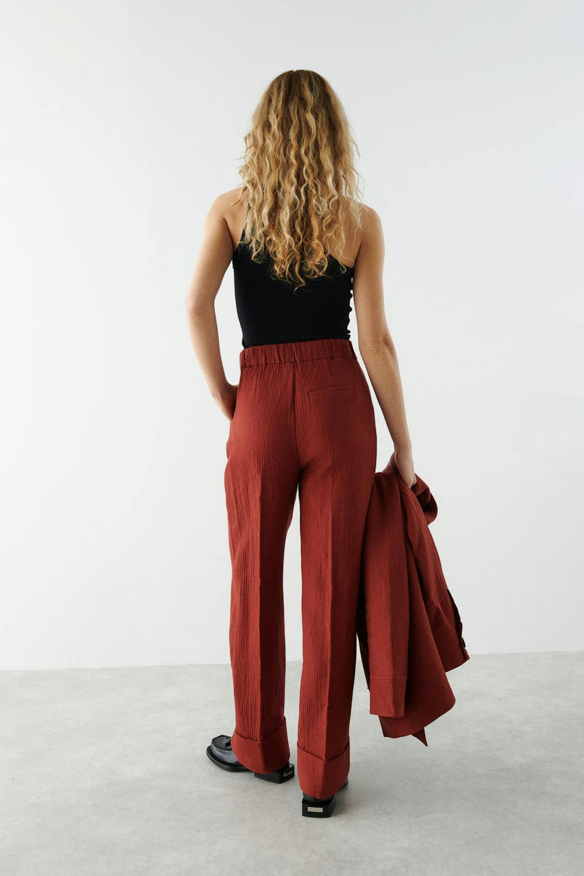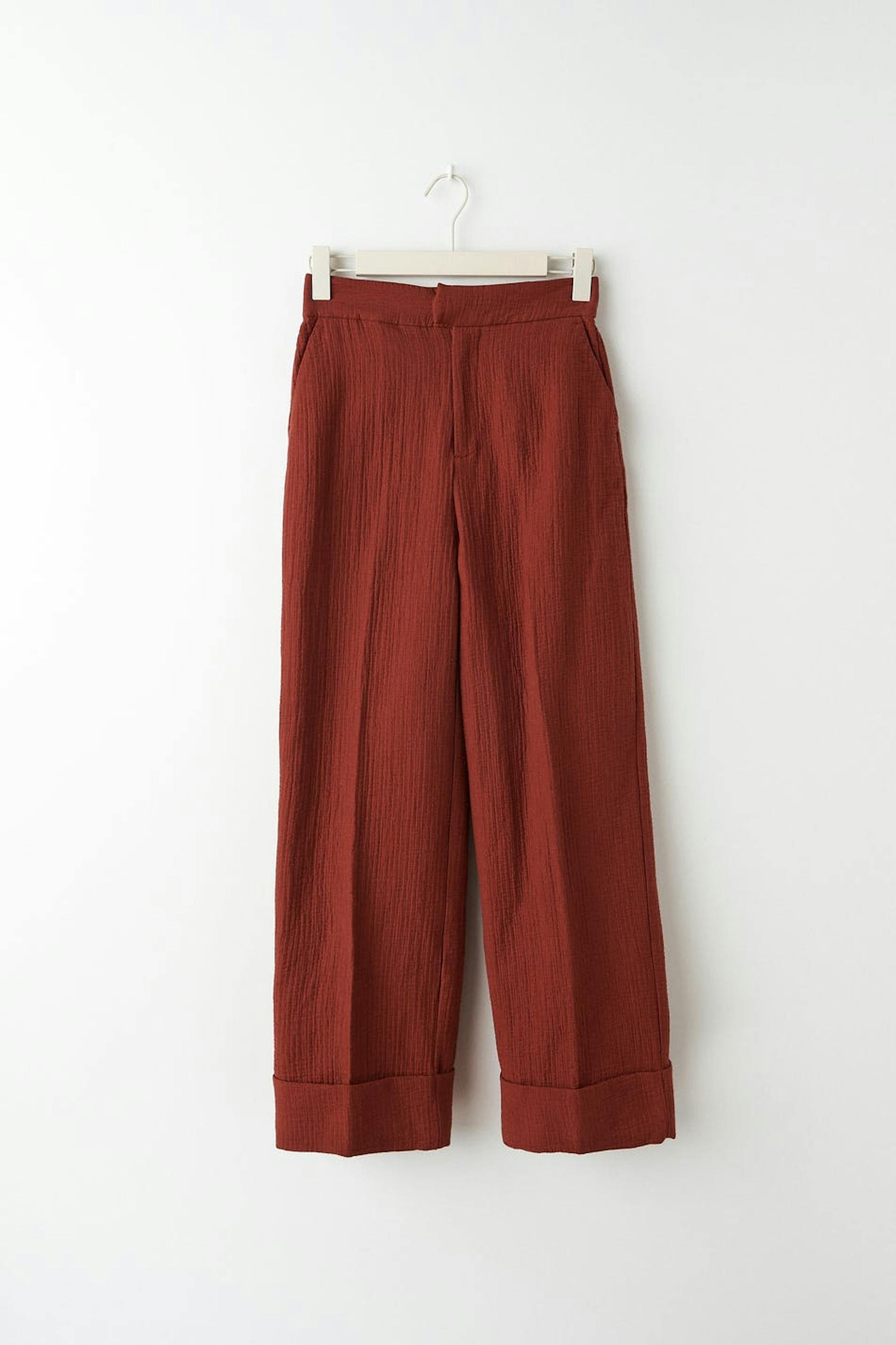 Leveät puvunhousut korkealla vyötäröllä. Housut ovat punaisia ja niissä on laskokset edessä ja takana. Niissä on taskut sivuissa, viiltotasku takana, kuminauha vyötärön takaosassa ja korkeat hihansuut lahkeiden lopuissa.
