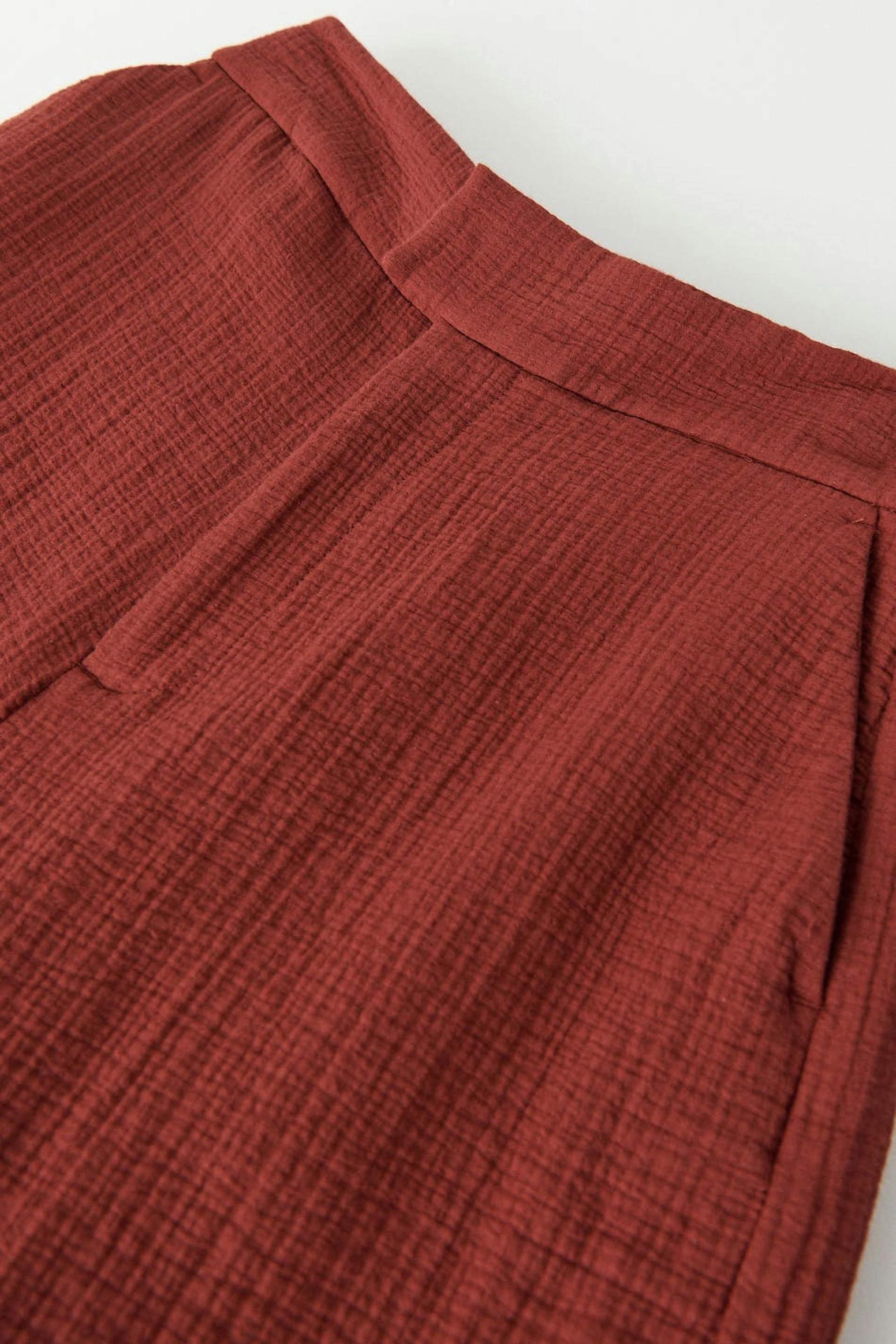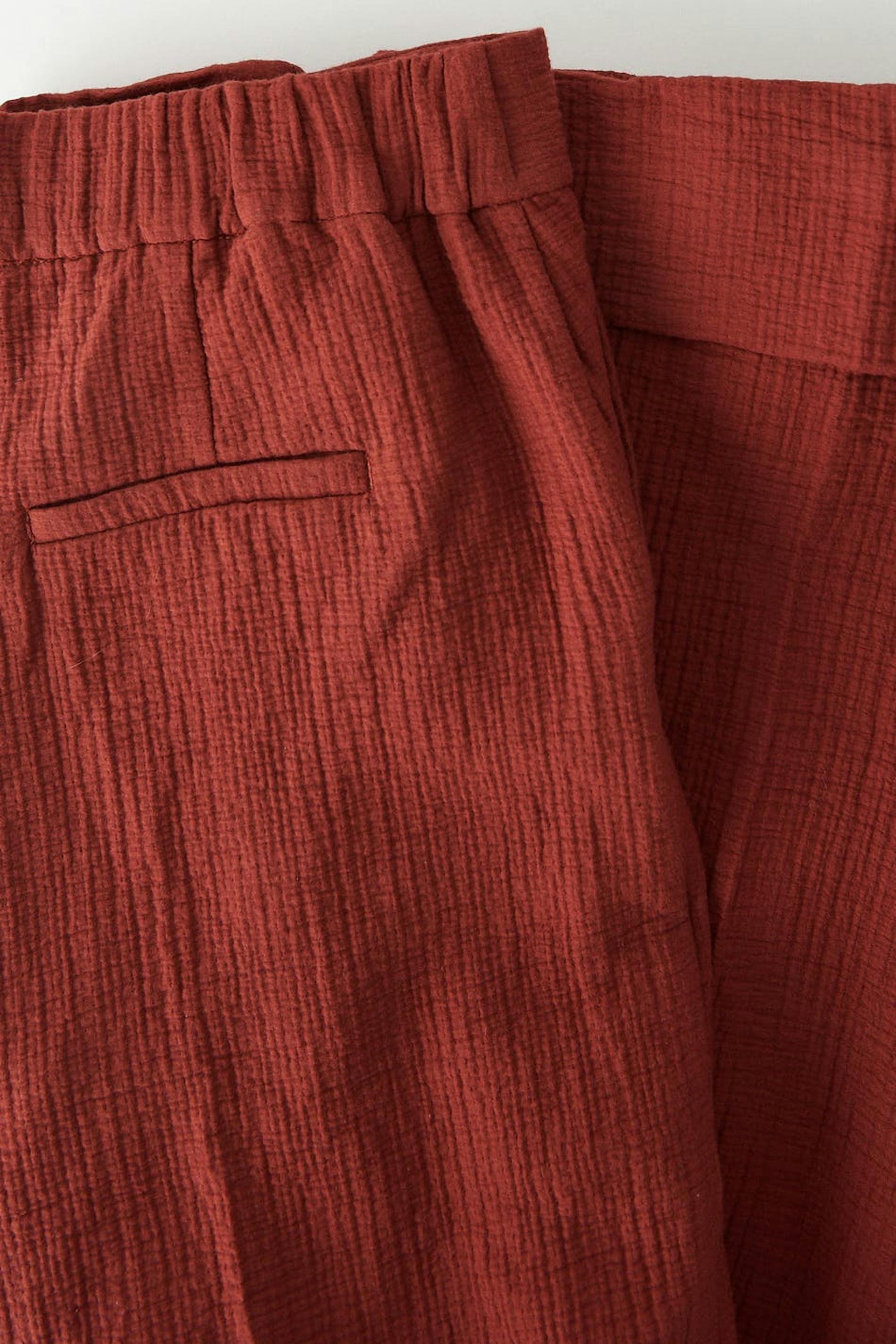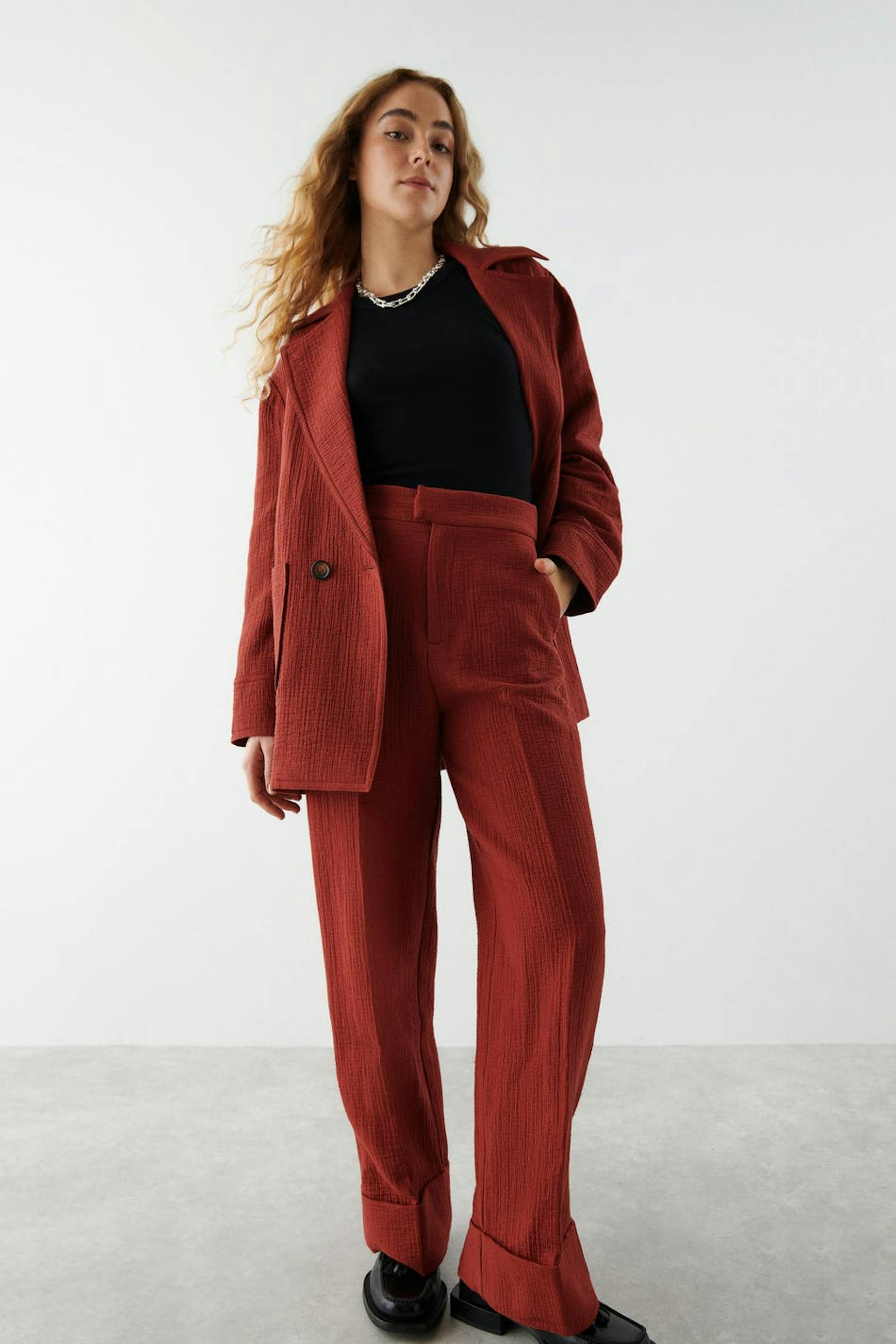 Leveät puvunhousut korkealla vyötäröllä. Housut ovat punaisia ja niissä on laskokset edessä ja takana. Niissä on taskut sivuissa, viiltotasku takana, kuminauha vyötärön takaosassa ja korkeat hihansuut lahkeiden lopuissa.