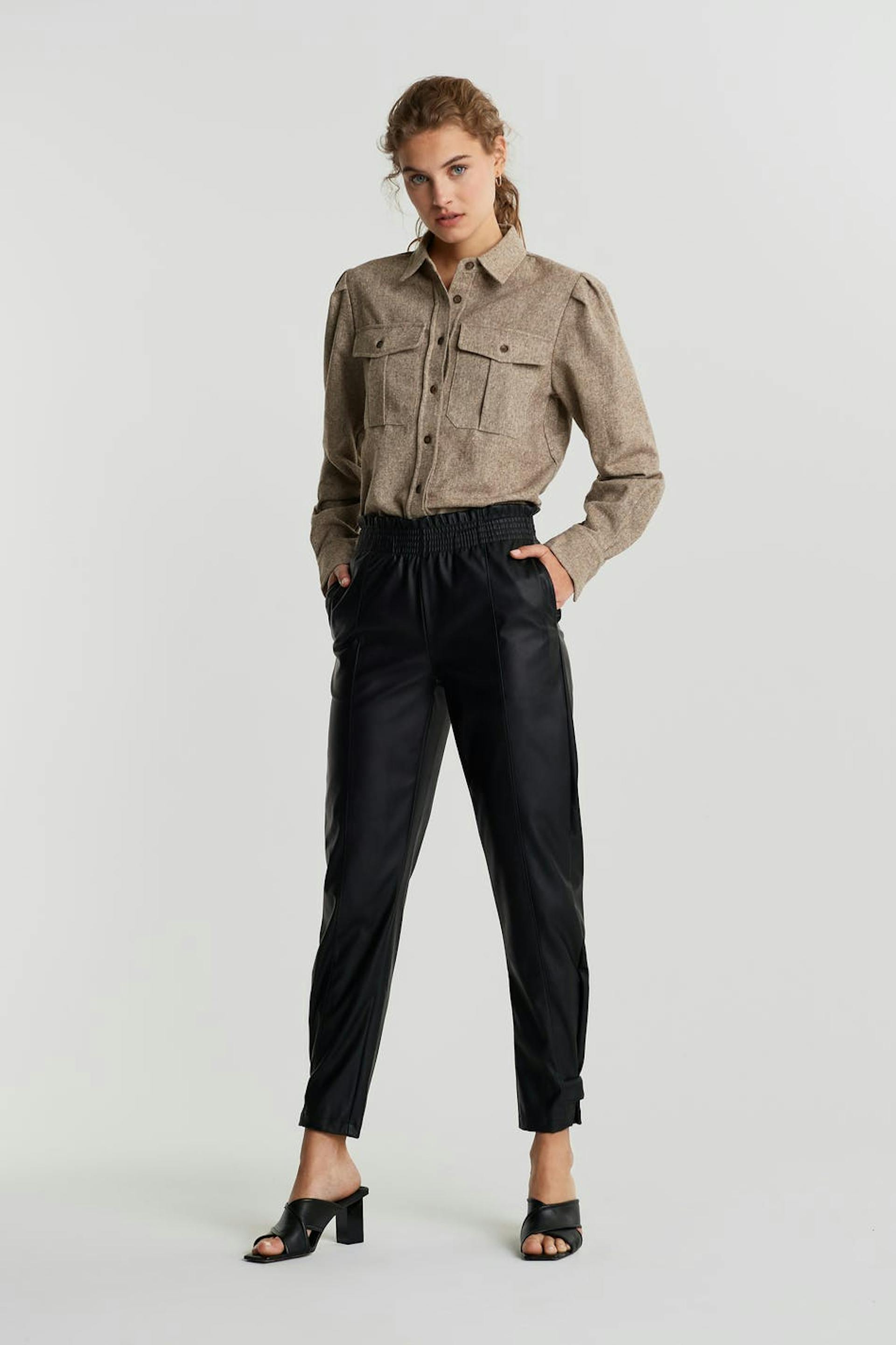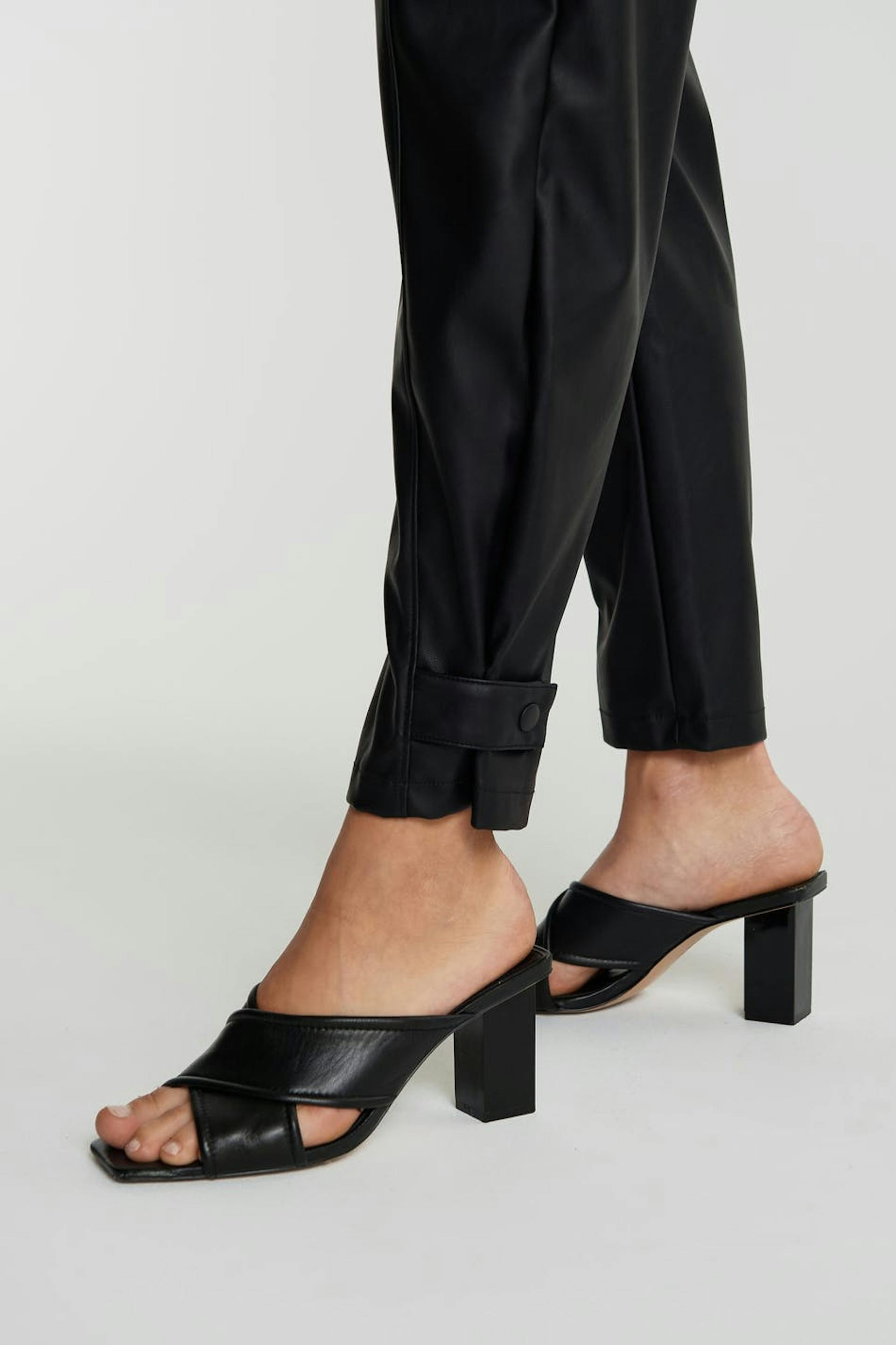 Housut normaalilla leikkauksella. Housut ovat mustia ja niissä on joustonauha vyötäröllä. Ne valmistetaan tekonahasta ja niissä on koristeelliset saumat ja napituslista jalkojen päissä.