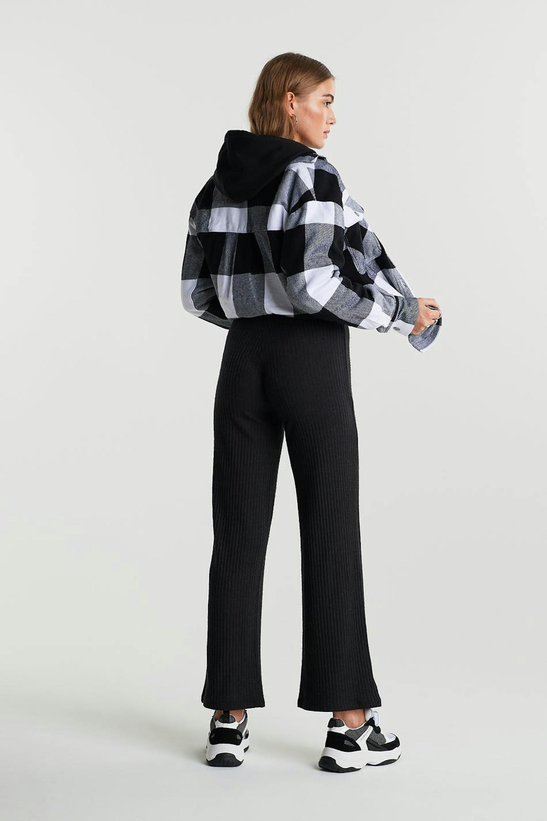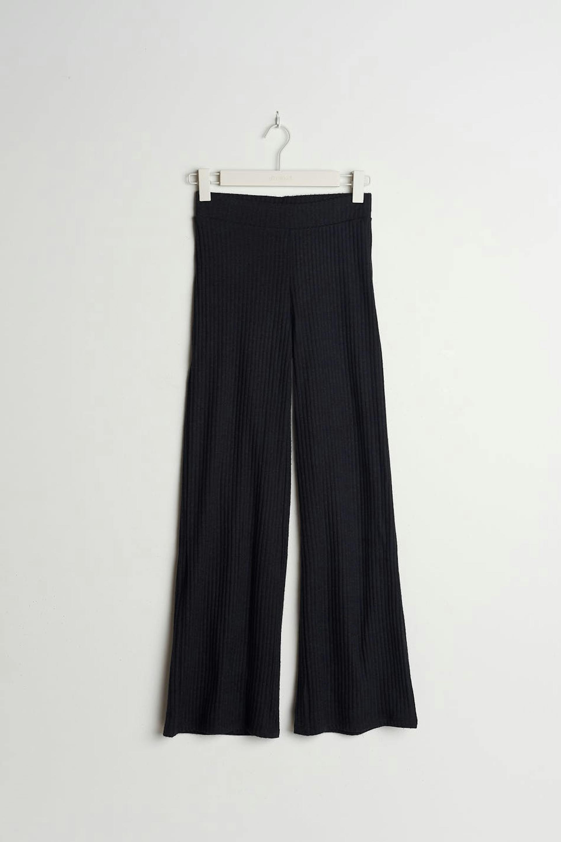 Pehmeät housut vartalonmyötäisellä istuvuudella. Housut ovat mustia ja niissä on suorat, leveät jalat. Niissä on pehmeäksi harjattu, resorimainen laatu ja mukava joustonauha vyötäröllä.