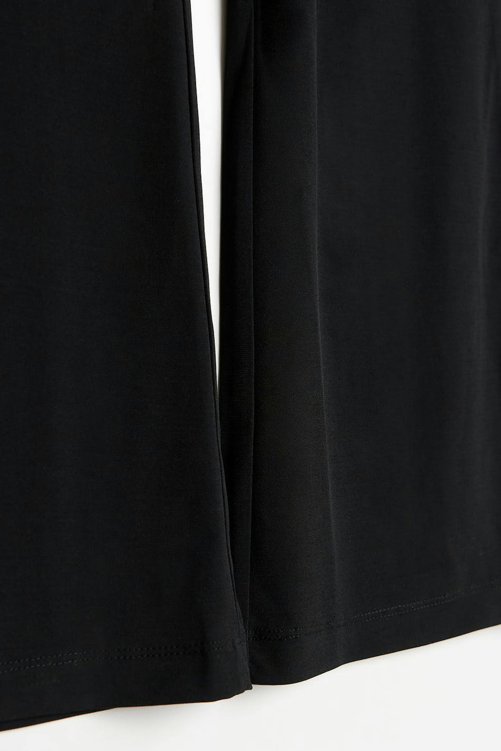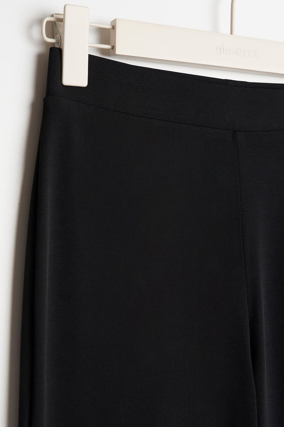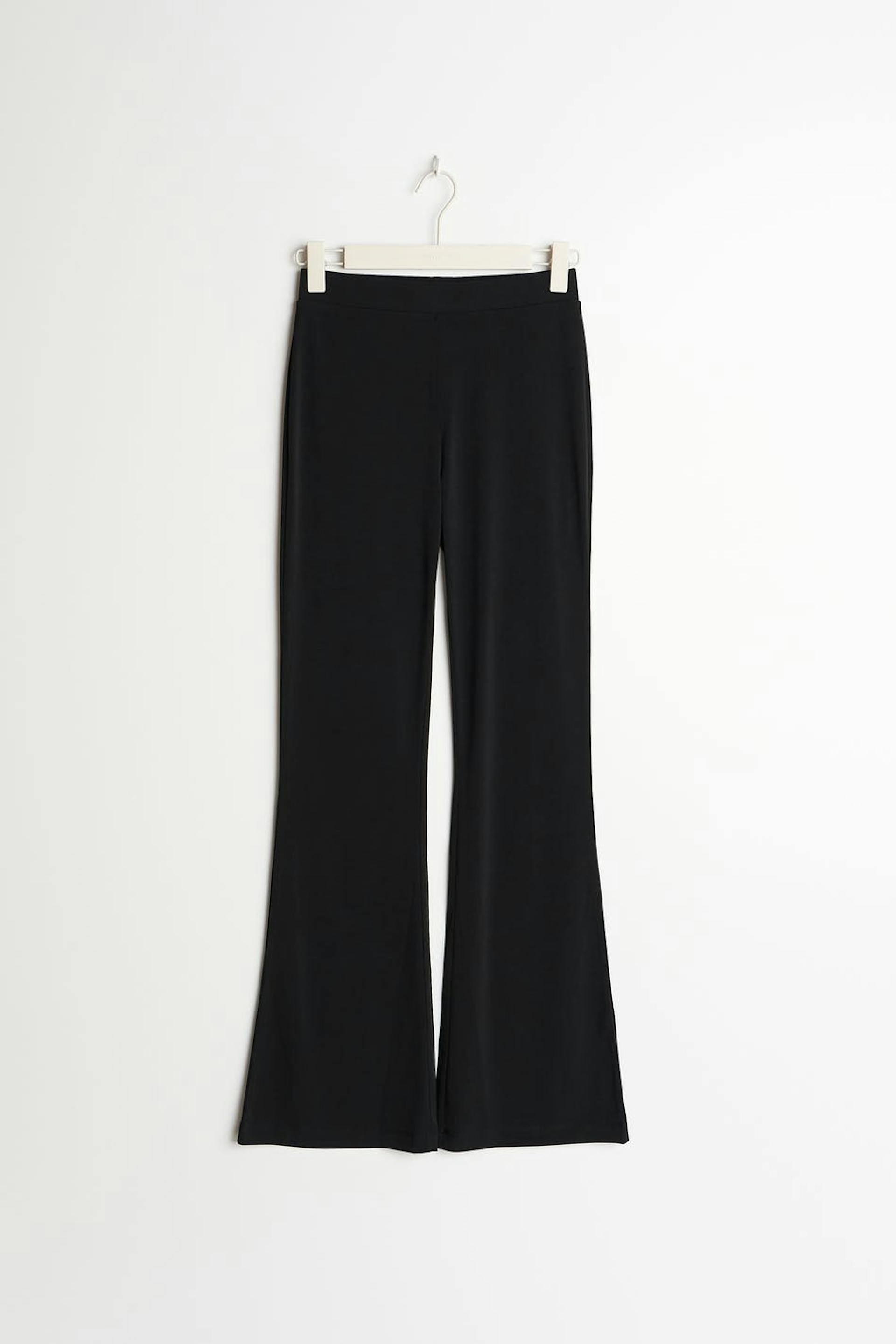 Levenevät housut normaalilla istuvuudella. Housut ovat mustia ja niissä on resori vyötäröllä. Ne valmistetaan trikoosta.