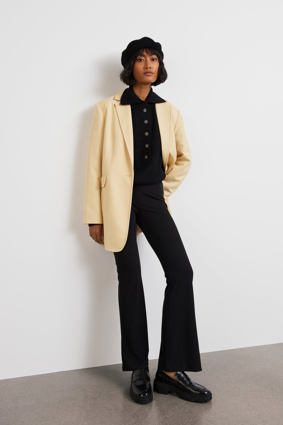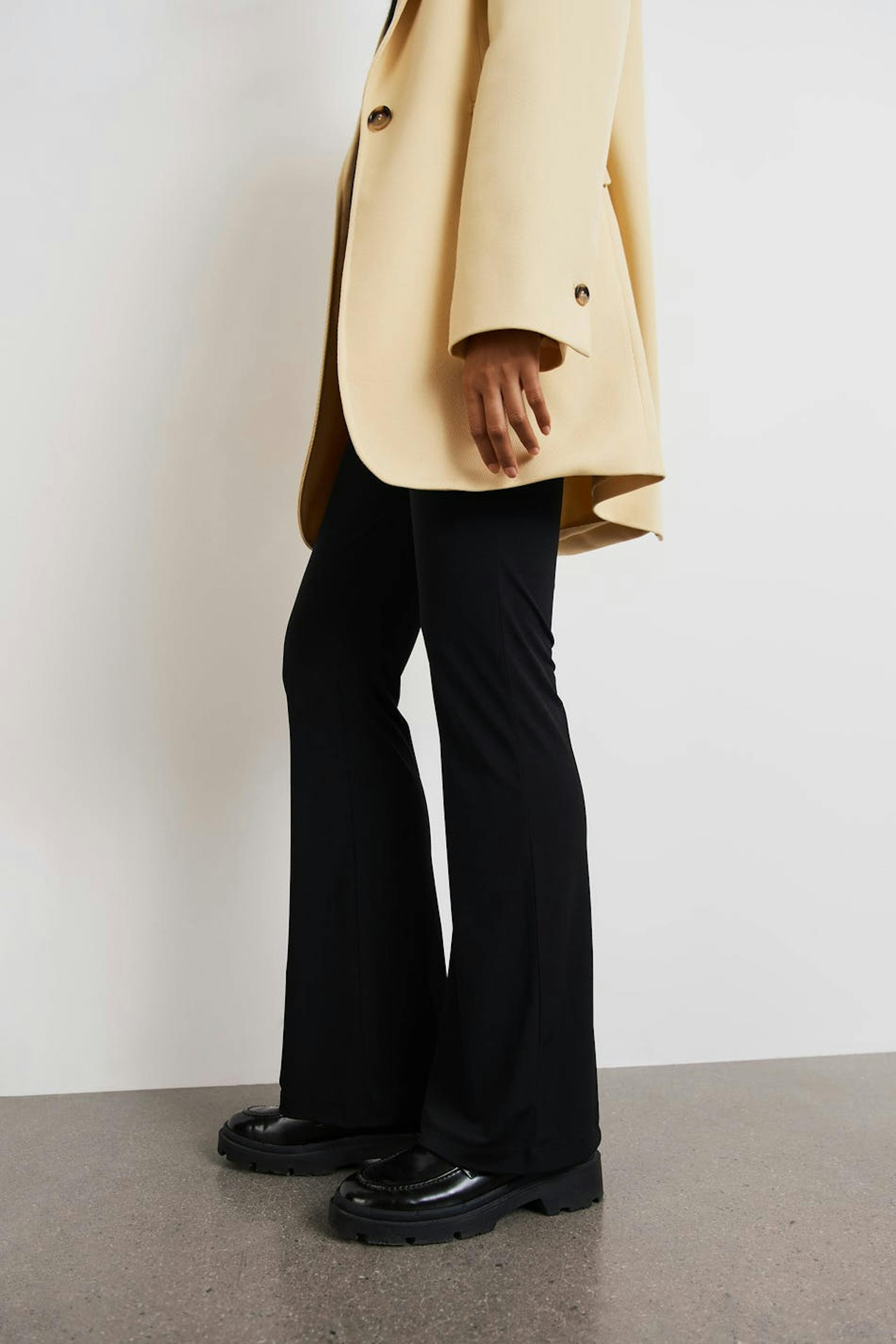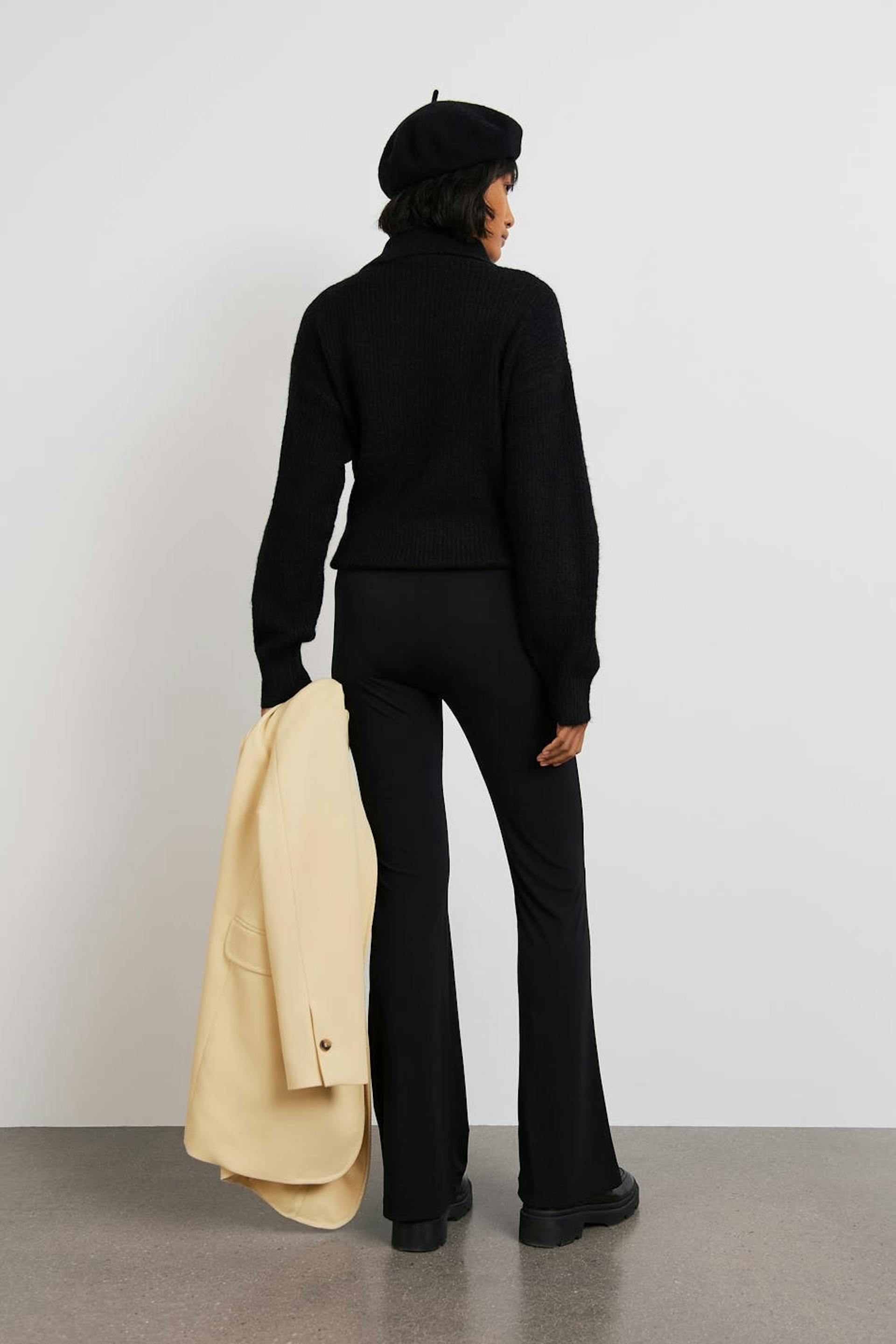 Levenevät housut normaalilla istuvuudella. Housut ovat mustia ja niissä on resori vyötäröllä. Ne valmistetaan trikoosta.
