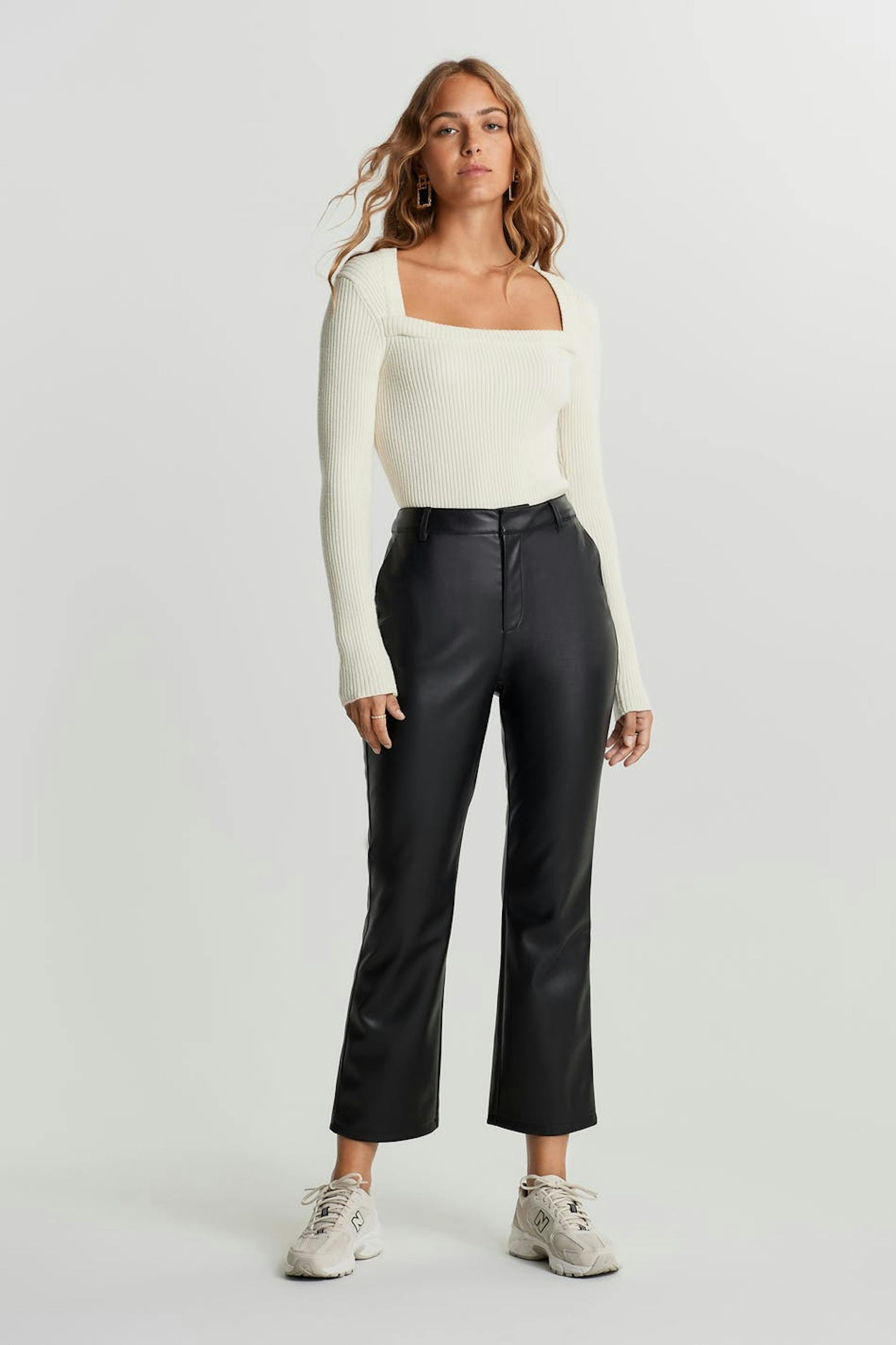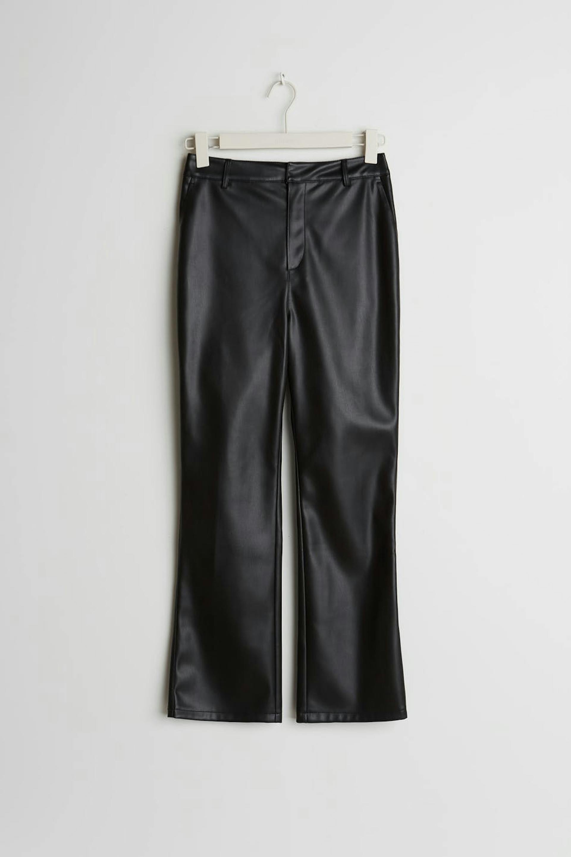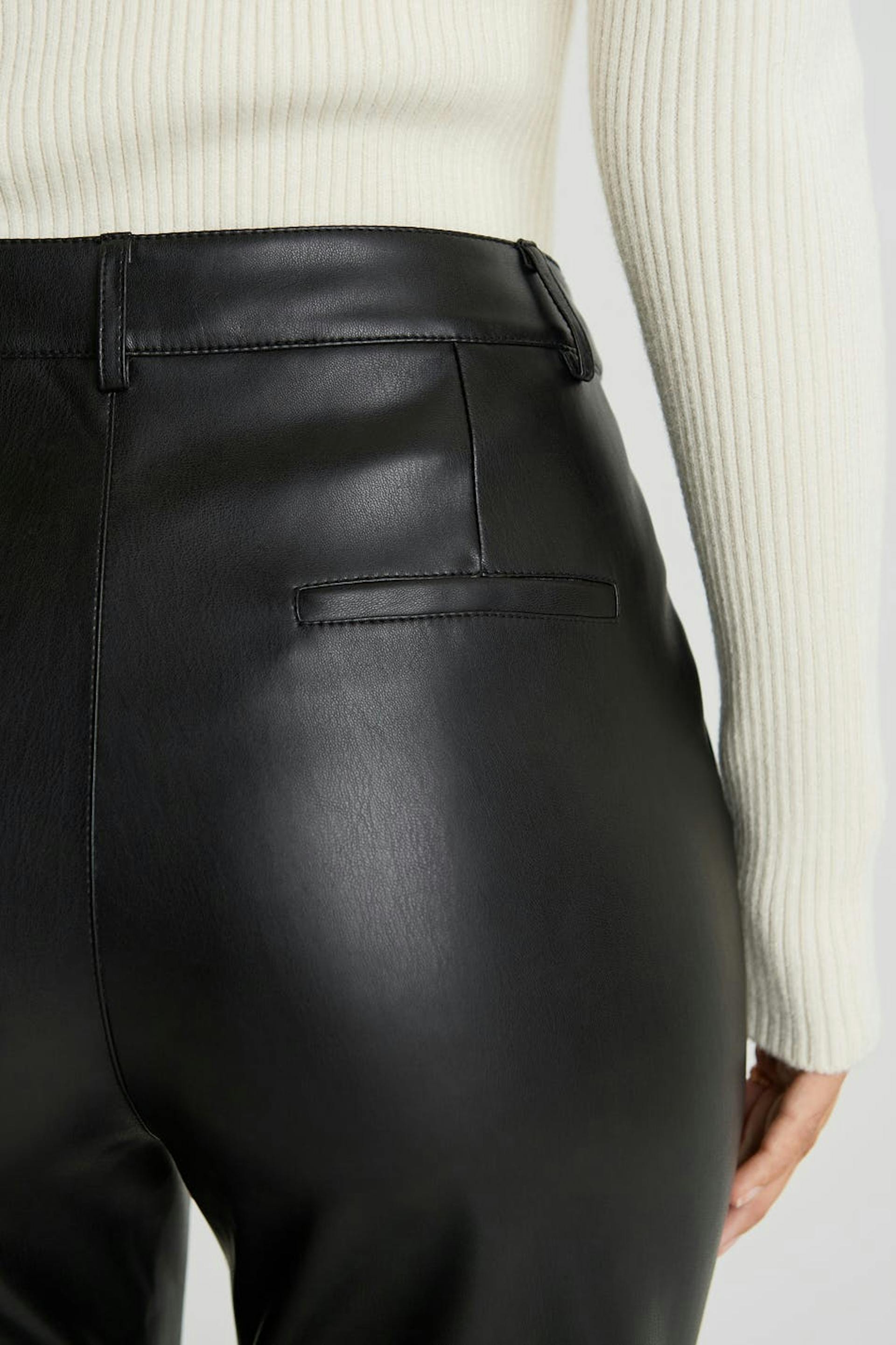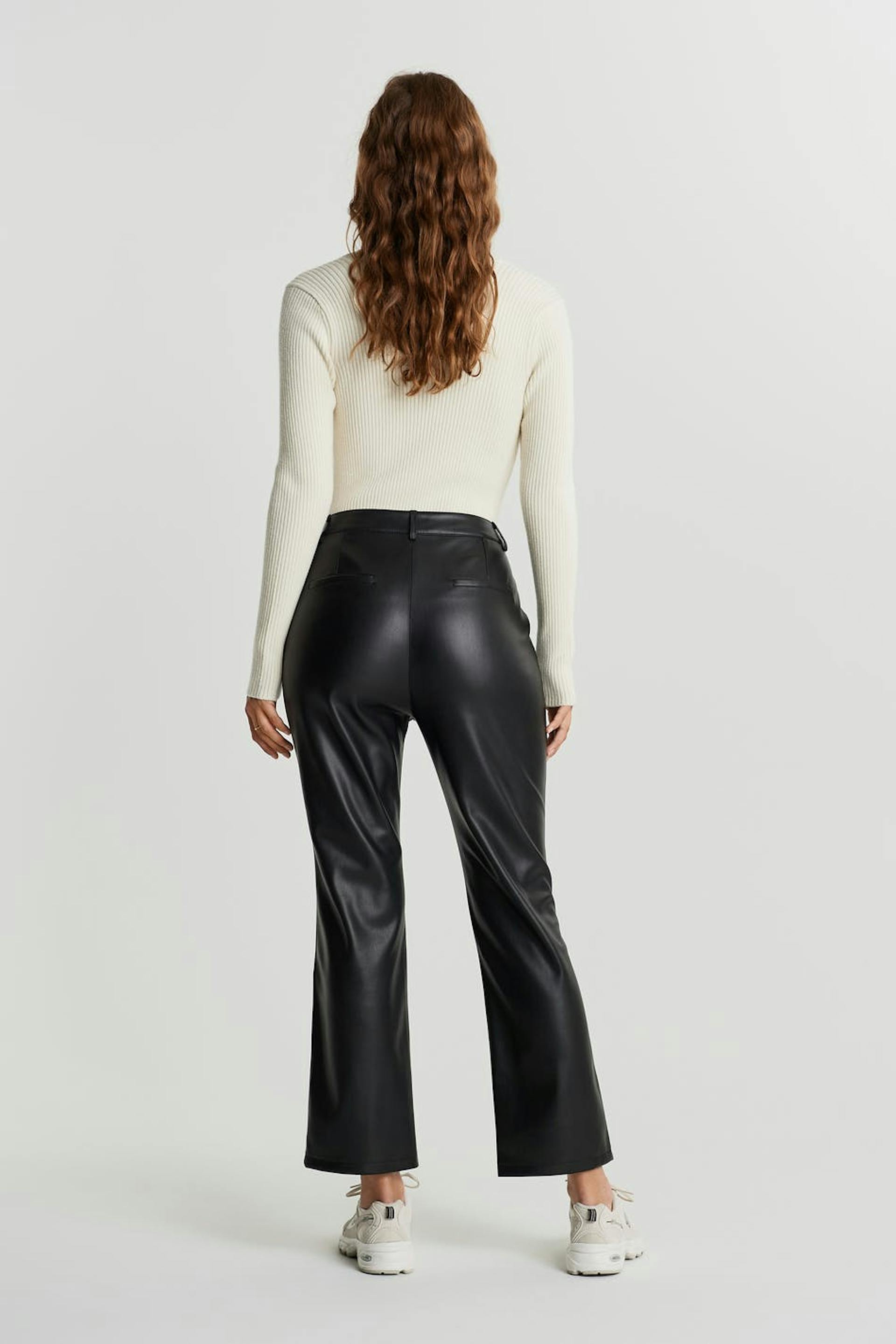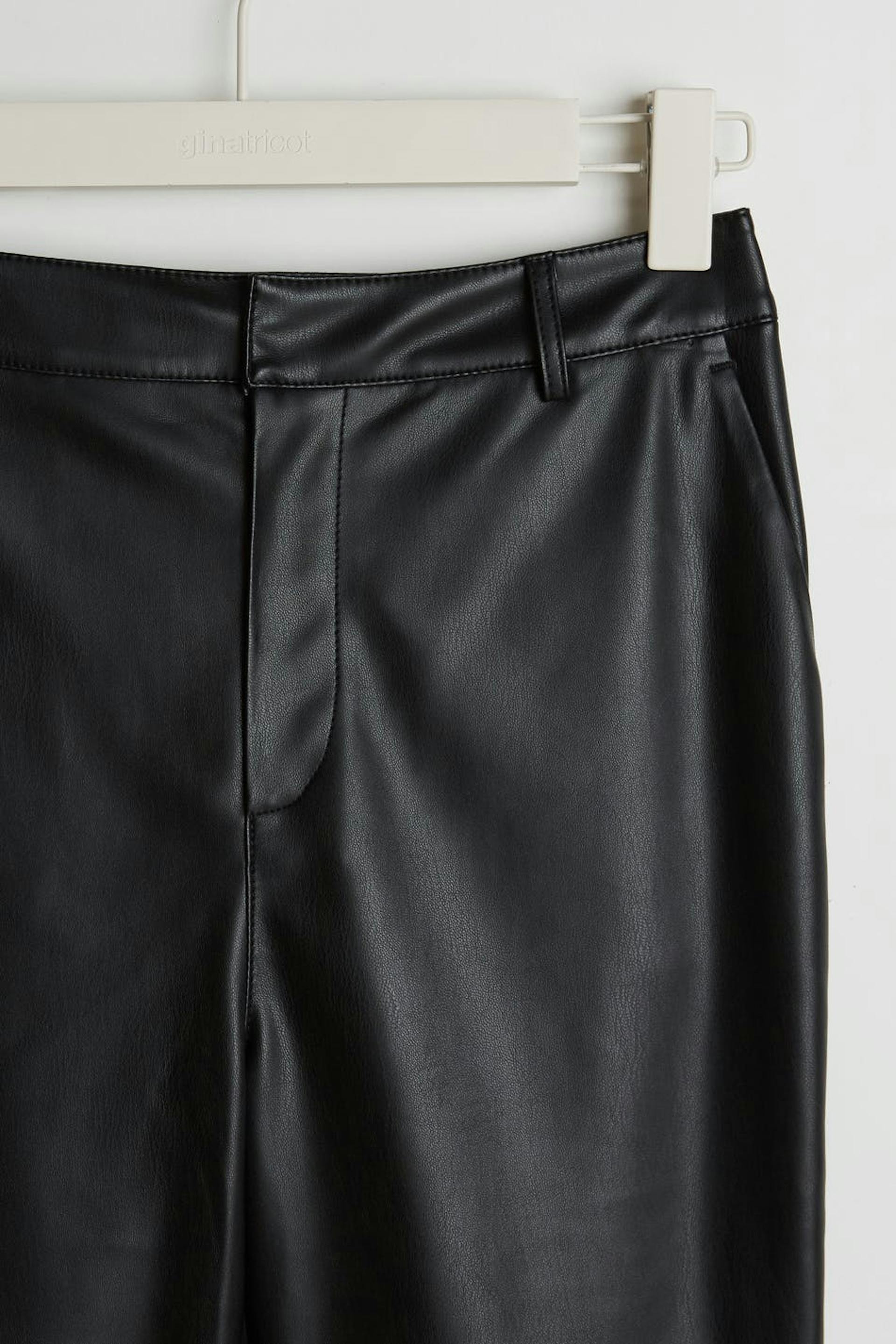 Suorat housut hieman levenevillä housujen lahkeilla. Housut ovat mustia ja cropattuja ja niissä on taskut sivuissa. Ne valmistetaan tekonahasta.