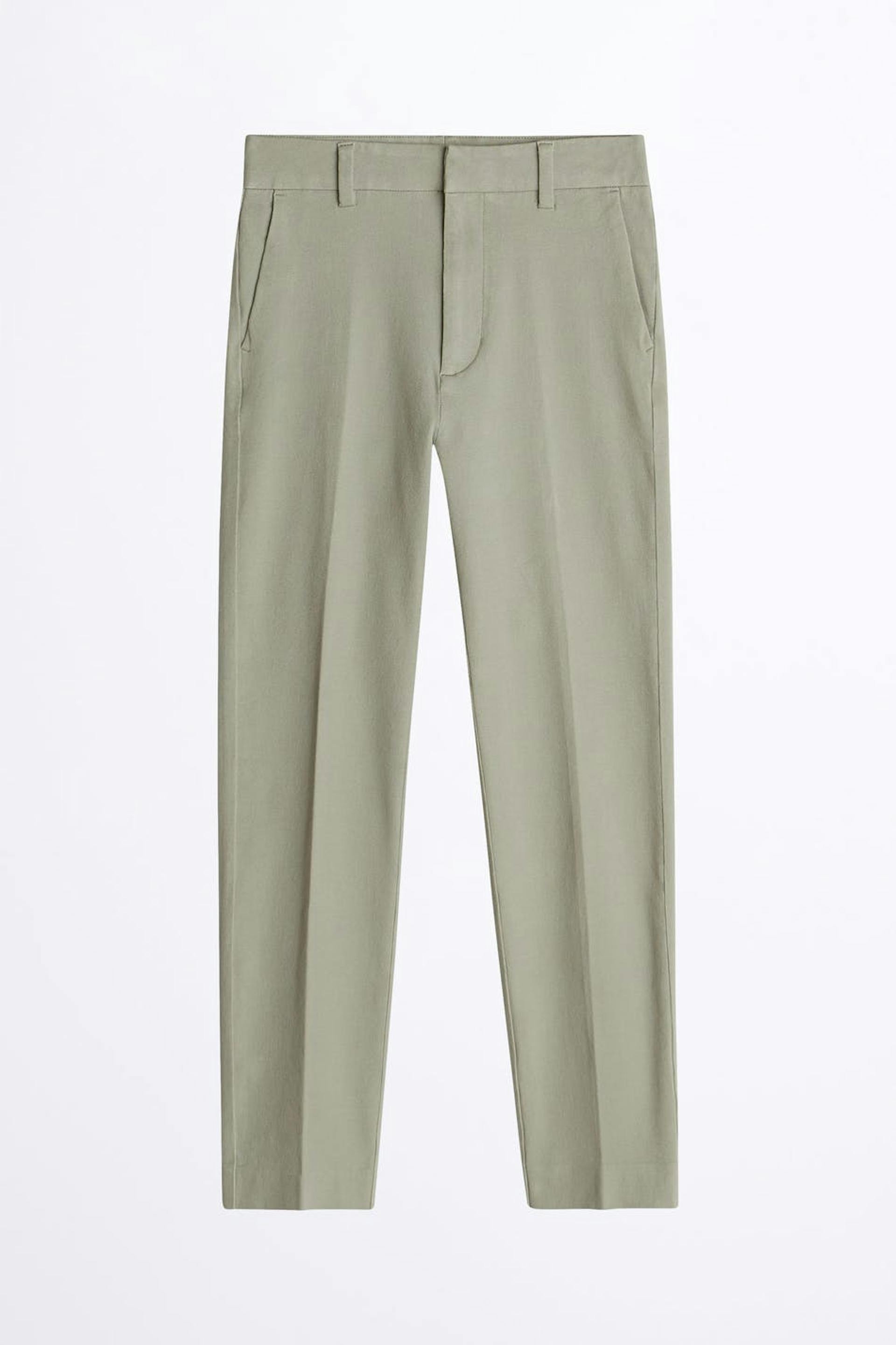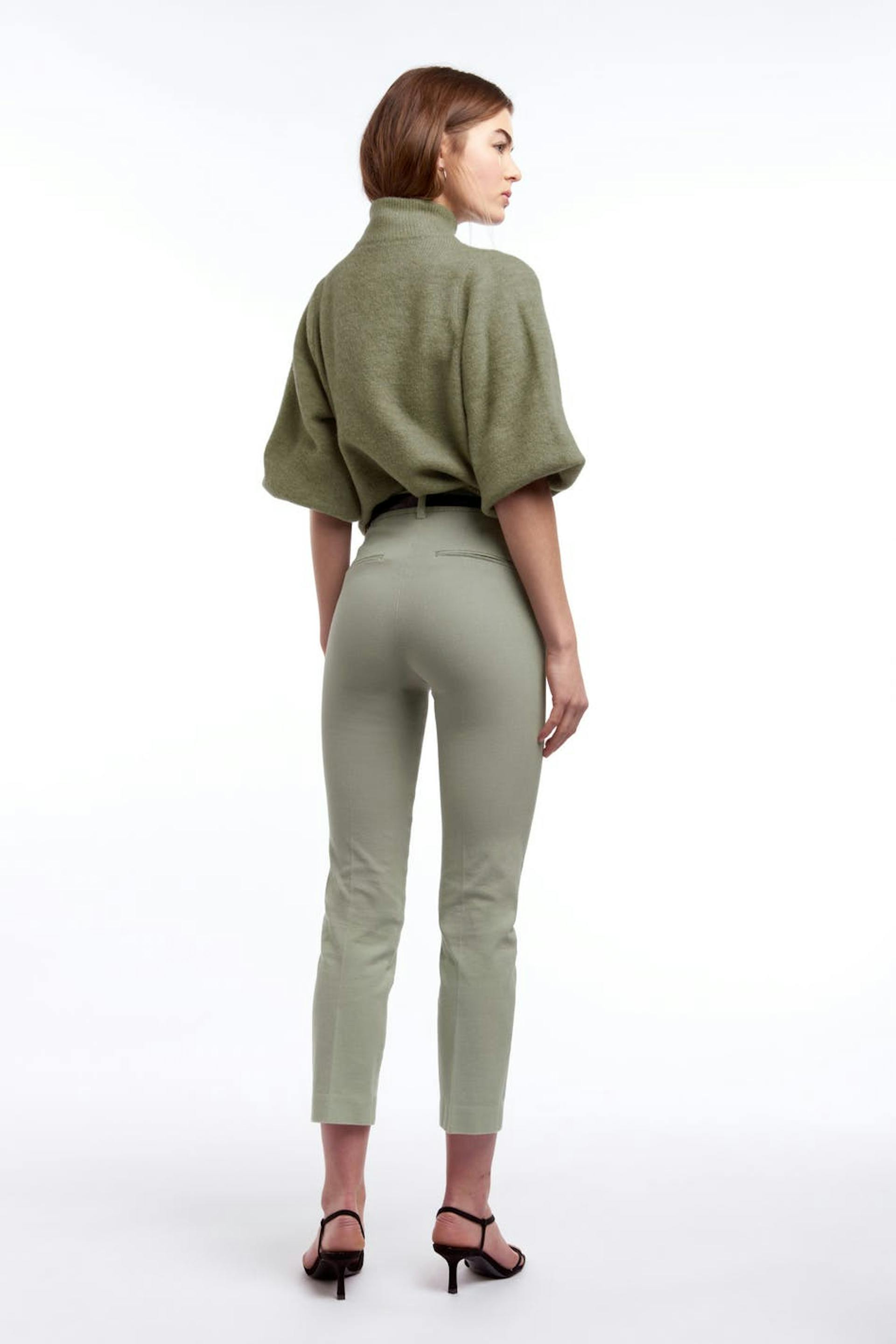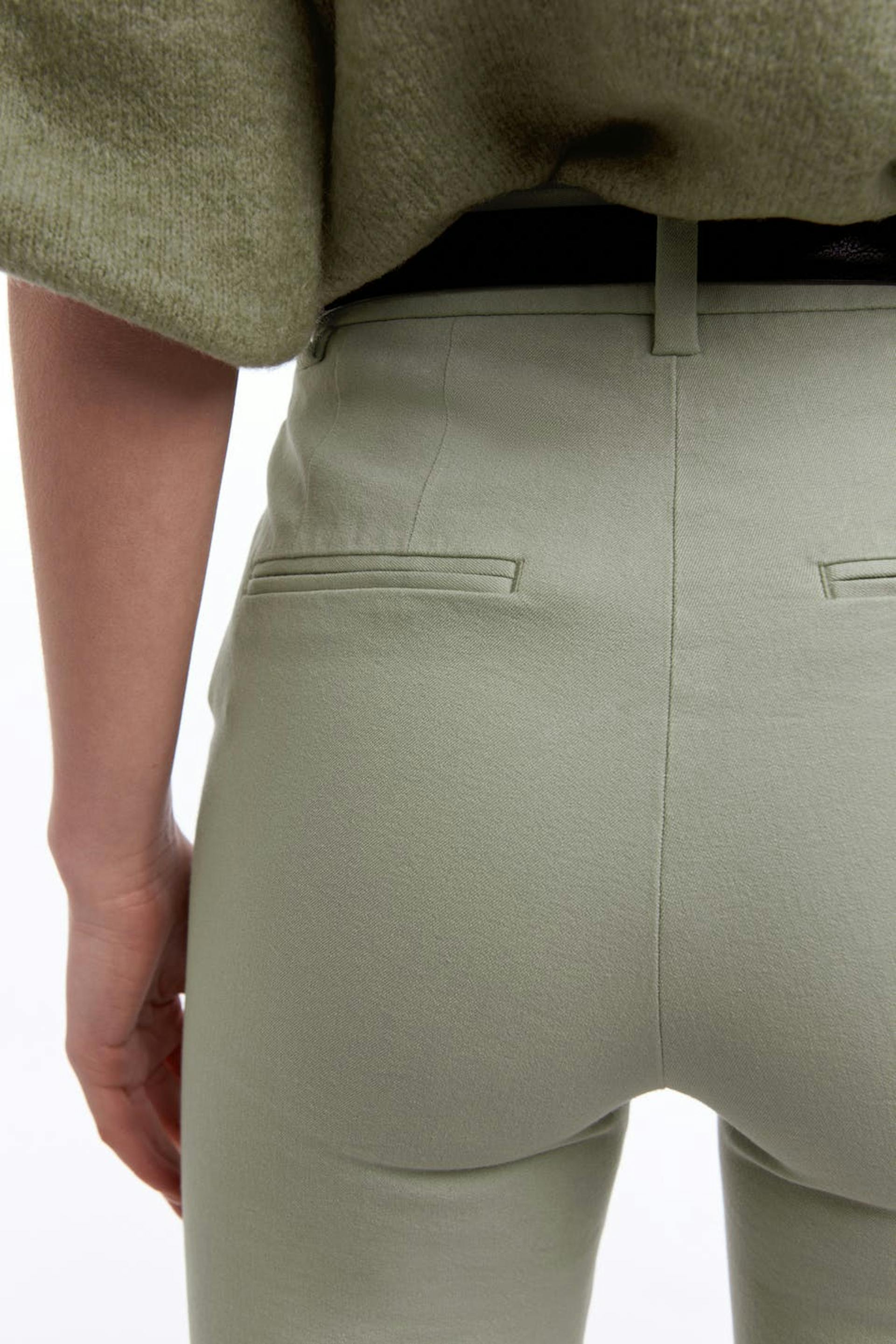 Kudotut housut superstretch-kankaalla. Housut ovat vihreitä ja niissä on slim-leikkaus. Ne valmistetaan puuvillasta ja niissä on vekit etusivun alaosassa.
