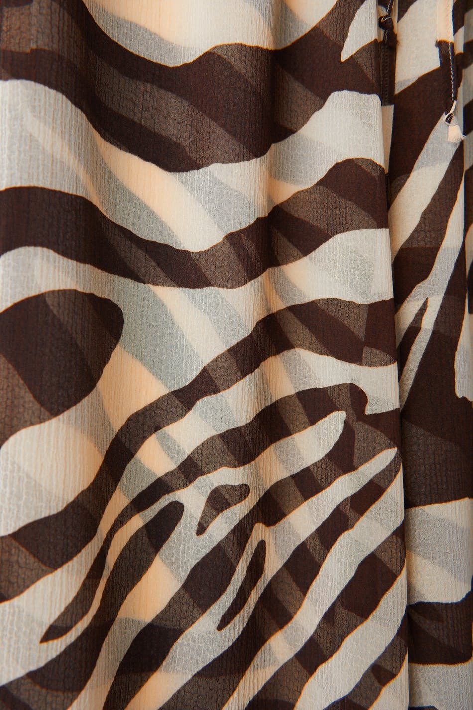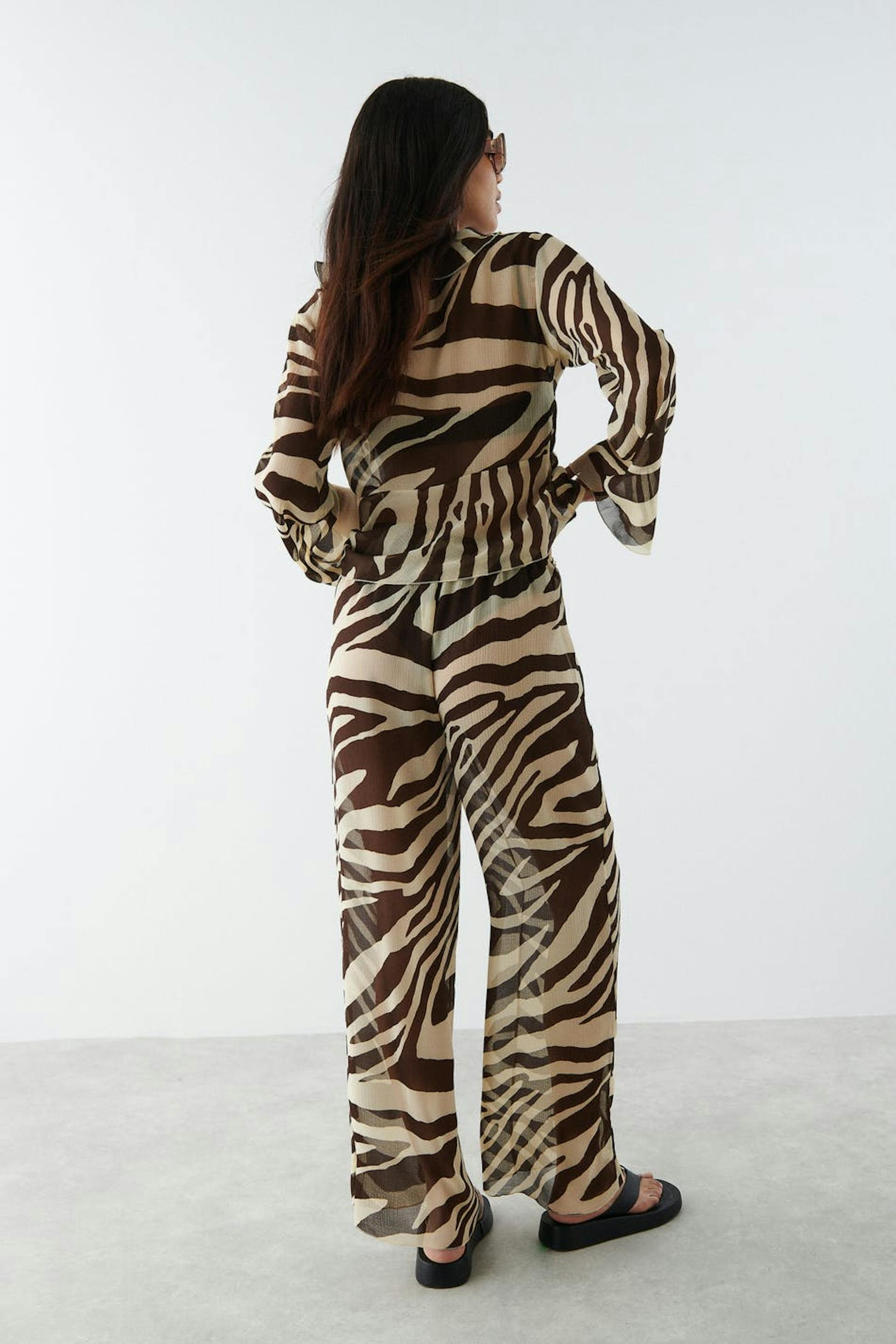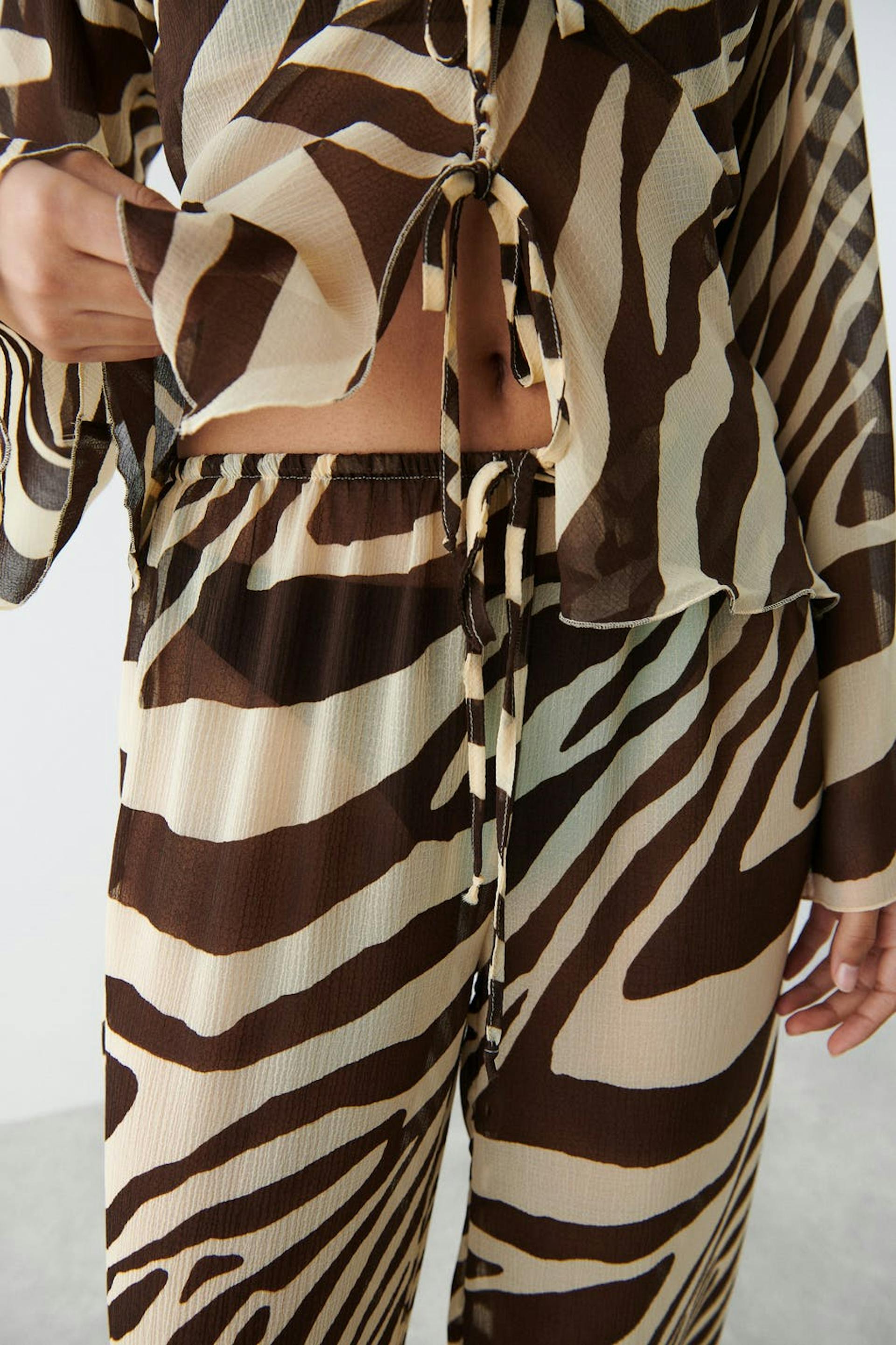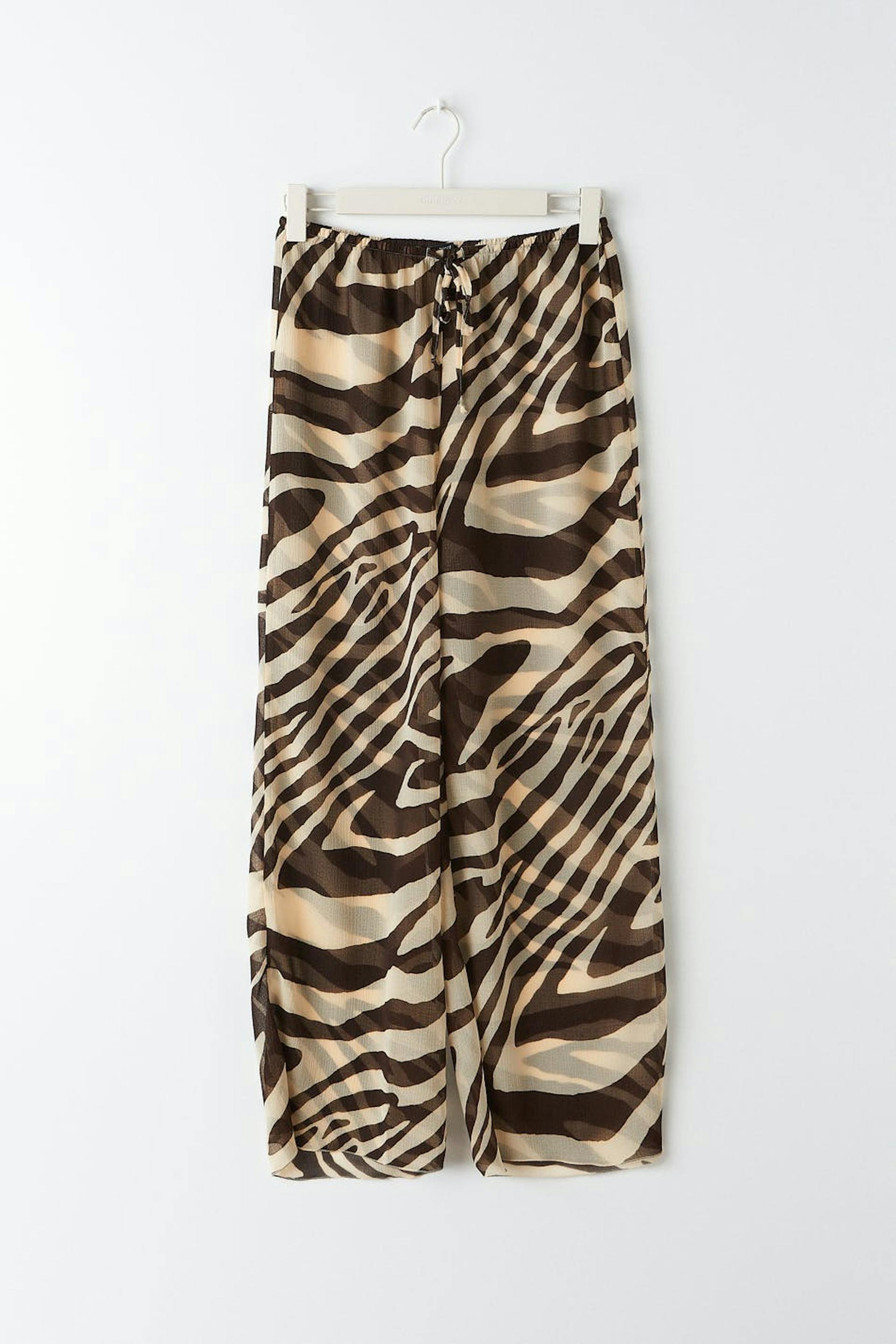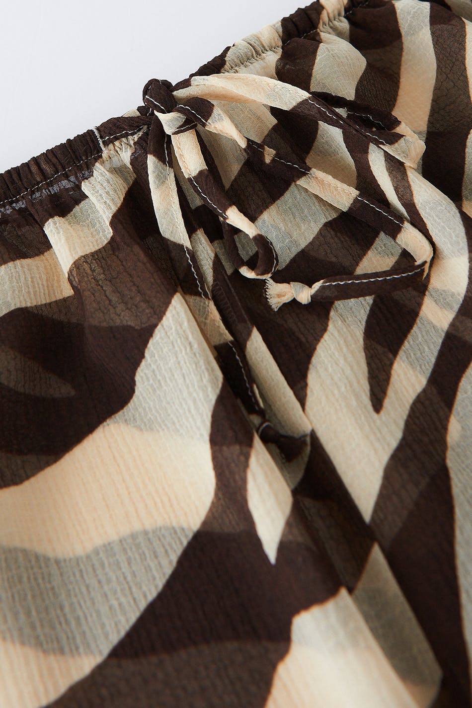 Seeprakuvioidut housut ilmavasta sifongista rennolla istuvuudella. Housut ovat ruskeita ja niissä on kuminauha vyötäröllä solmittavalla vyöllä edessä.