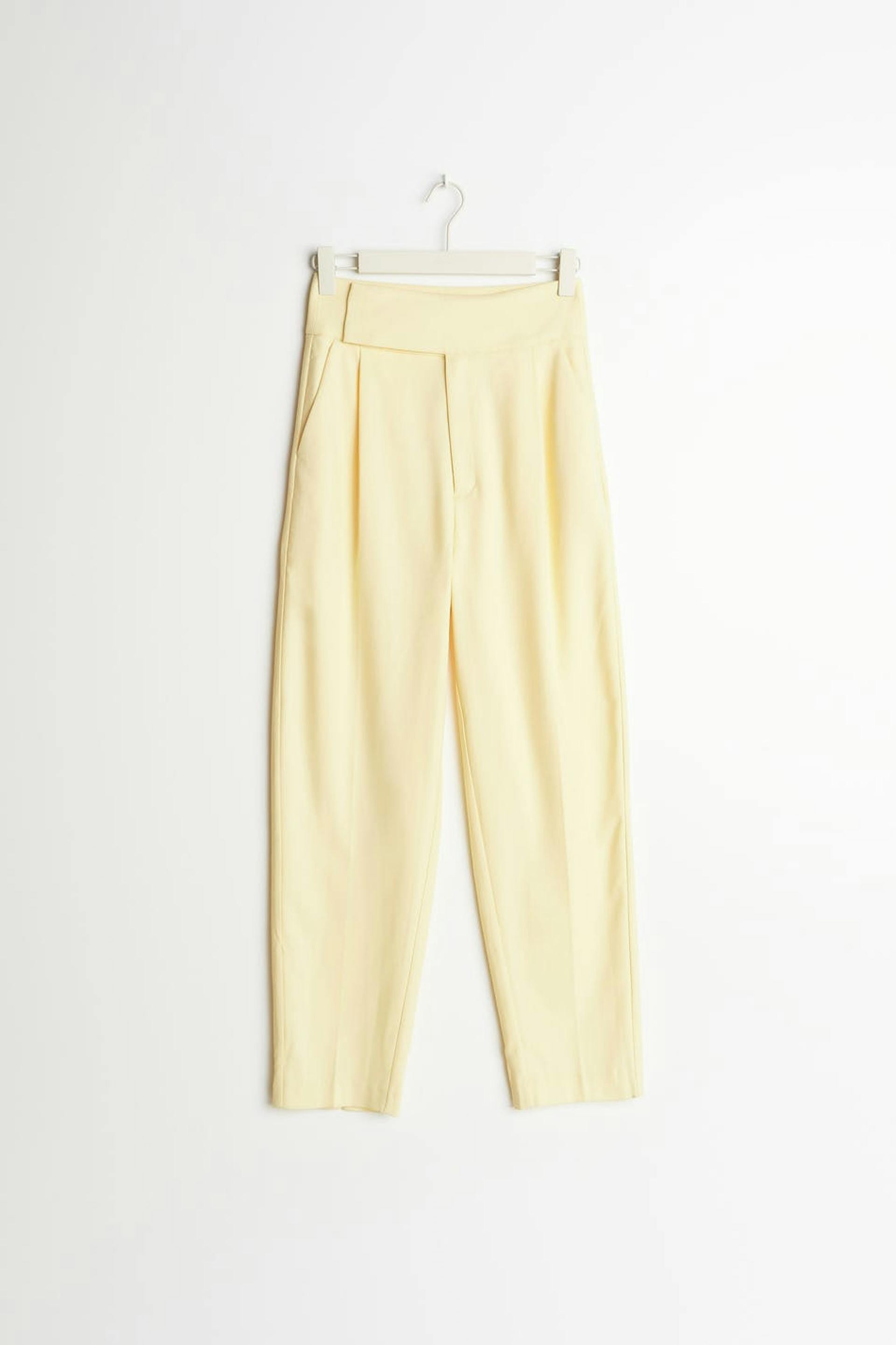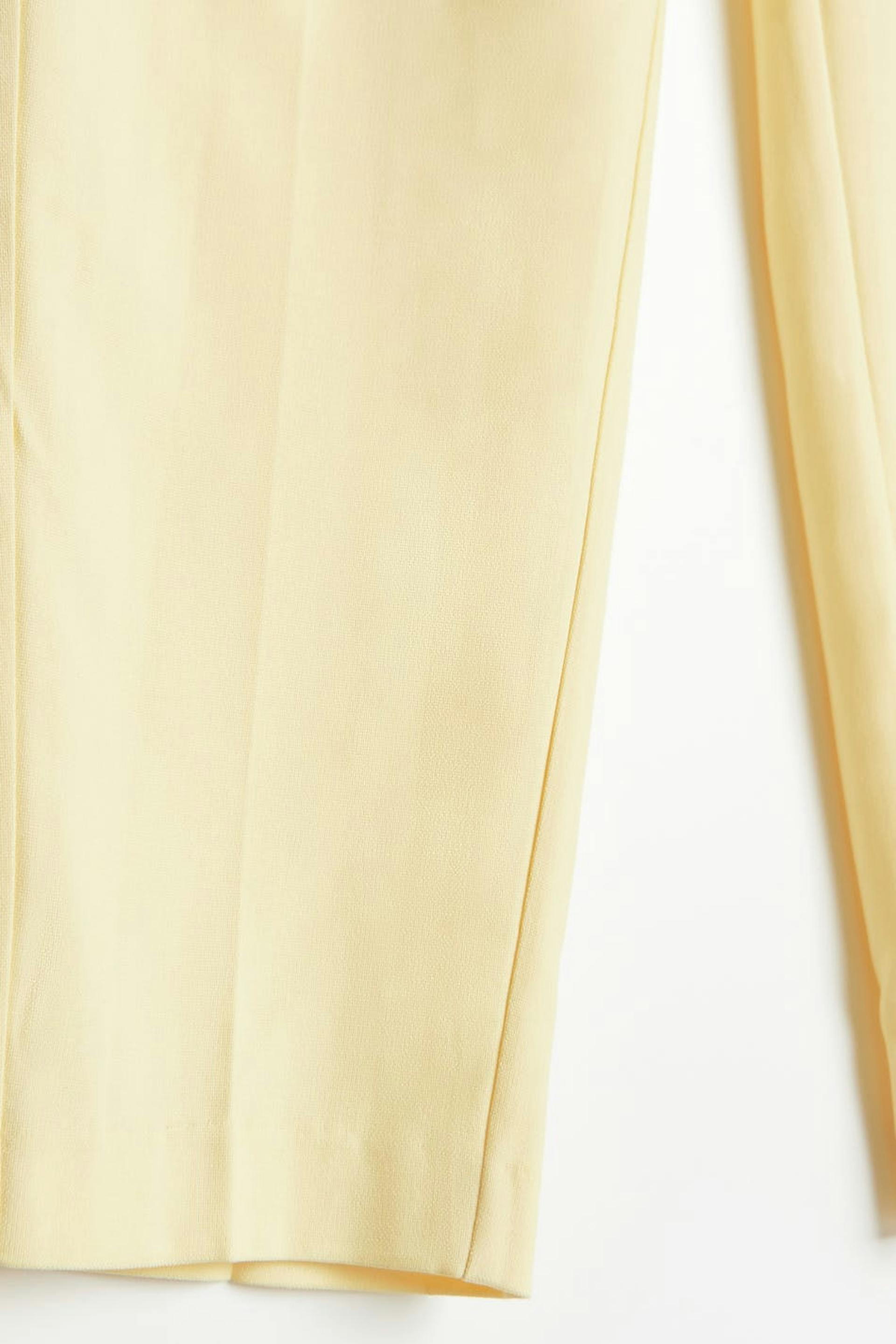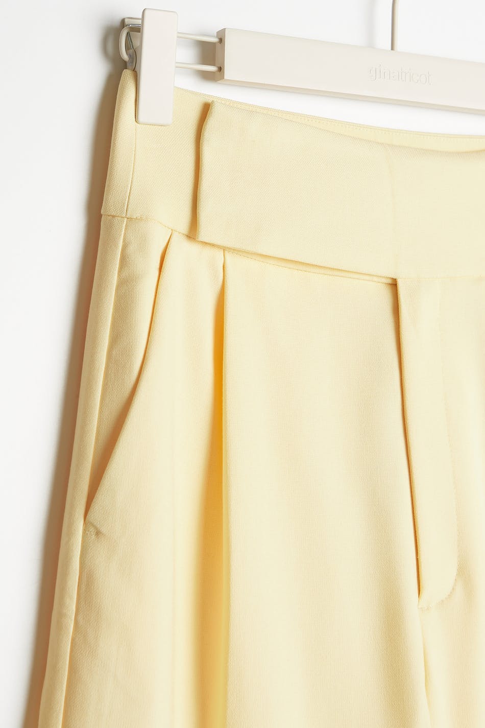 Kudotut puvunhousut vekkiyksityiskohdilla edessä. Housut ovat keltaisia ja niissä on korkea vyötärönauha. Niissä on sivutaskut, sepalus vetoketjulla ja suorat jalat kevyesti kapenevilla lahkeen pituuksilla.