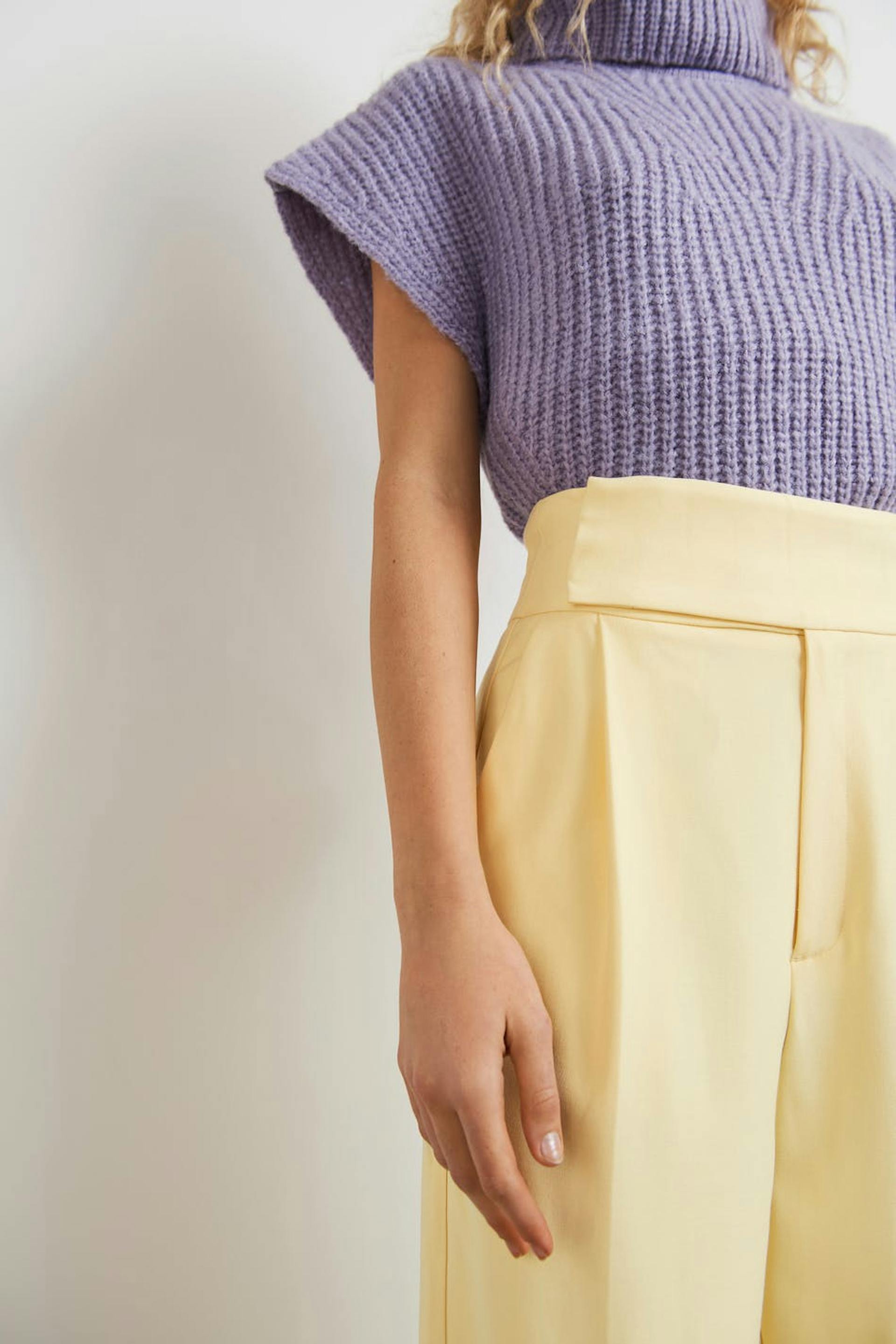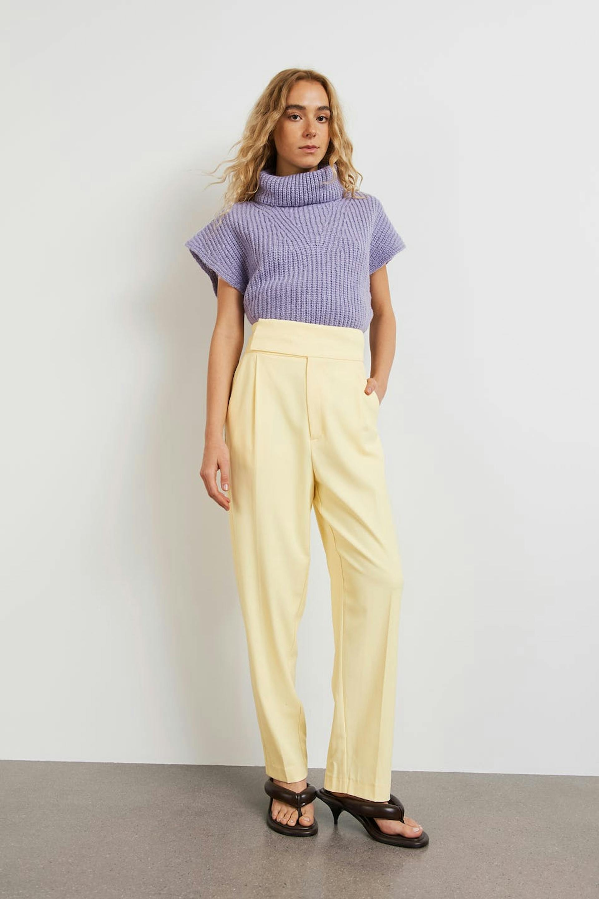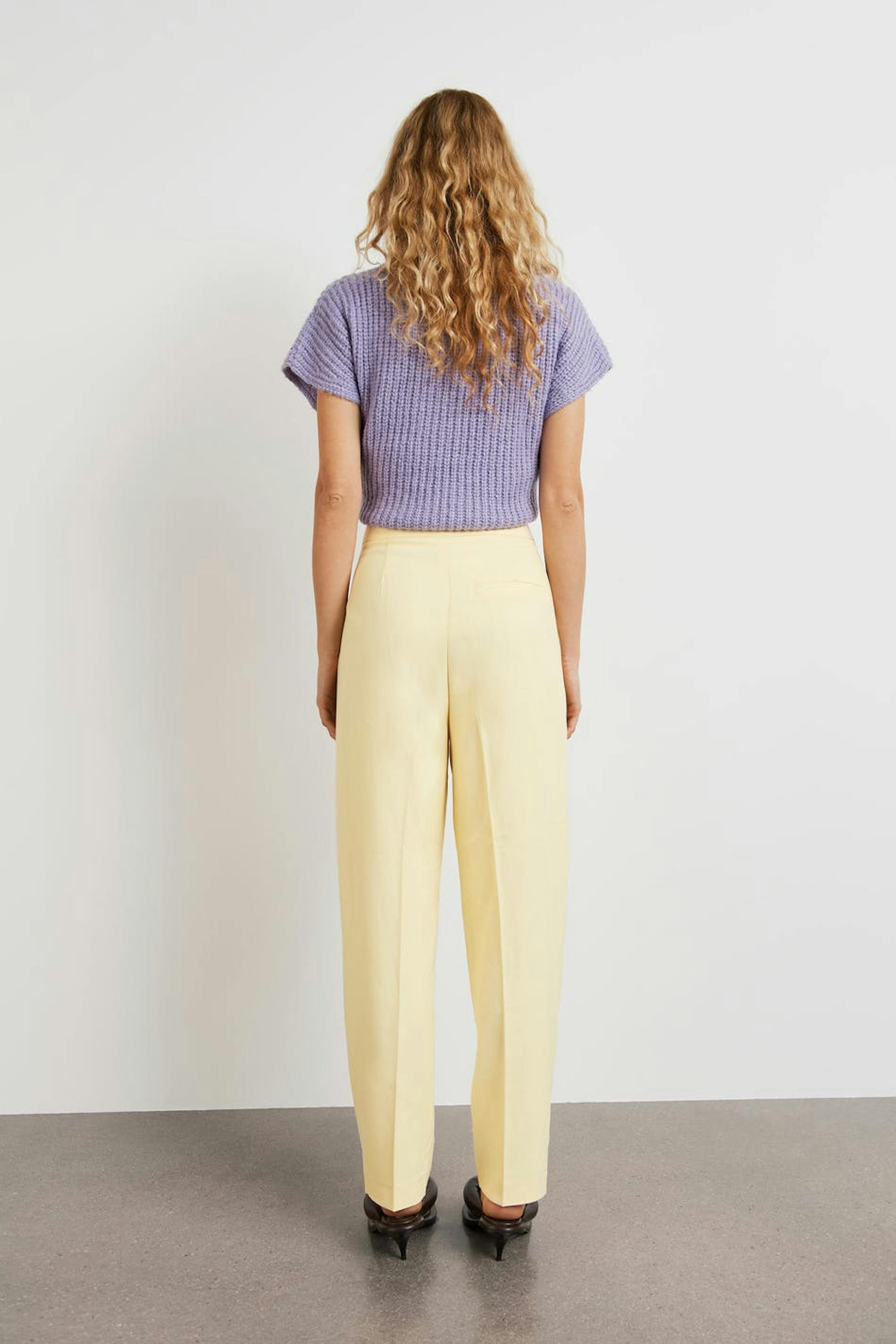 Kudotut puvunhousut vekkiyksityiskohdilla edessä. Housut ovat keltaisia ja niissä on korkea vyötärönauha. Niissä on sivutaskut, sepalus vetoketjulla ja suorat jalat kevyesti kapenevilla lahkeen pituuksilla.
