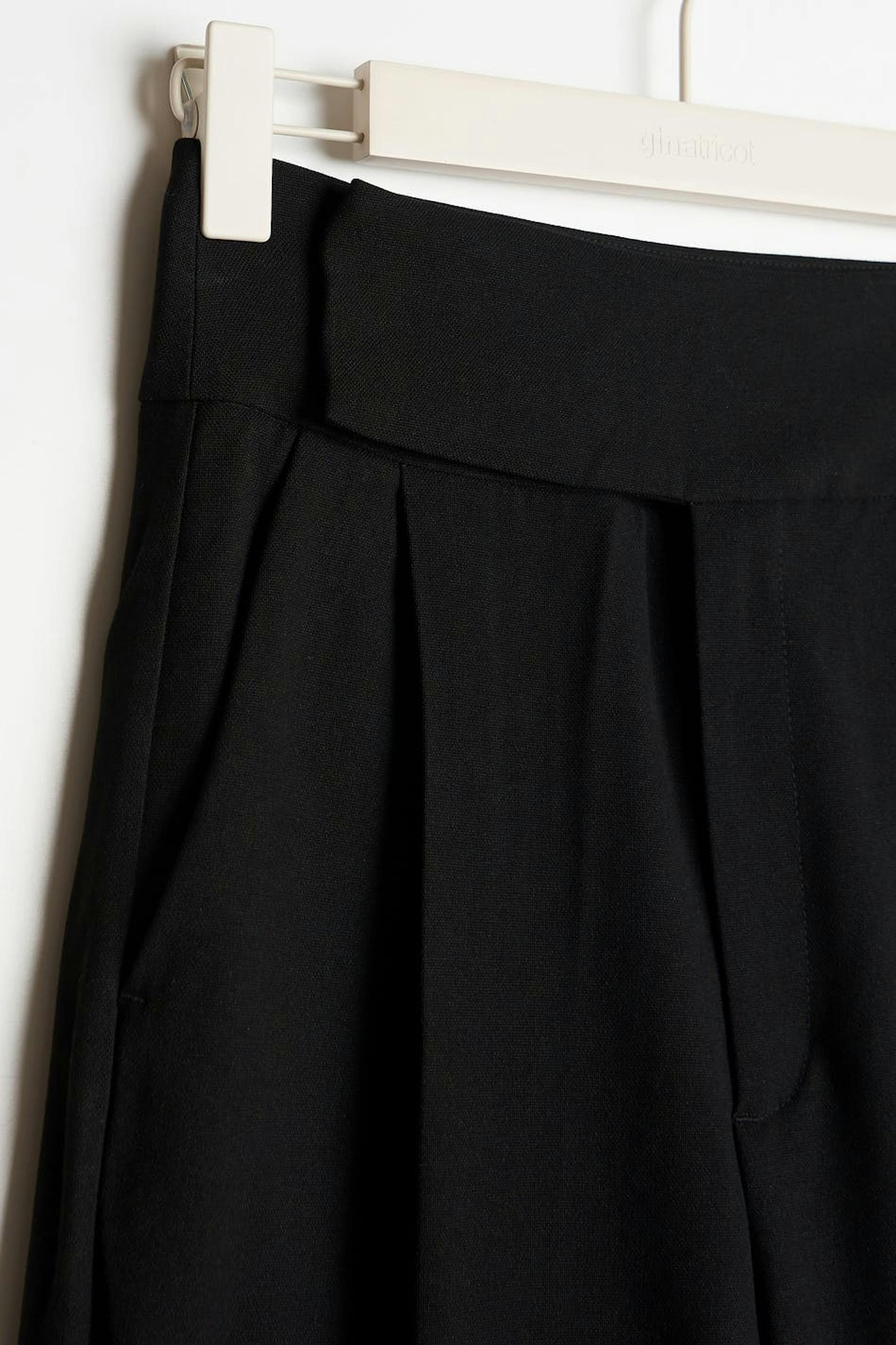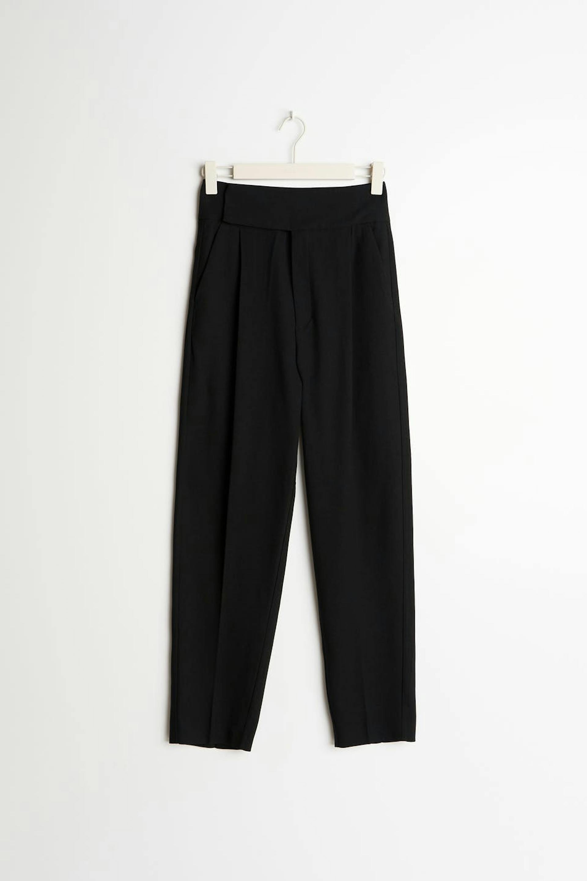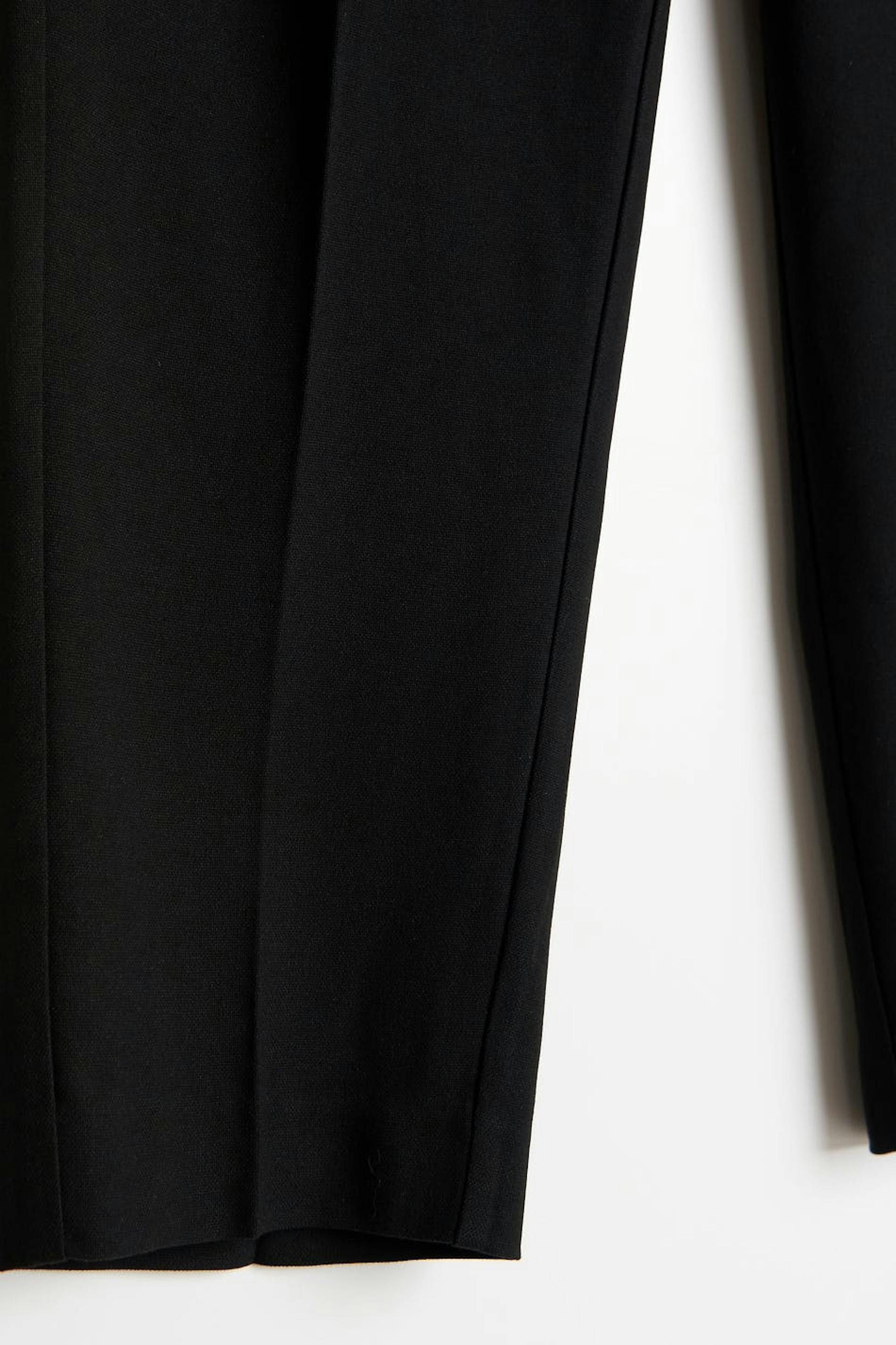 Kudotut puvunhousut vekkiyksityiskohdilla edessä. Housut ovat mustia ja niissä on korkea vyötärönauha. Niissä on sivutaskut, sepalus vetoketjulla ja suorat jalat kevyesti kapenevilla lahkeen pituuksilla.