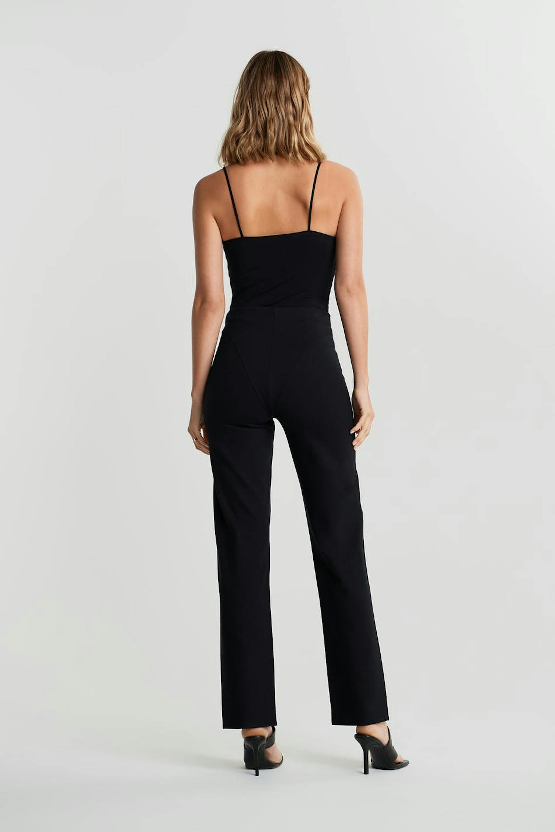 Housut korkealla vyötäröllä. Housut ovat mustia ja niissä on slim-leikkaus. Niissä on kokopitkät, suorat housujen lahkeet halkioilla helmassa ja leikatut yksityiskohdat vyötäröllä.
