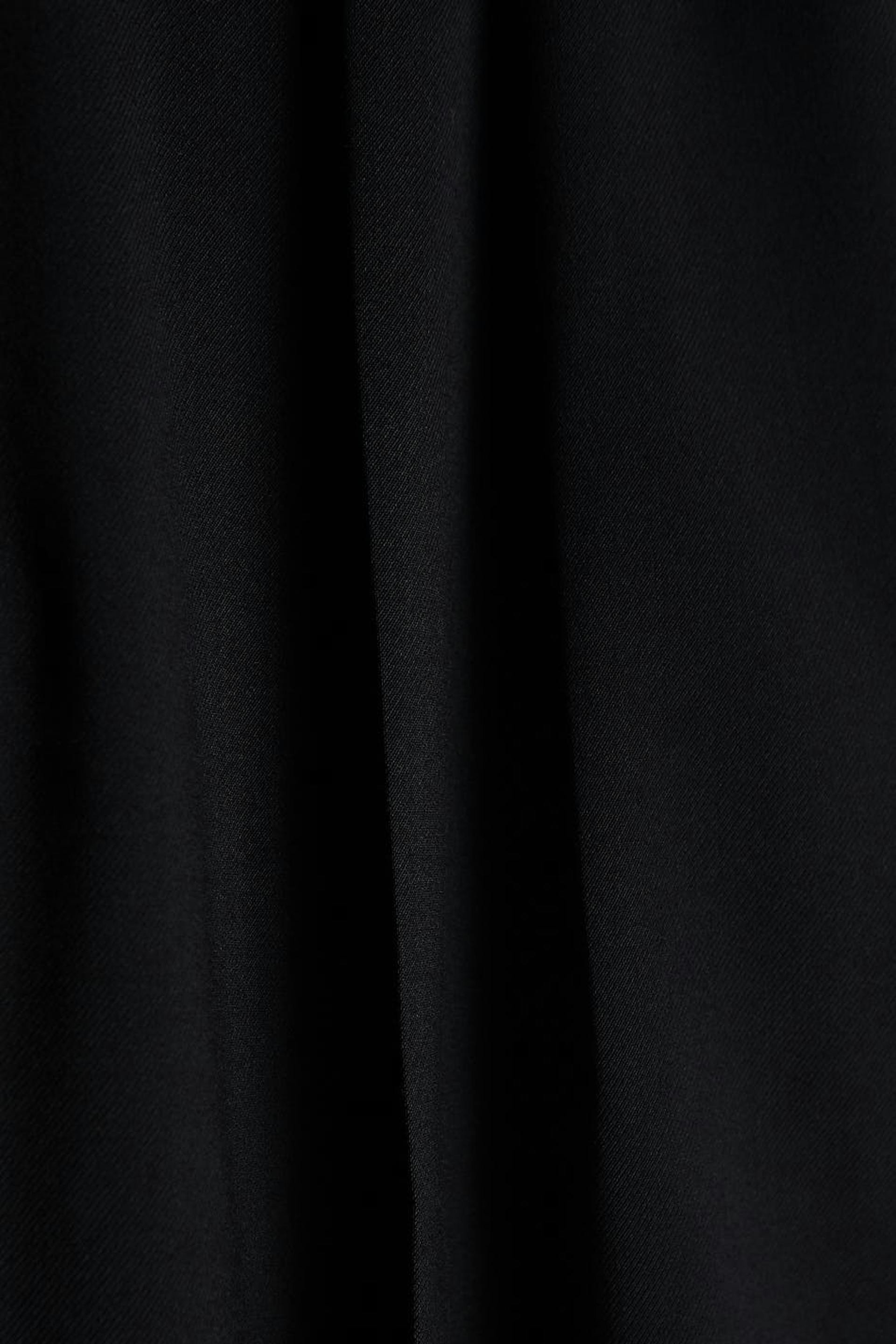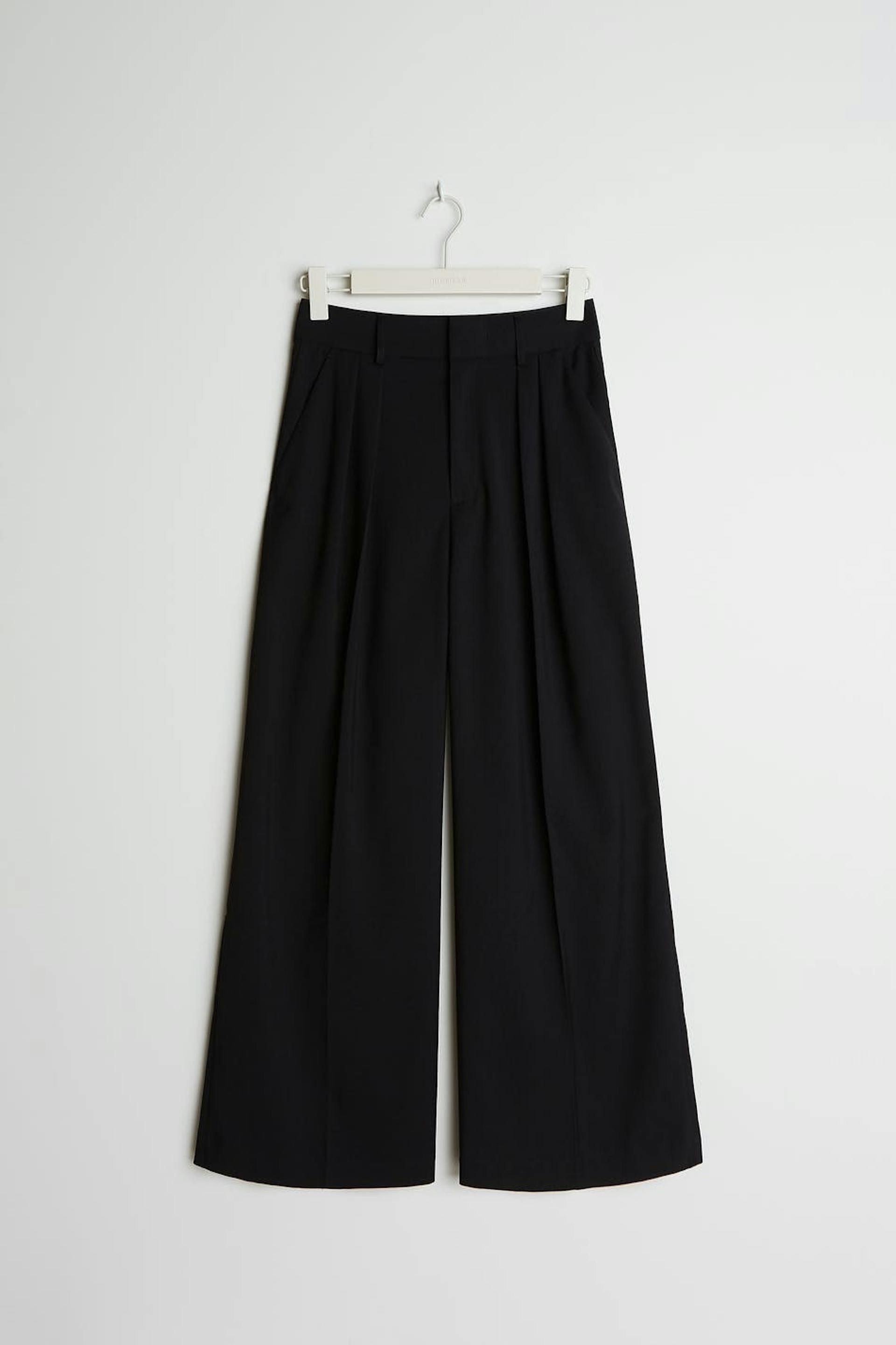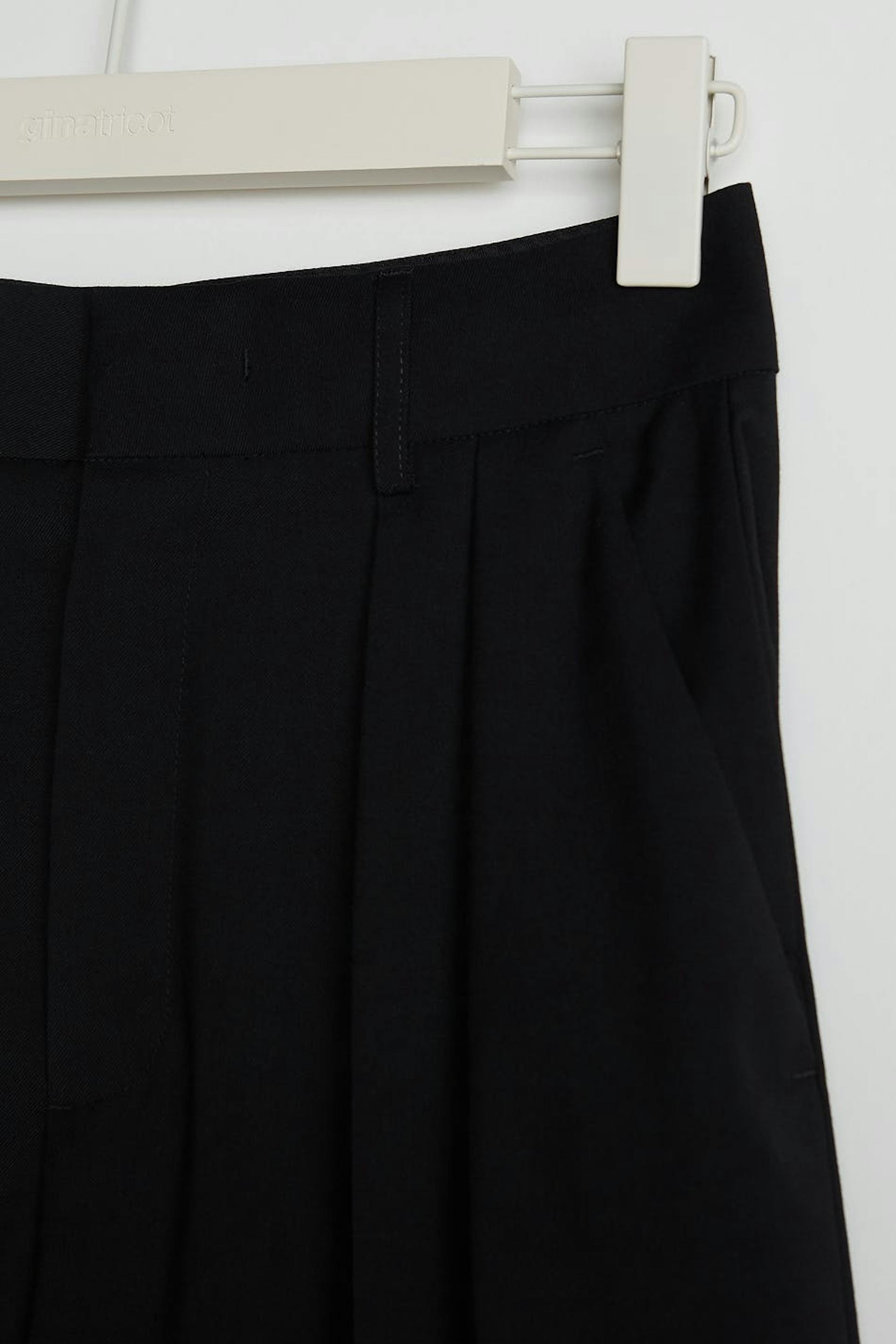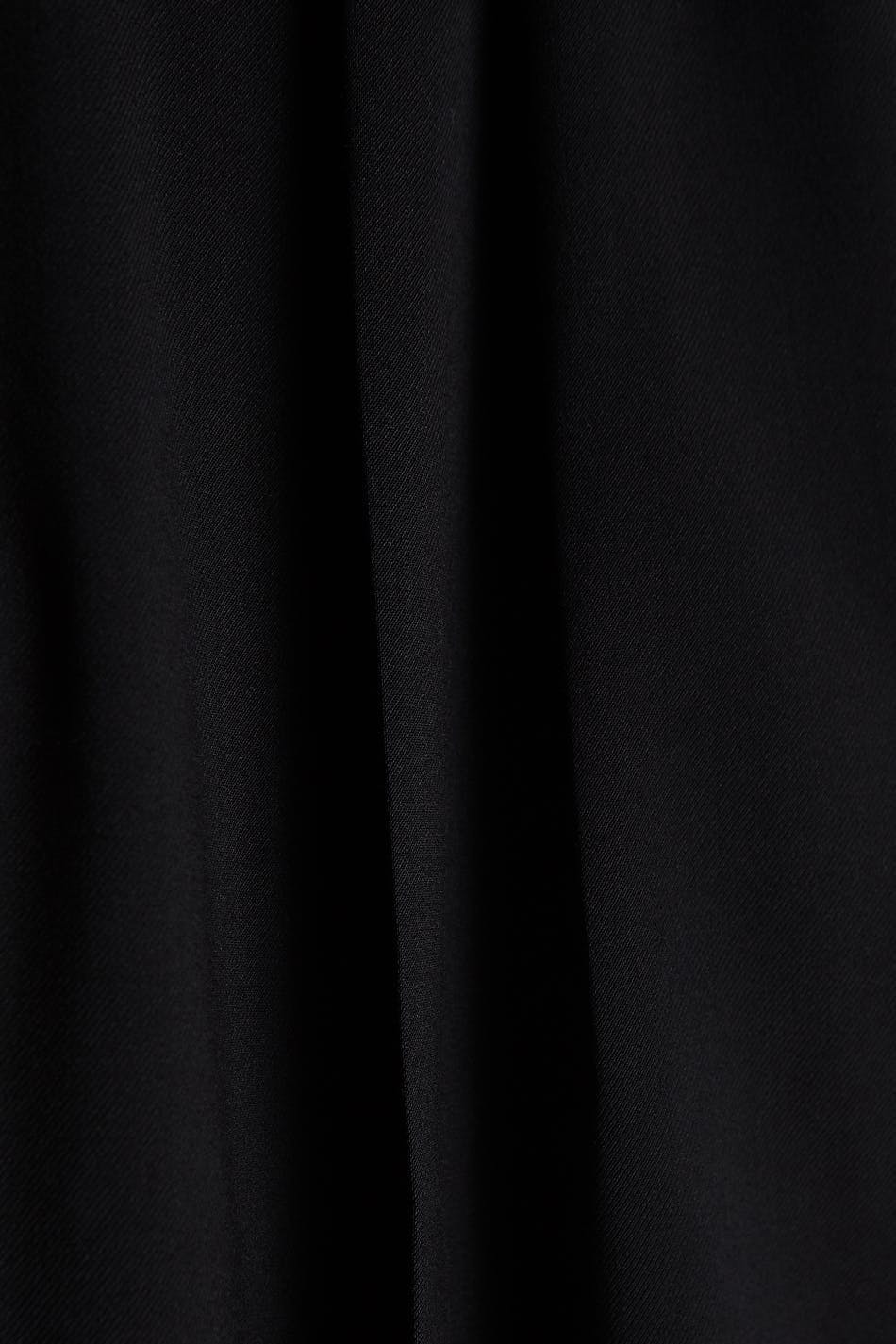 Sirot puvunhousut vartalonmyötäisellä vyötäröllä. Housut ovat mustia ja niissä on laskokset molempia jalkoja pitkin. Niissä on viiltotaskut takana ja leveät housujen lahkeet lyhyemmällä lahkeen pituudella. Sinulle, joka olet enintään 160 cm pitkä.