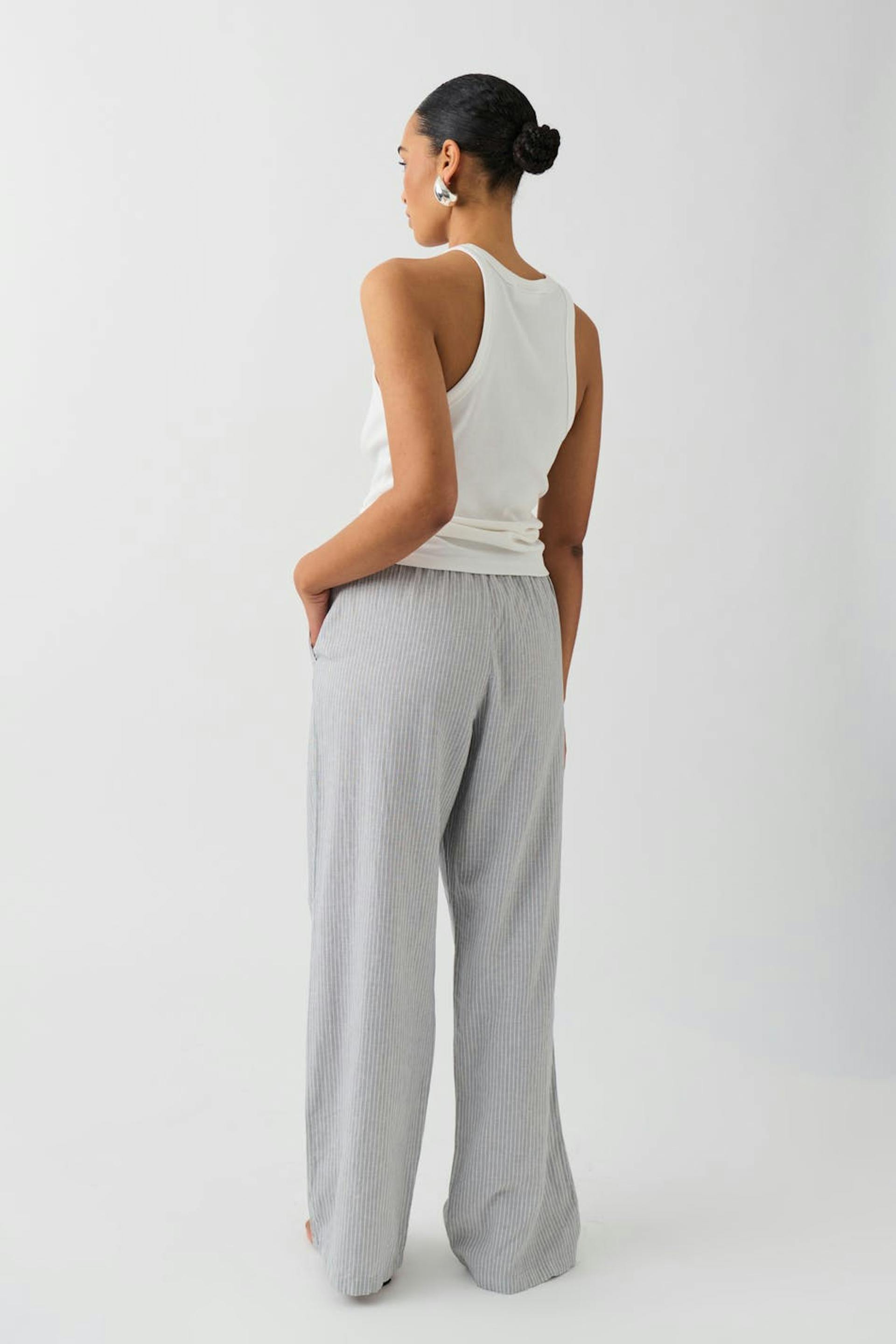 Raidalliset pellavahousut leveillä lahkeilla. Pellavahousut ovat harmaita ja niissä on keskikorkea vyötärö. Niissä on sivutaskut ja kuminauha vyötäröllä kiristysnyörillä edessä.