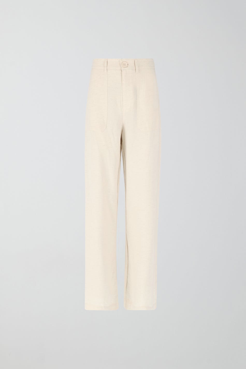 Matalavyötäröiset pellavahousut pellavasekoitteesta reisitaskuilla edessä ja takana. Pellavahousut ovat beigejä ja niissä on kaksinkertaiset saumat vyölenkillä. Niissä on raskas tvillikudos.