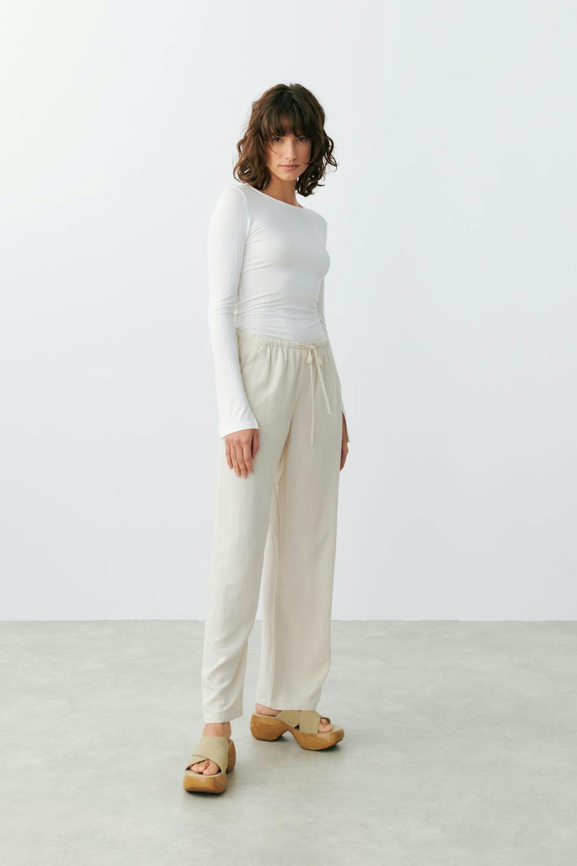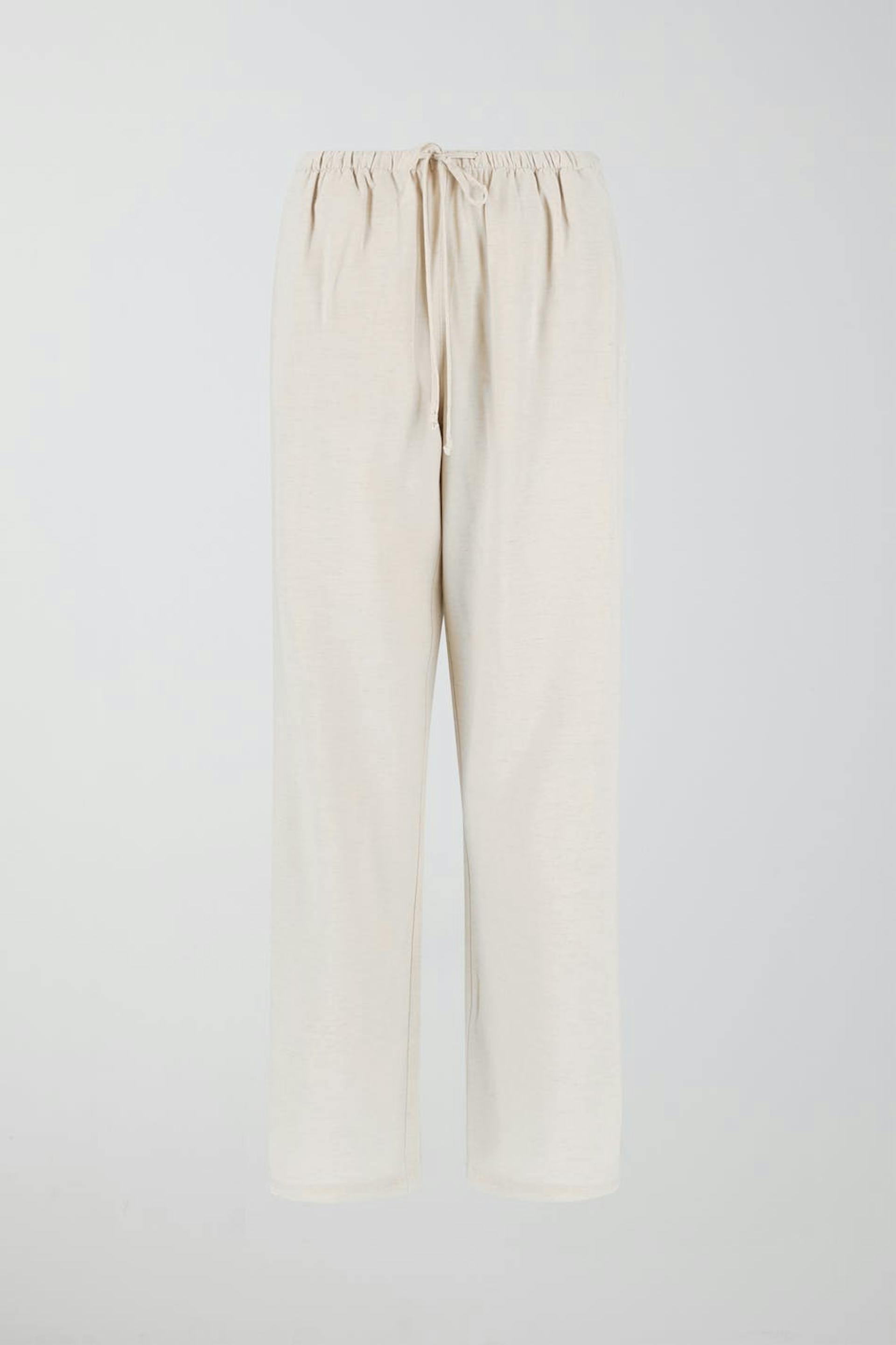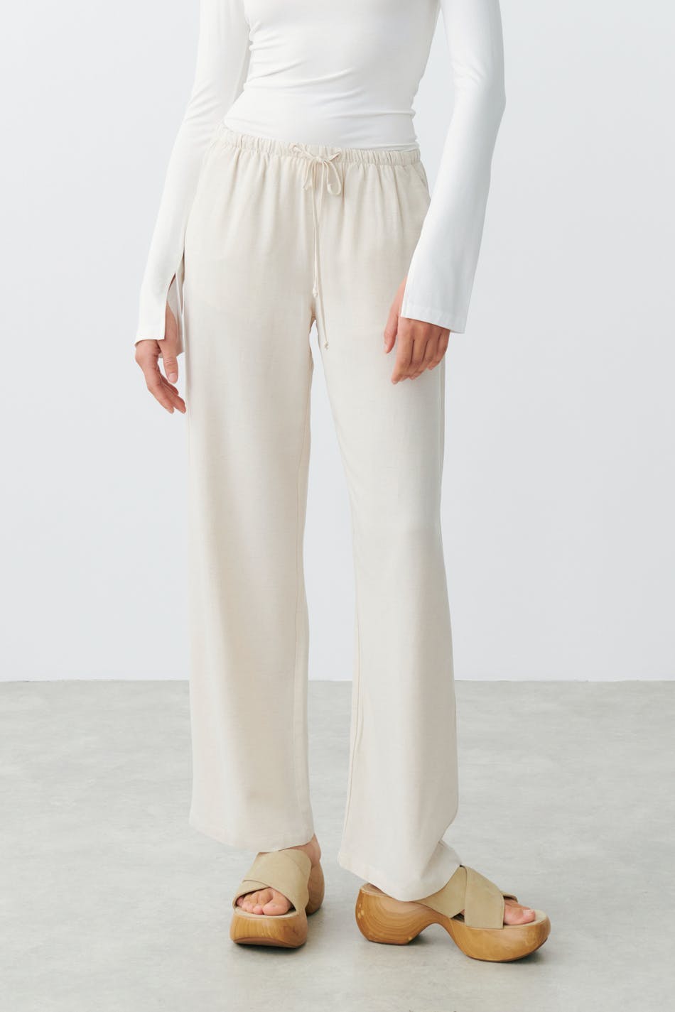 Housut pellavasekoitteesta keskikorkealla vyötäröllä. Housut ovat beigejä ja niissä on leveät lahkeet. Niissä on sivutaskut ja kapea vyötärönauha kuminauhalla ja kiristysnyörillä.