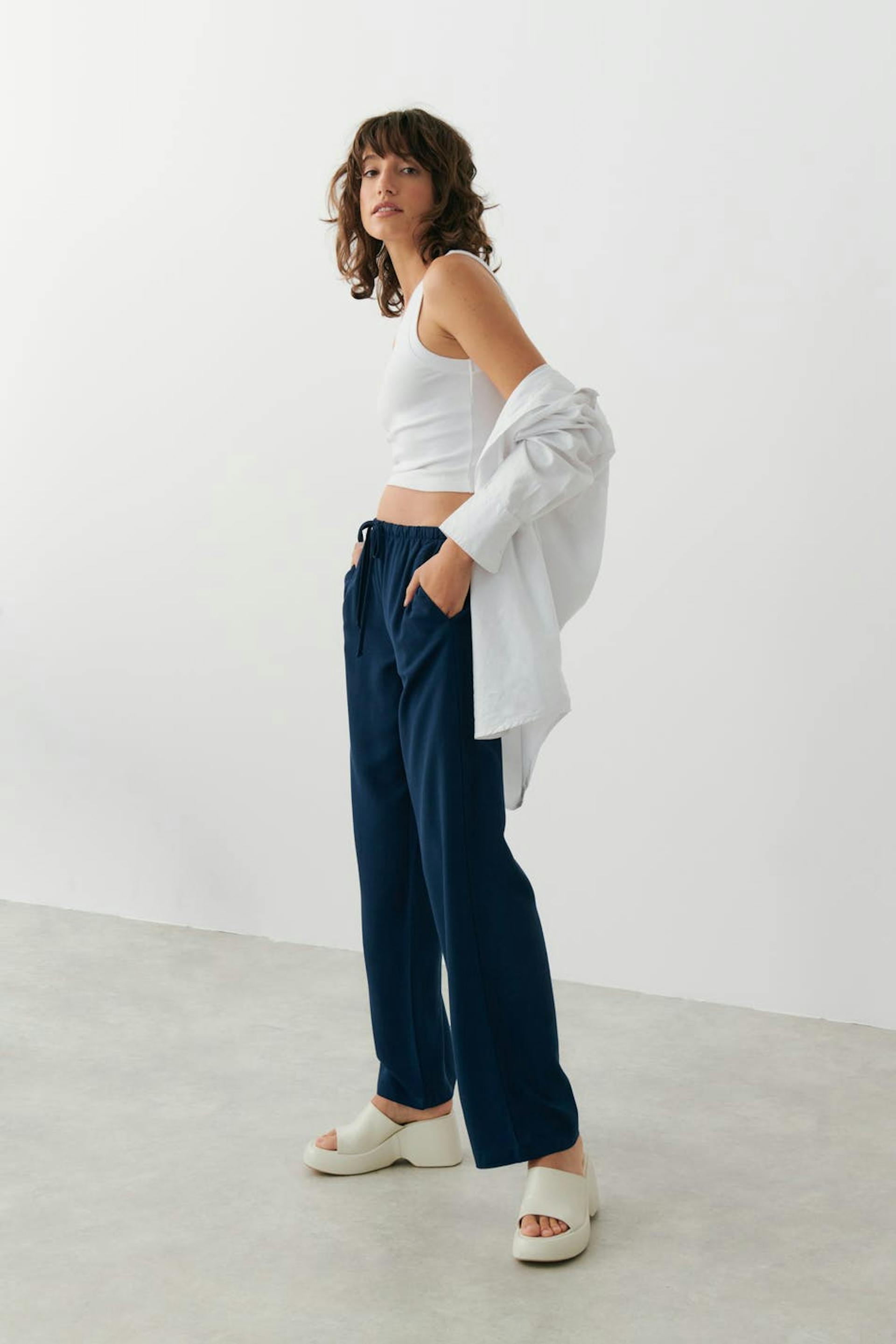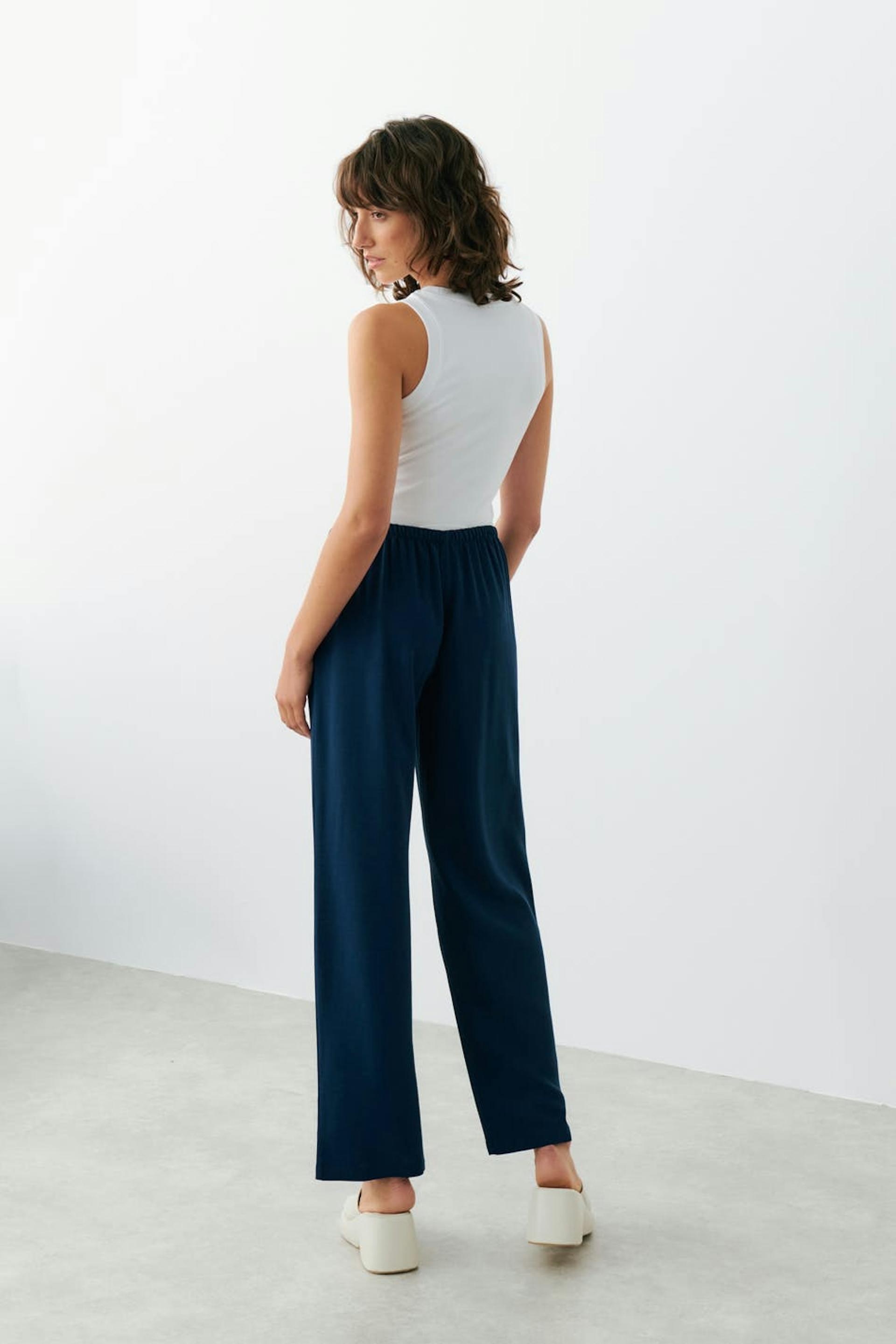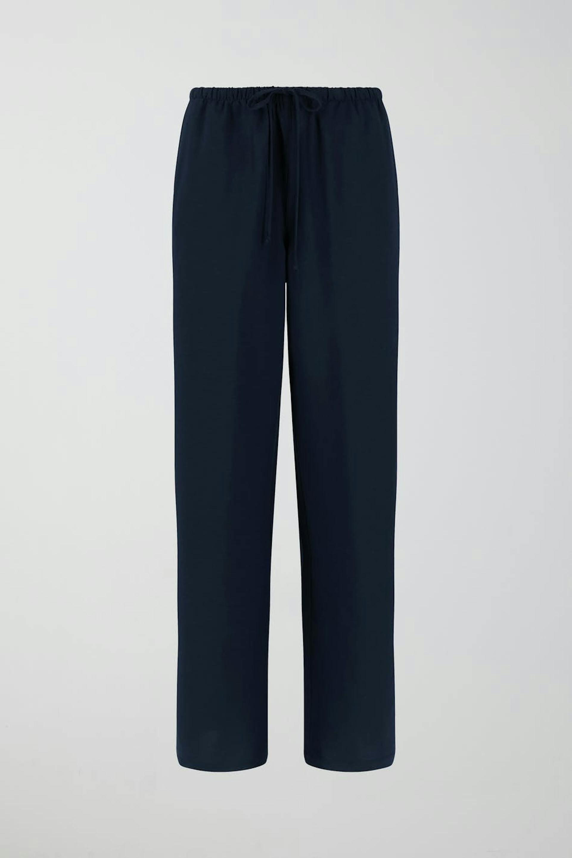 Housut pellavasekoitteesta keskikorkealla vyötäröllä. Housut ovat sinisiä ja niissä on leveät lahkeet. Niissä on sivutaskut ja kapea vyötärönauha kuminauhalla ja kiristysnyörillä.