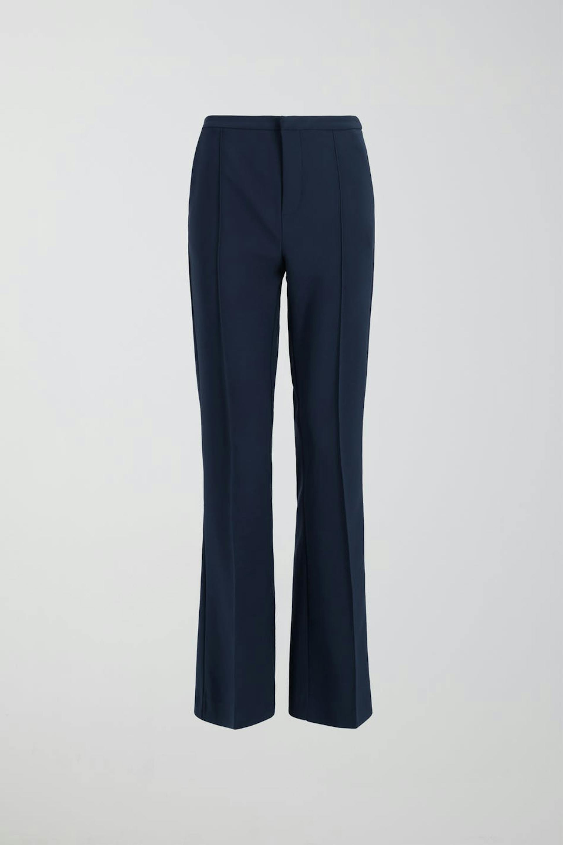 Sirot puvunhousut slim-leikkauksella. Housut ovat sinisiä ja niissä on korkea vyötärö. Niissä on flare-lahkeet, vetoketjusepalus ja kahden kantin tasku takana. Sinulle, joka olet enintään 160 cm pitkä.