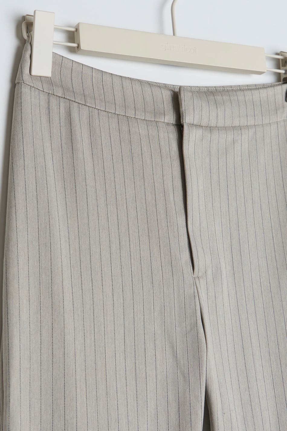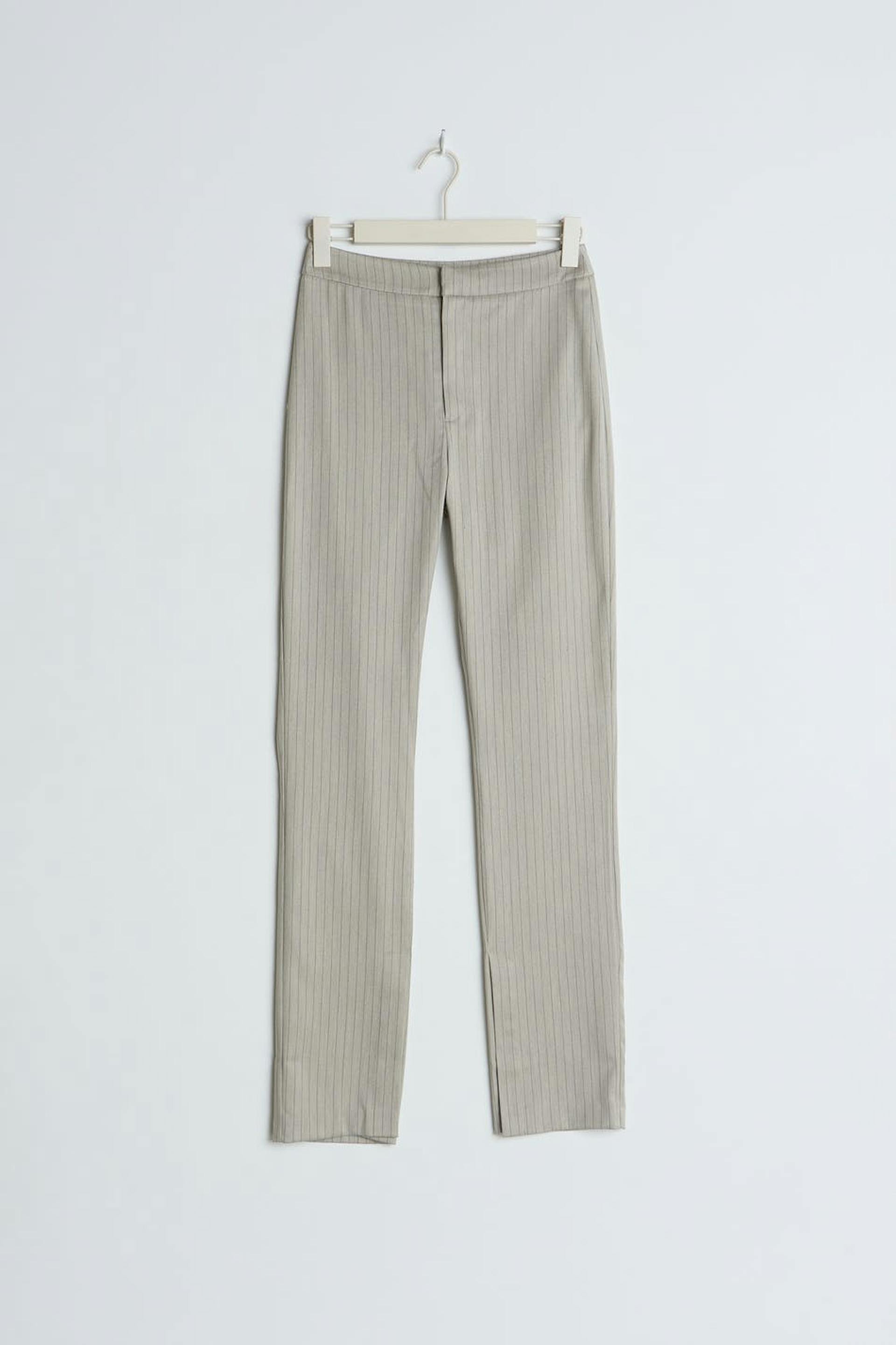 Liituraidalliset puvunhousut halkiolla lahkeiden lopuissa. Housut ovat juhliin täydellisesti sopivia ja beigejä ja niissä on sepalus vetoketjulla.