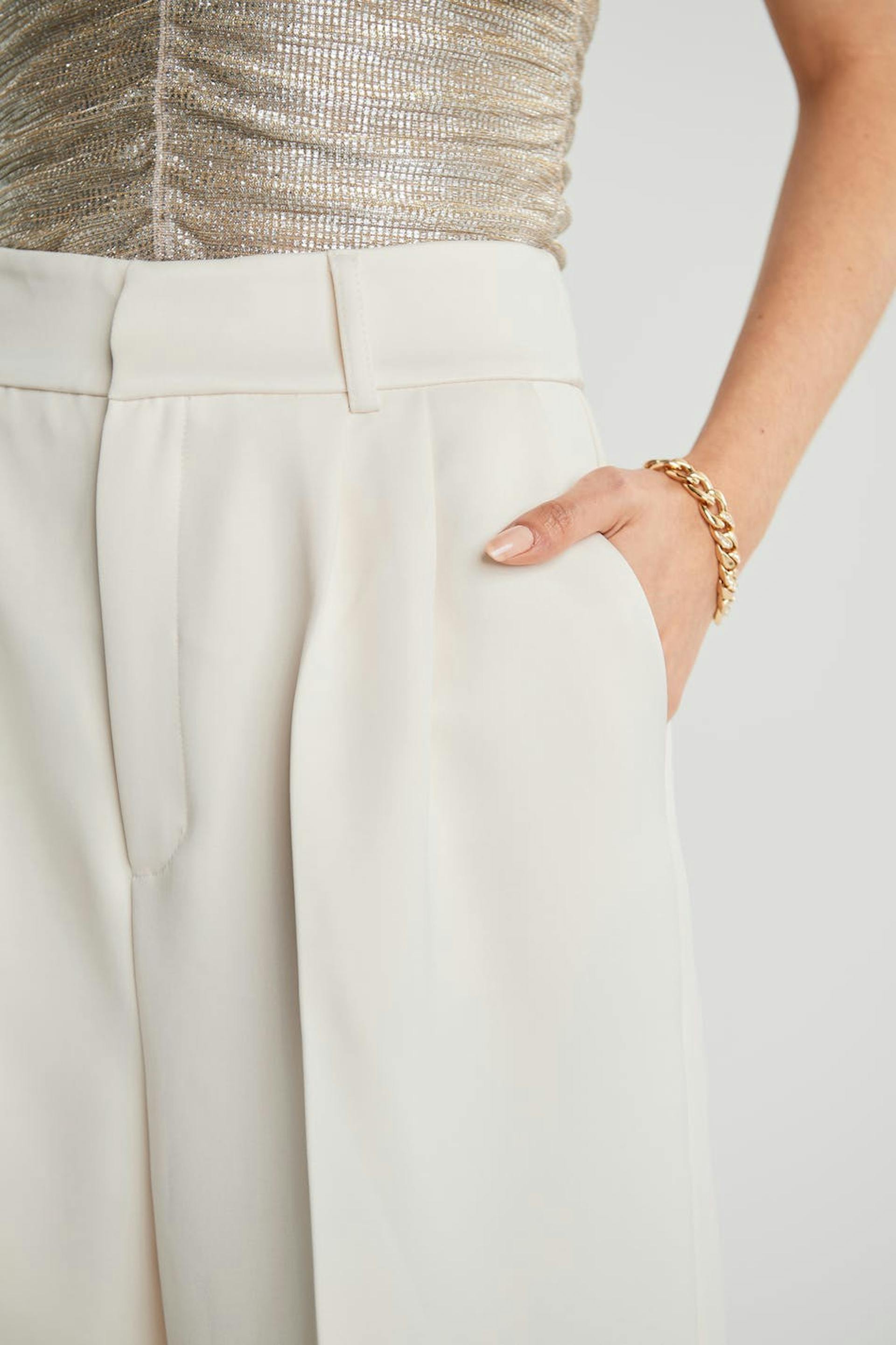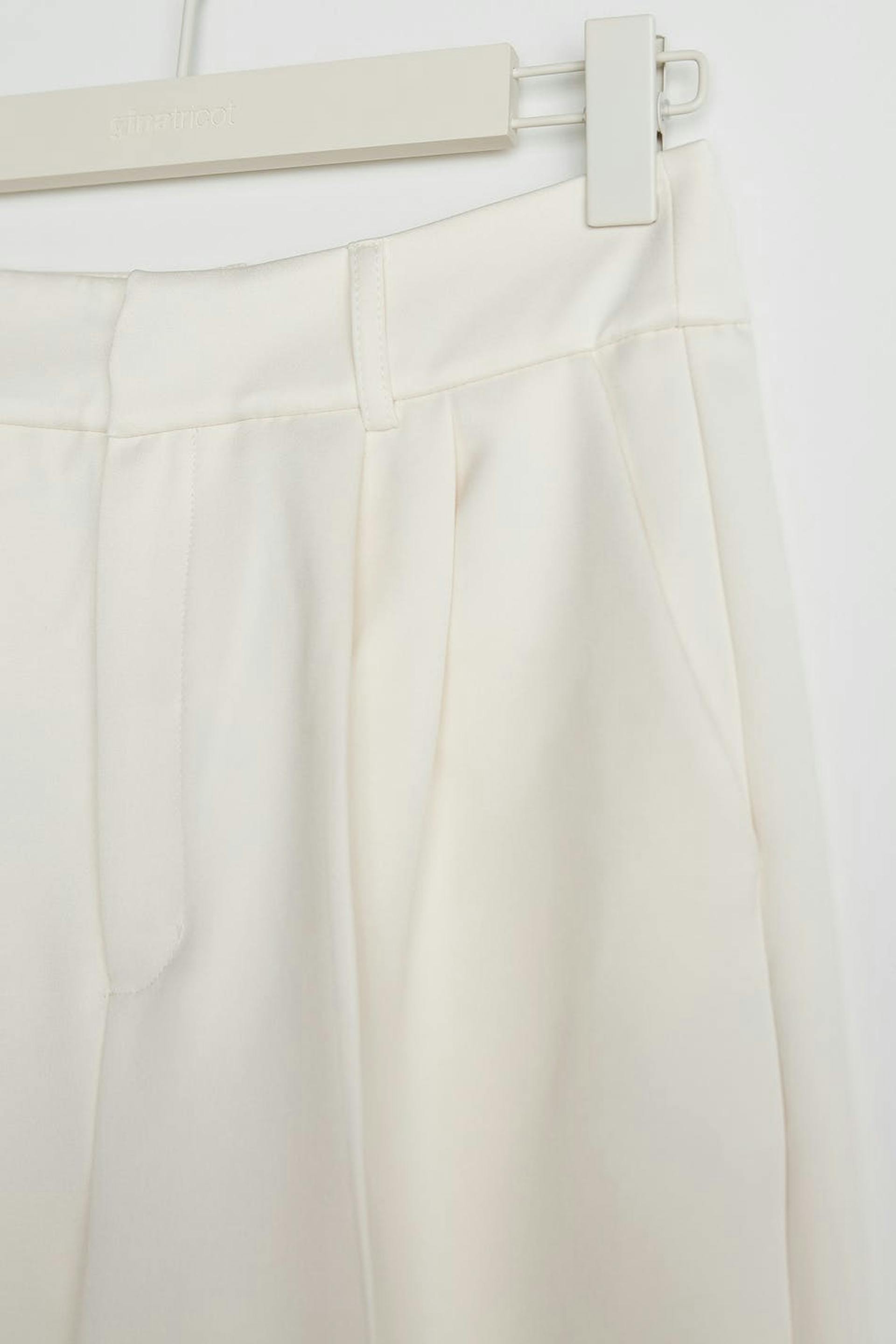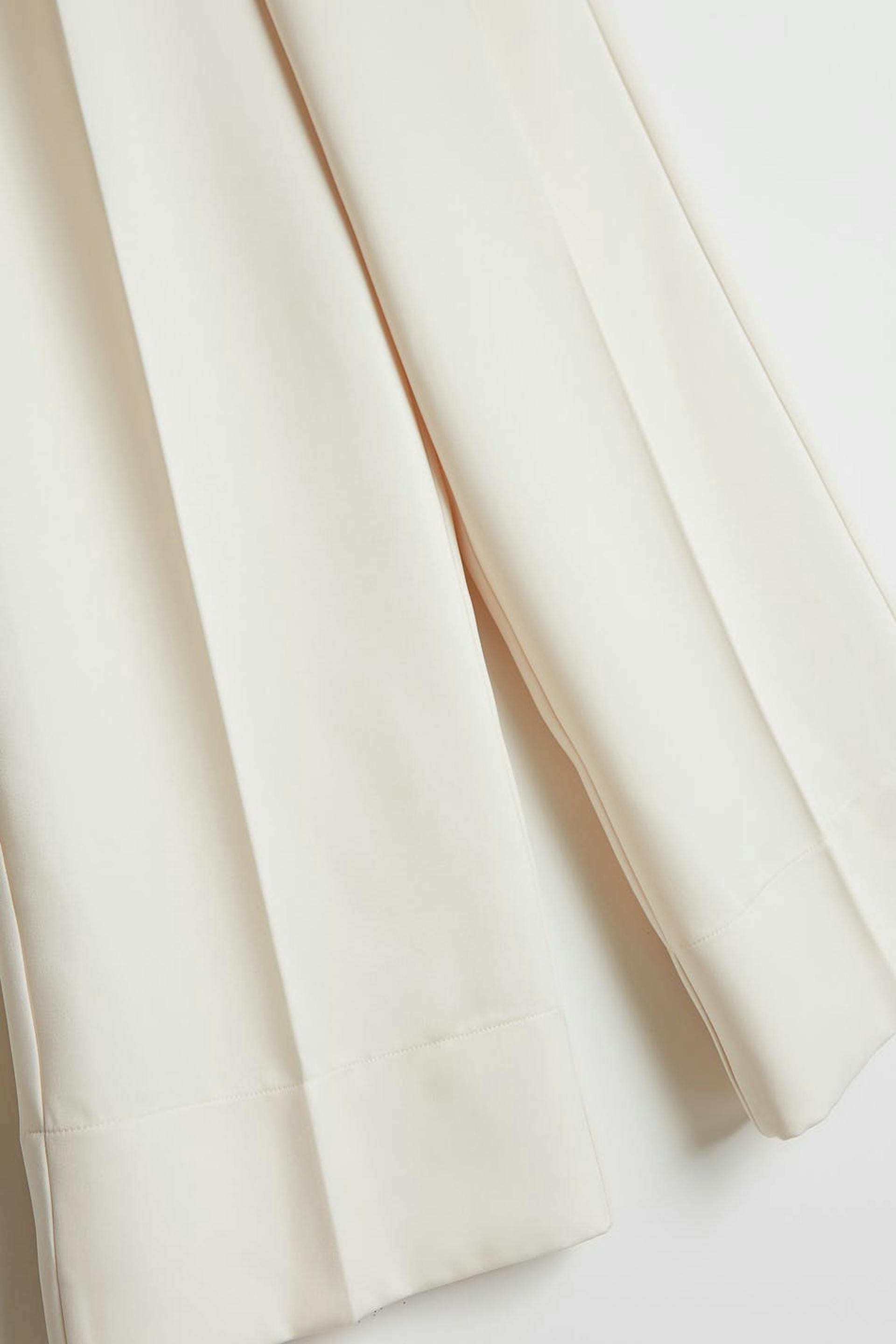 Housut leveillä, suorilla housujen lahkeilla laskoksella edessä. Housut ovat valkoisia ja niissä on sivutaskut. Ne valmistetaan satiinesta.