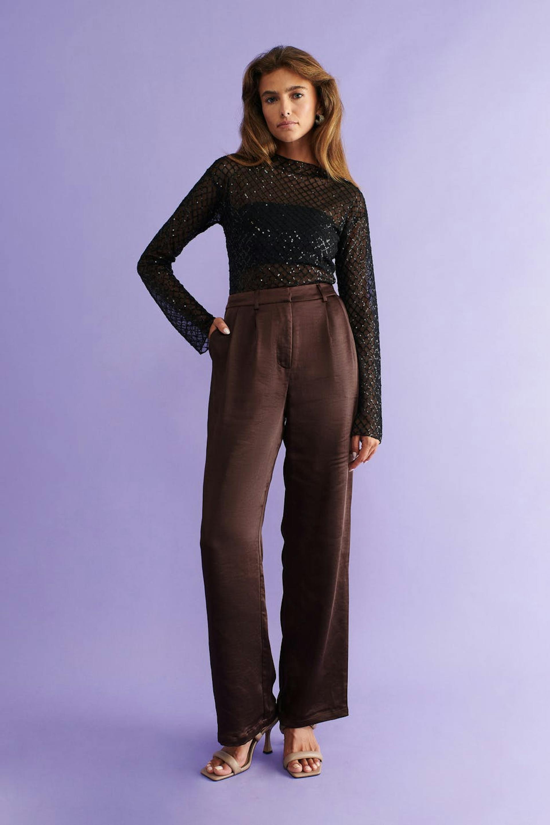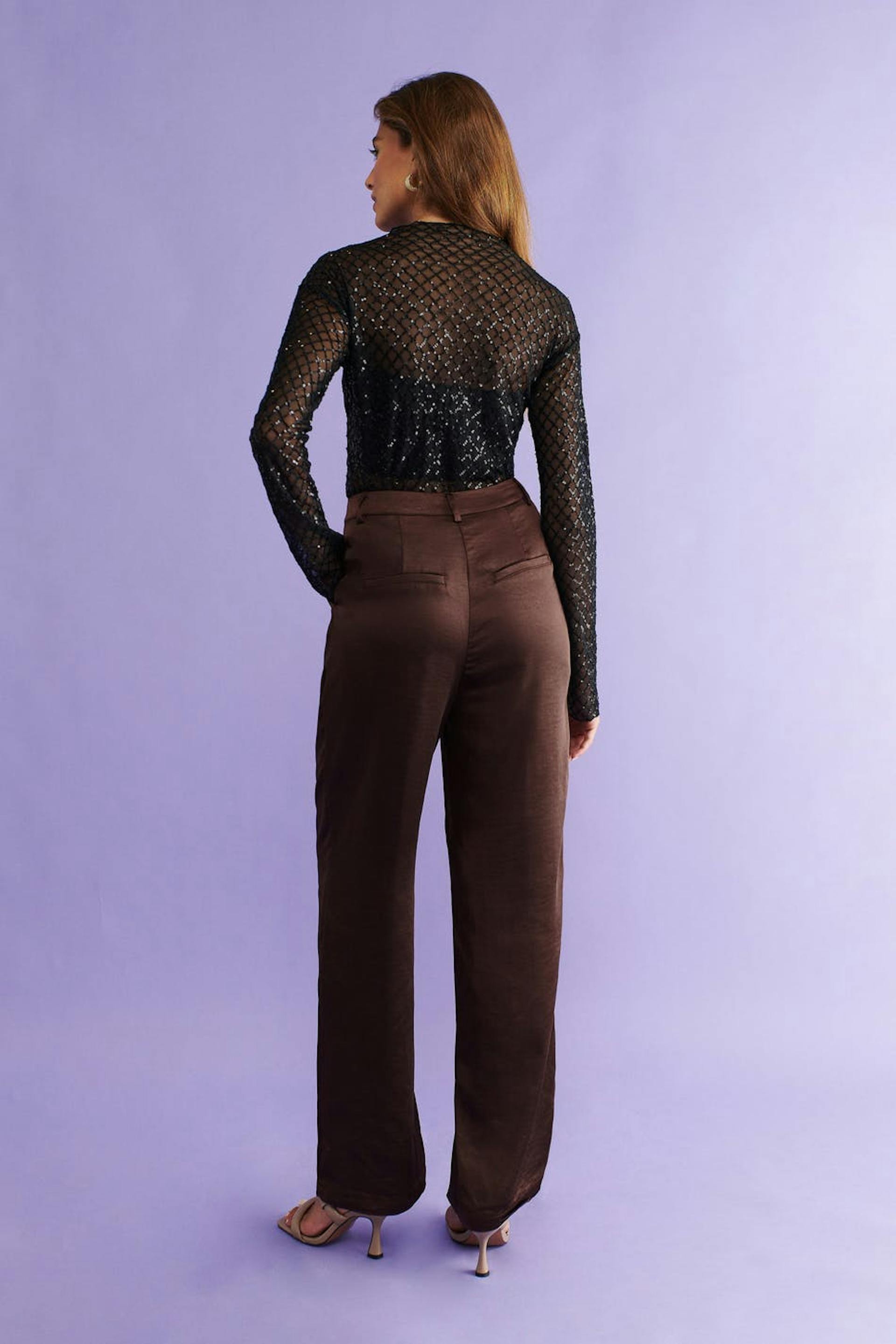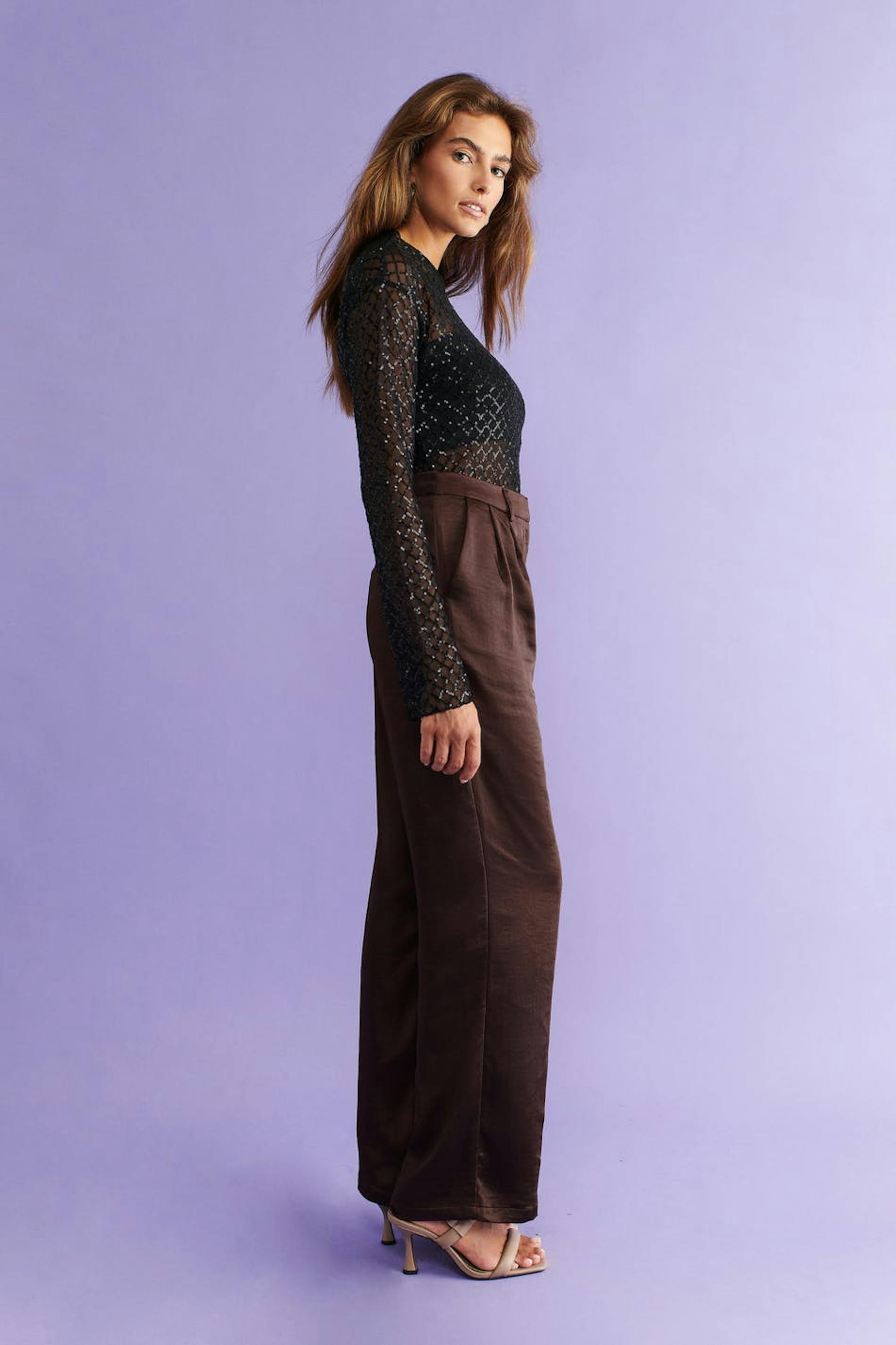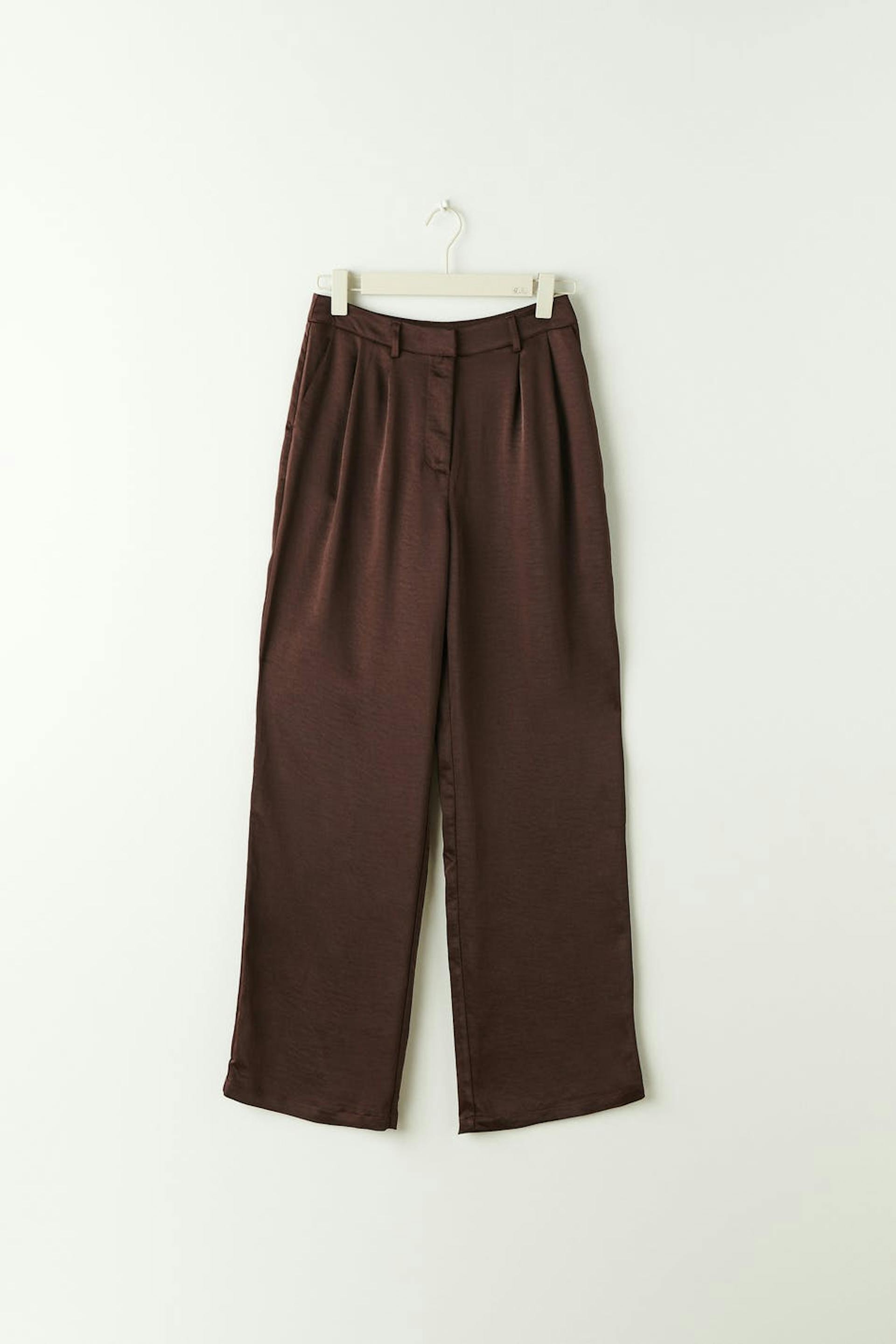 Satiinihousujet vekeillä edessä. Housut ovat ruskeita ja niissä on normaali leikkaus. Niissä on korkea vyötärö, vinot sivutaskut, valetaskut takana ja vetoketjusepalus hakaskiinnityksellä.