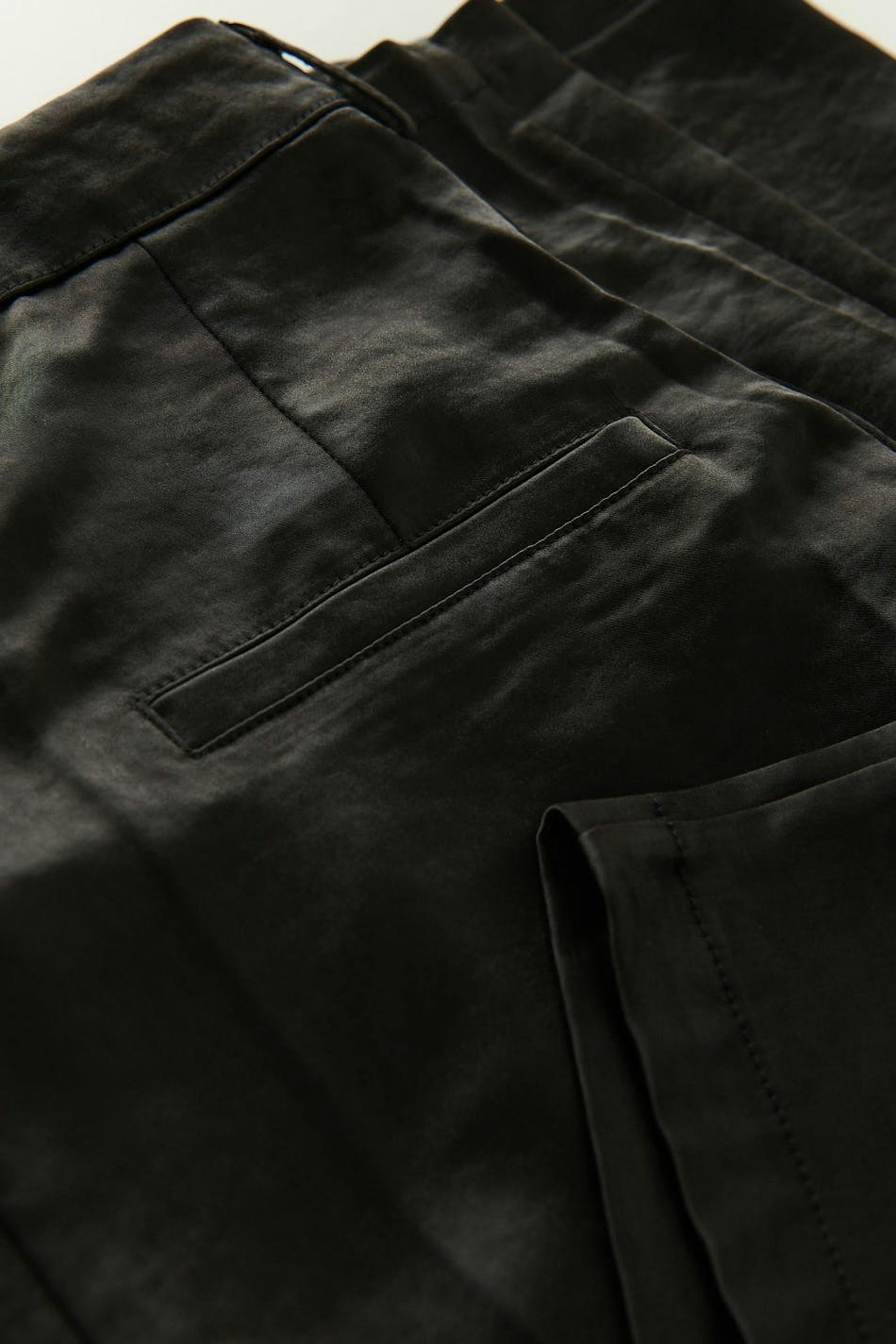 Satiinihousujet vekeillä edessä. Housut ovat mustia ja niissä on normaali leikkaus. Niissä on korkea vyötärö, vinot sivutaskut, valetaskut takana ja vetoketjusepalus hakaskiinnityksellä.
