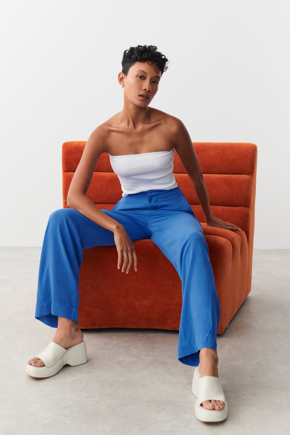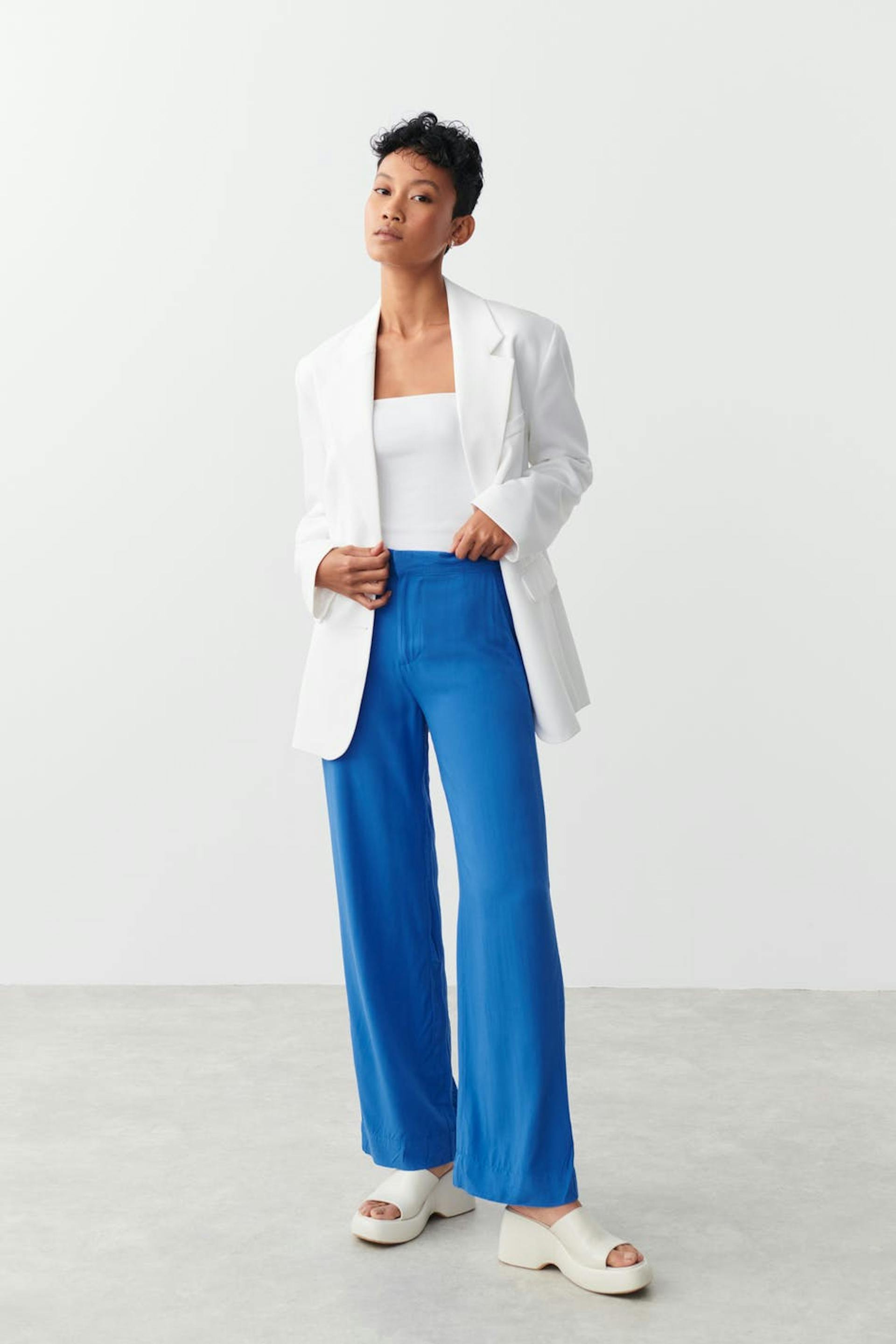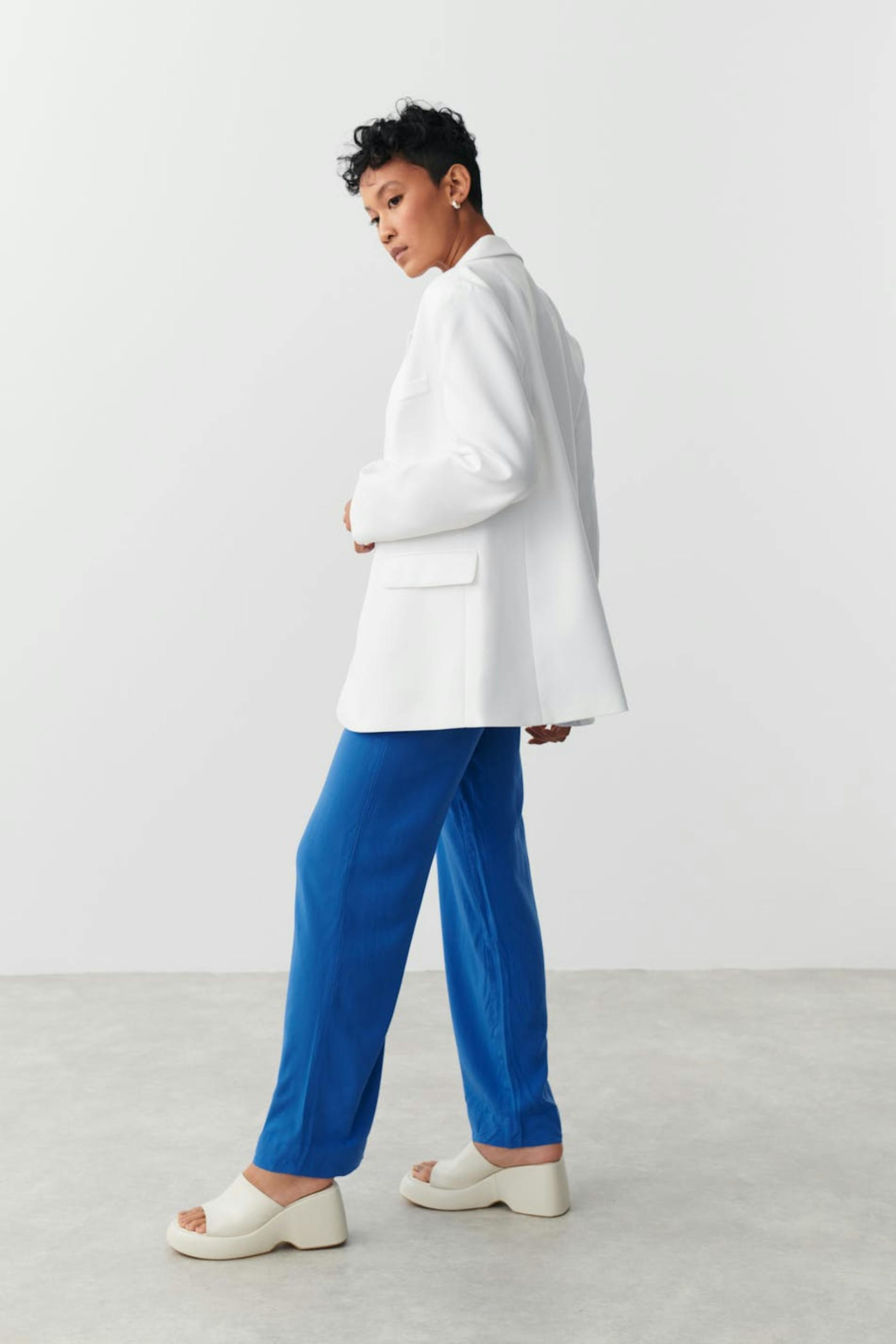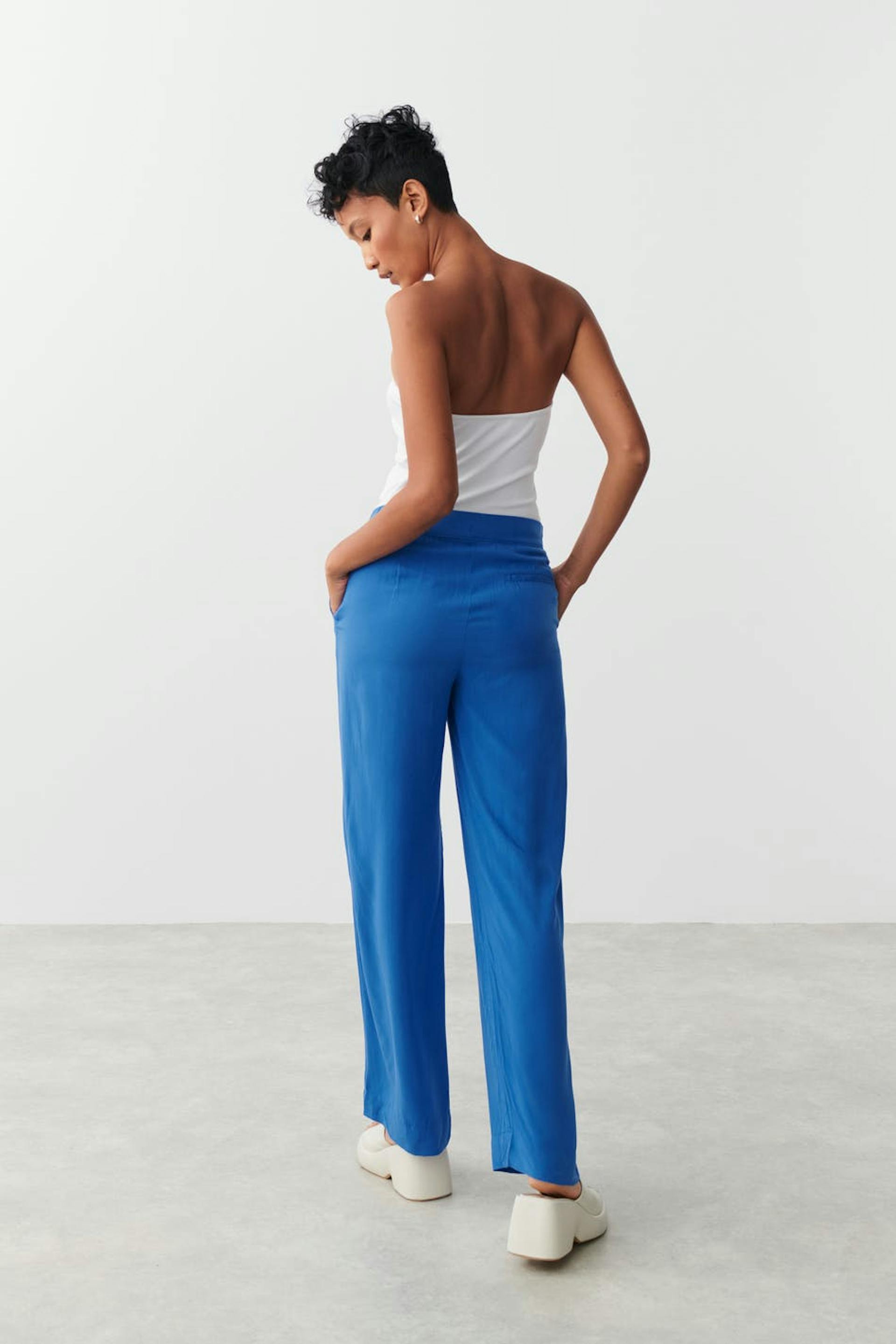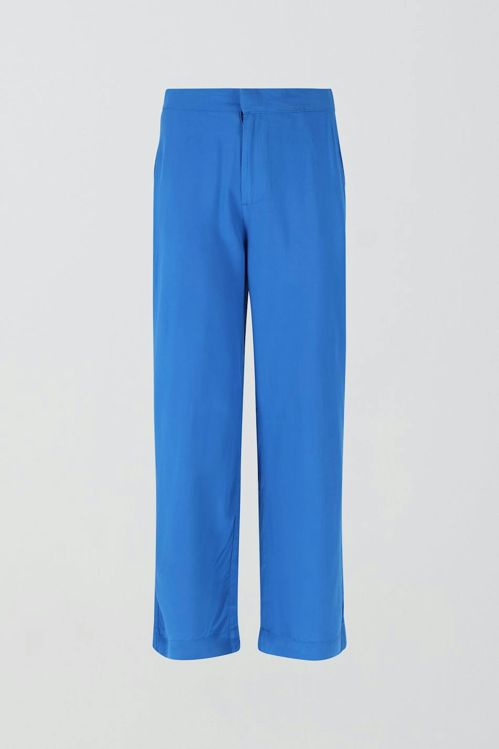 Kudotut housut vekeillä edessä. Housut ovat sinisiä ja niissä on sivutaskut. Niissä on väljä malli, suorat lahkeet ja kuminauha vyötärön takaosassa.