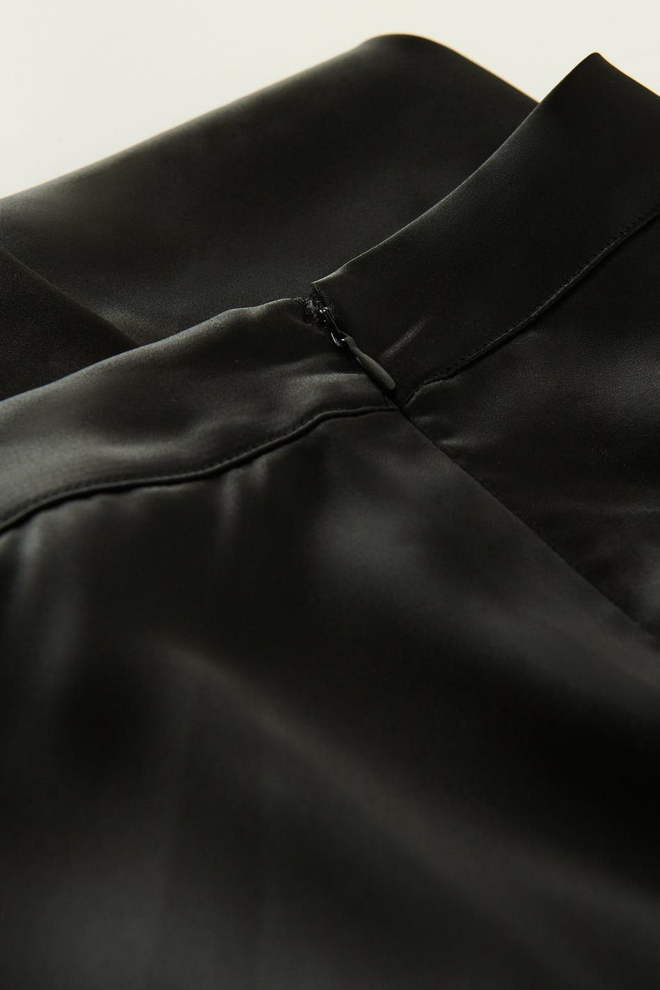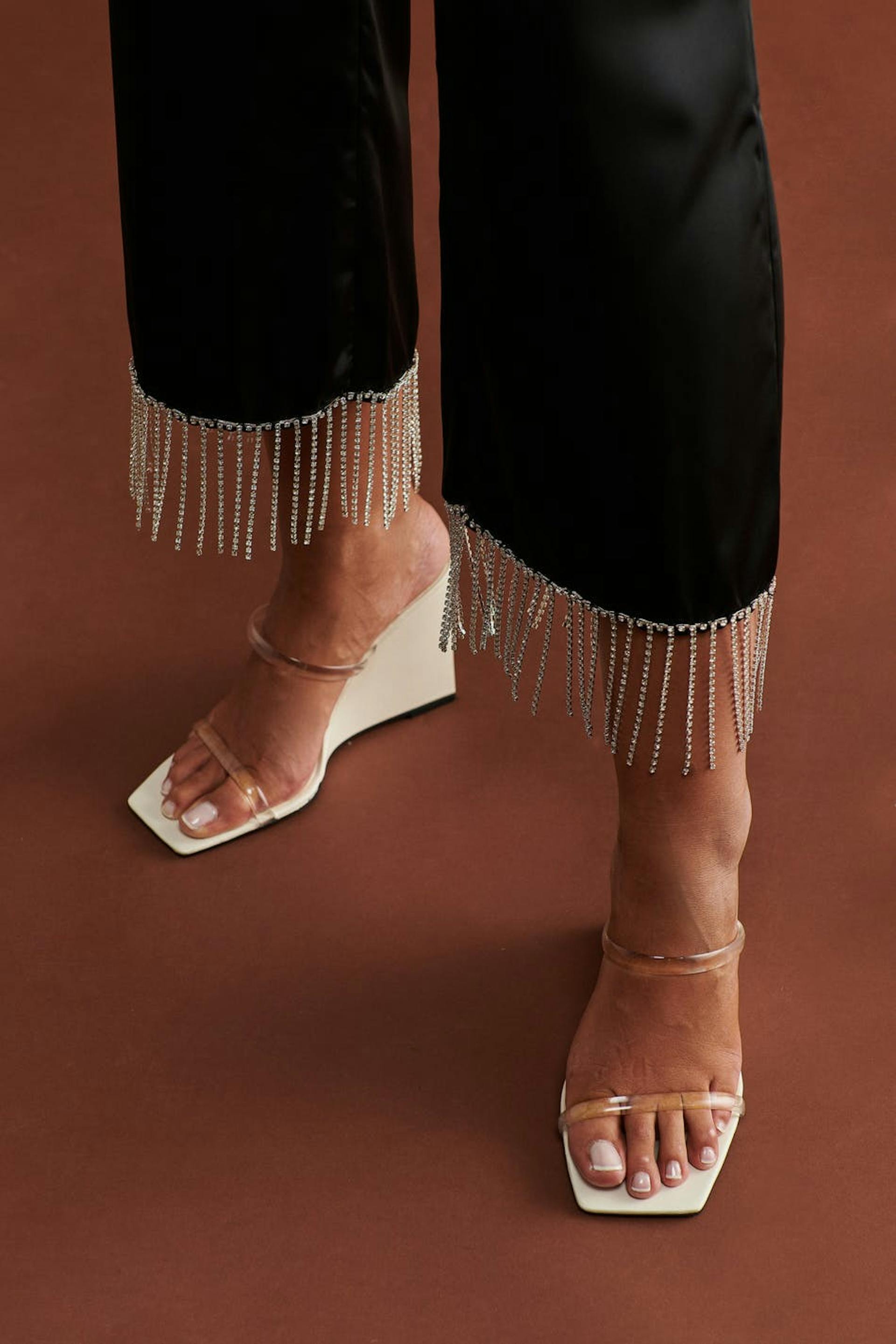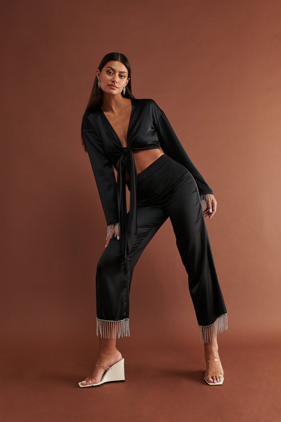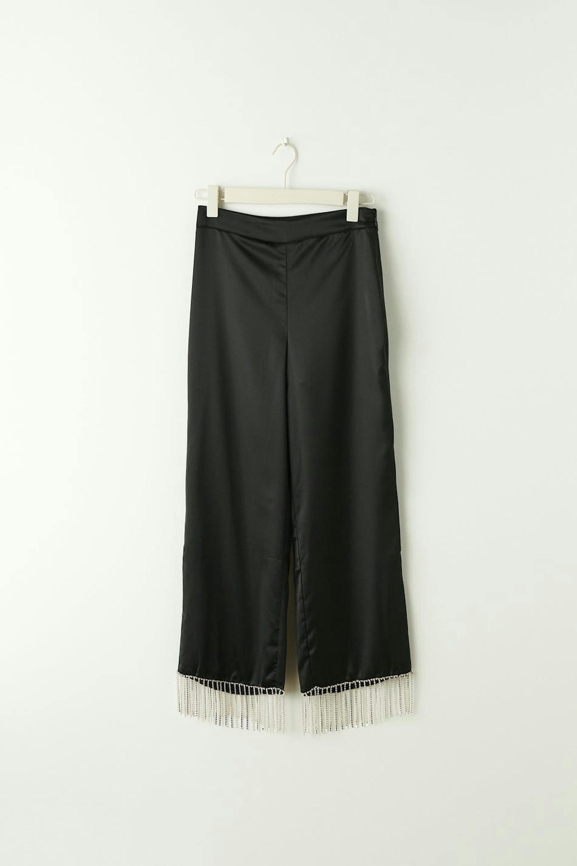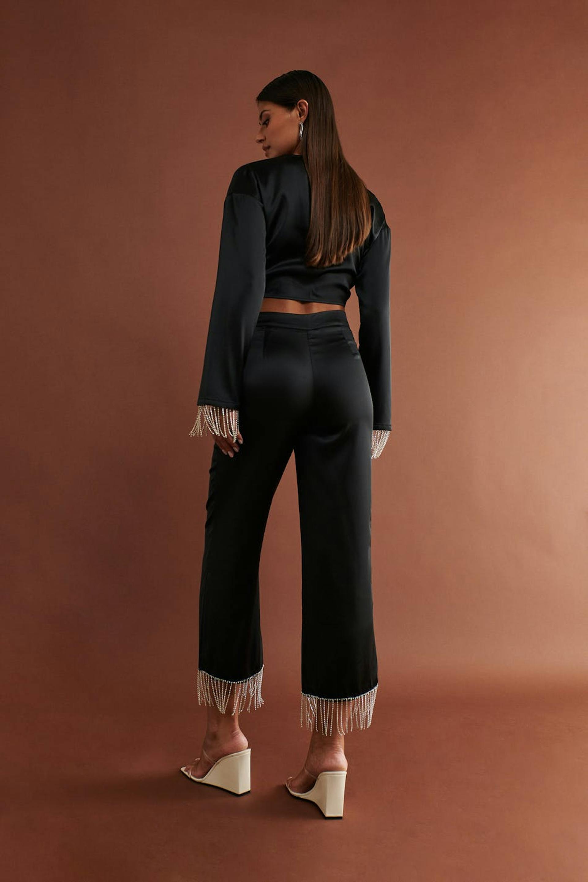 Housut satiinista vartalonmyötäisellä istuvuudella. Housut ovat mustia ja niissä on suora malli. Niissä on vetoketju sivusaumassa ja hapsuyksityiskohdat strassikoristeella lahkeiden lopuissa.