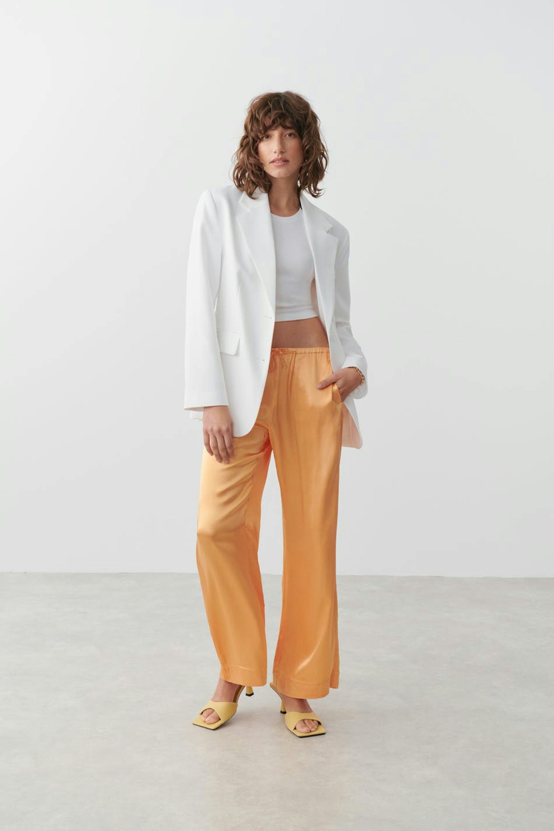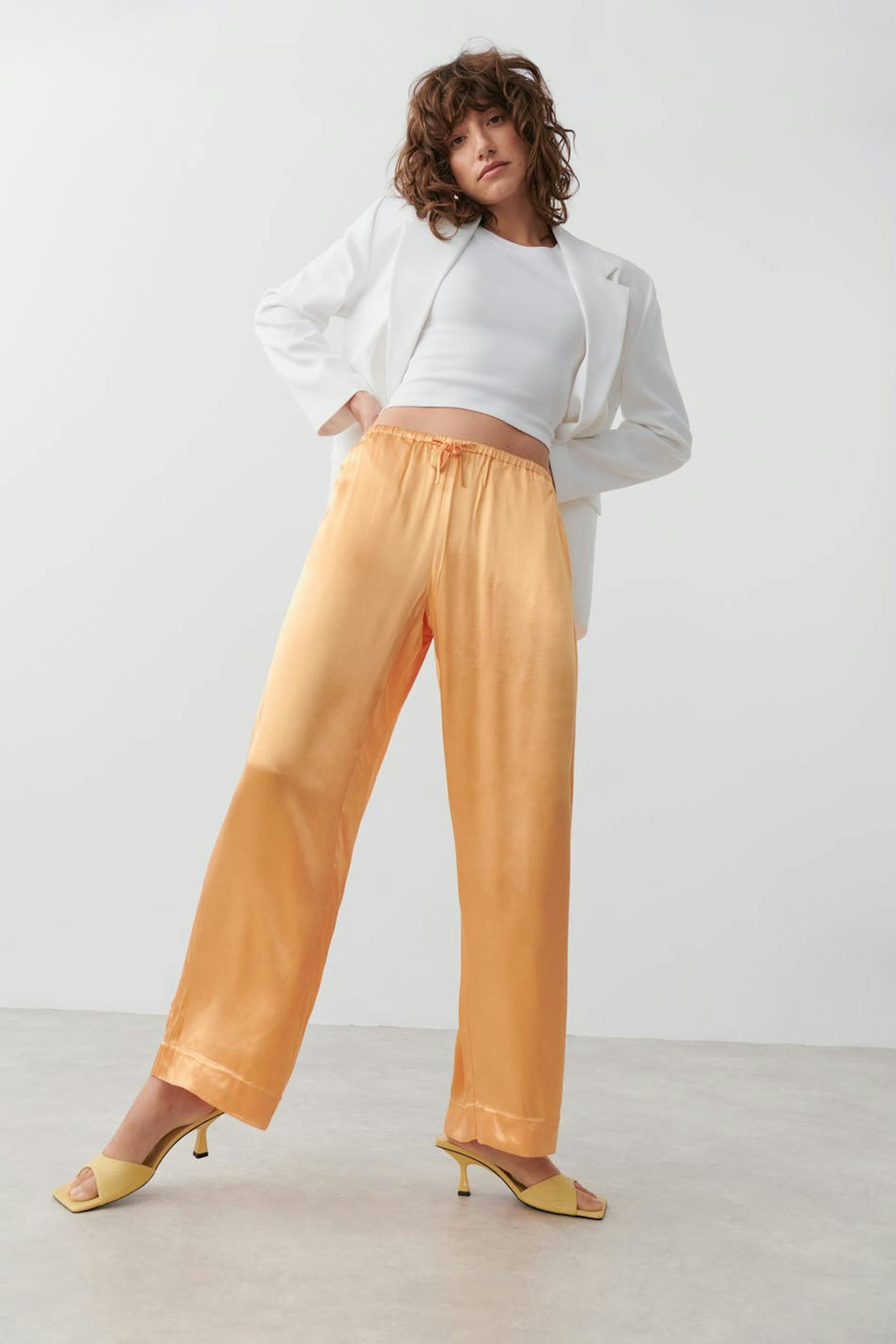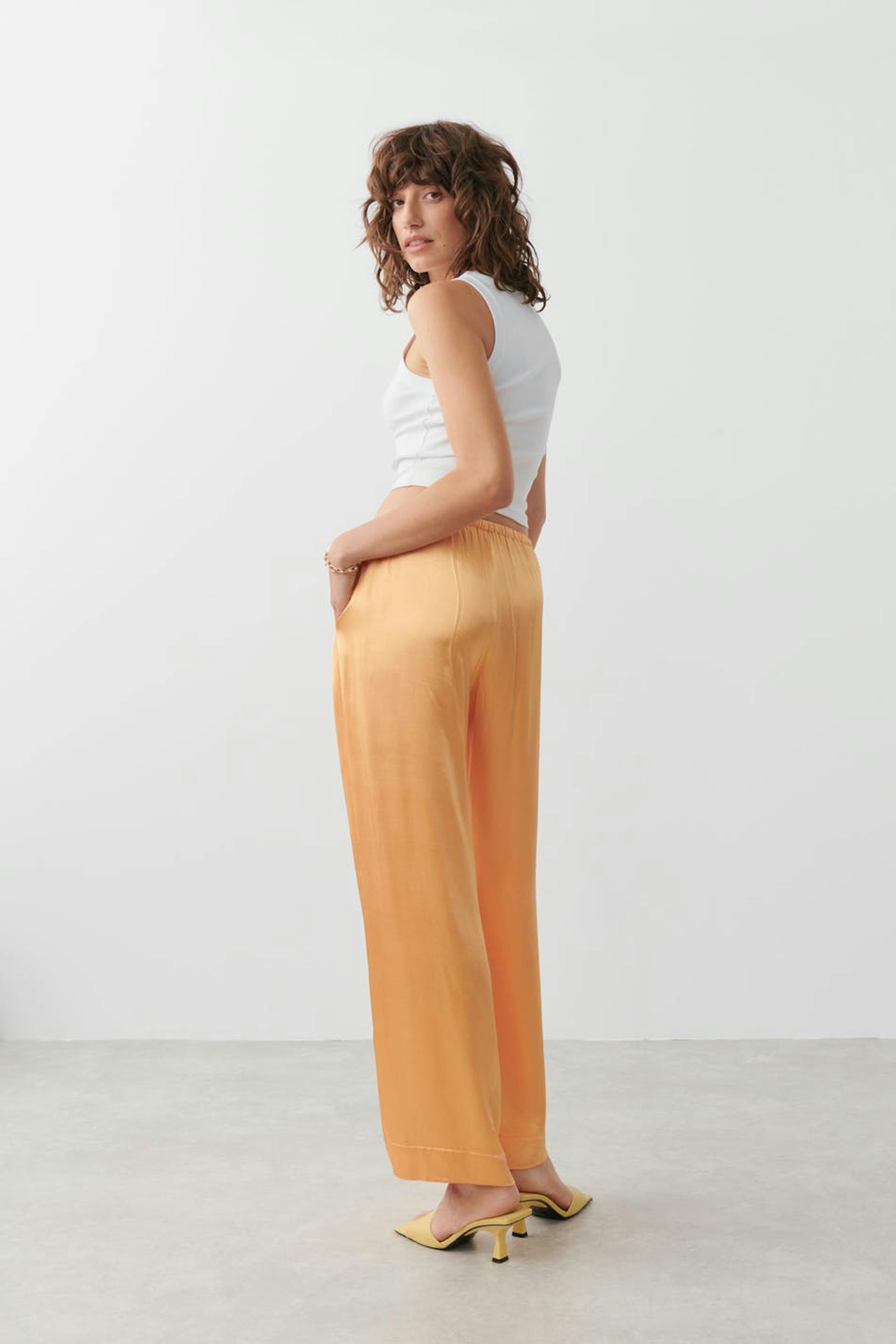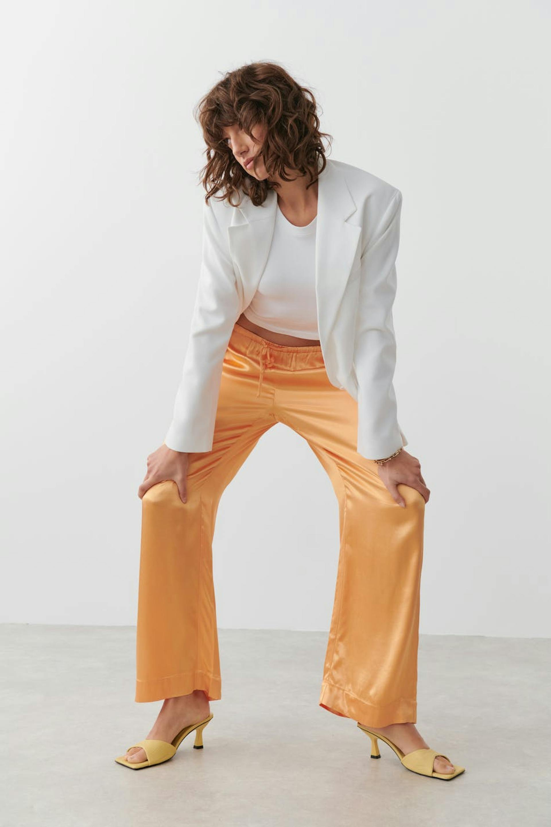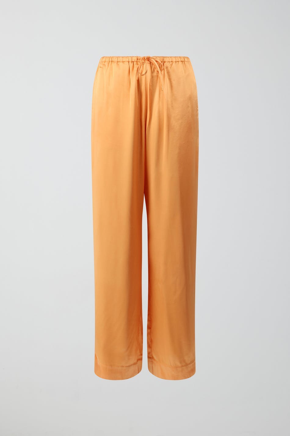 Housut satiinista rennolla istuvuudella. Housut ovat oransseja ja niissä on kuminauha kiristysnyörillä vyötäröllä. Niissä on taskut edessä.
