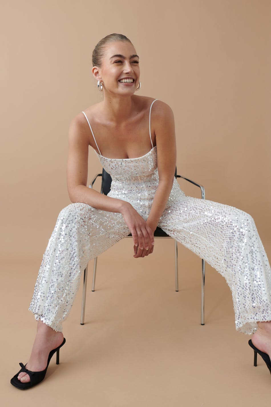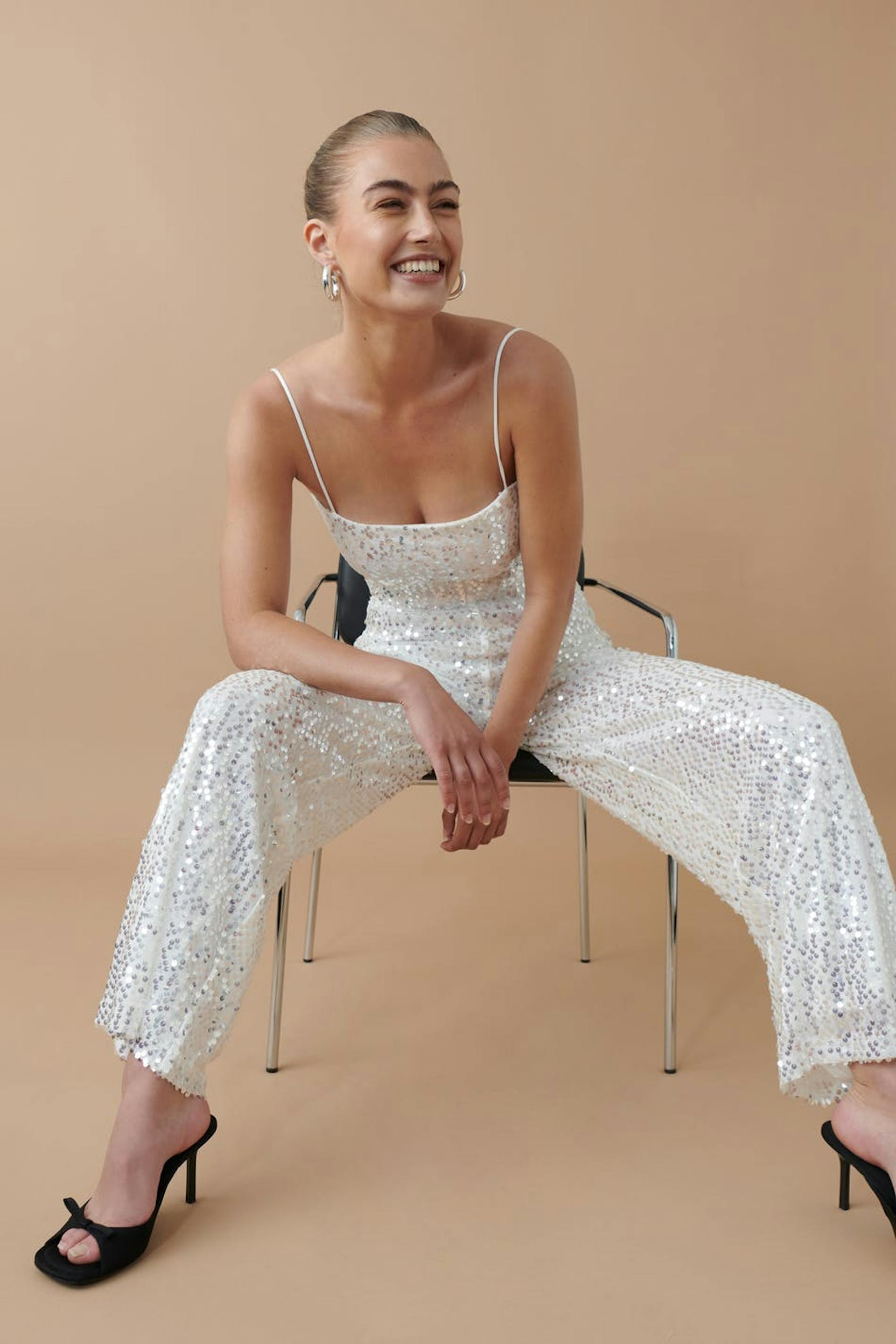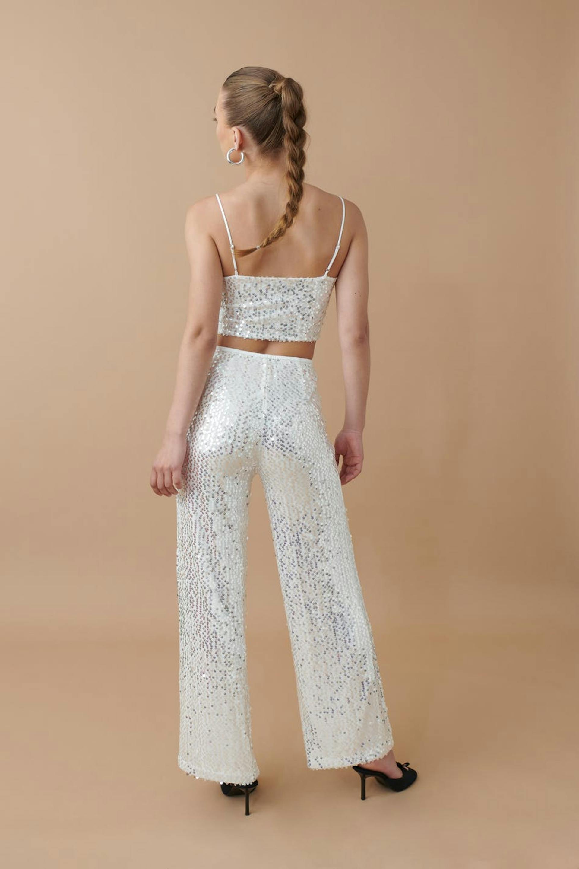 Täysin vuoratut paljettihousut kuminauhalla vyötäröllä. Housut ovat valkoisia ja niissä on löysä, suora istuvuus.