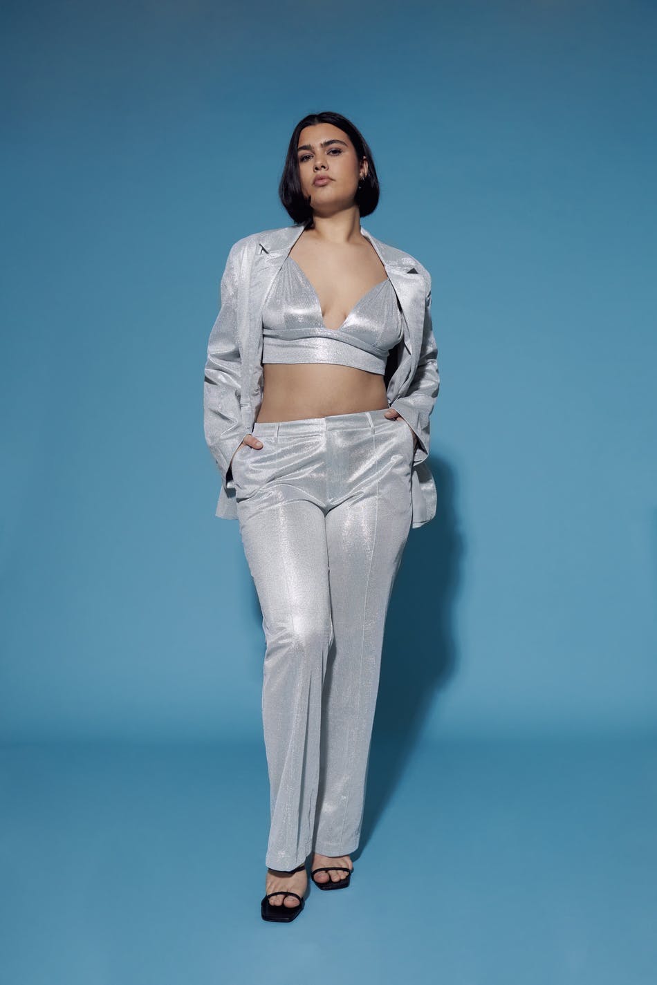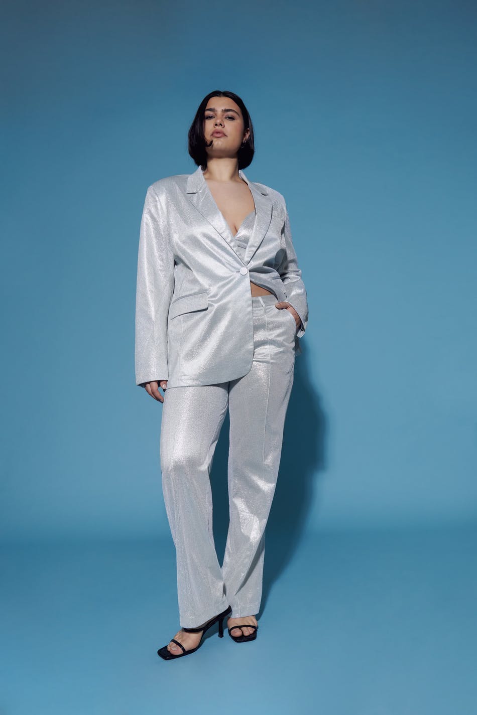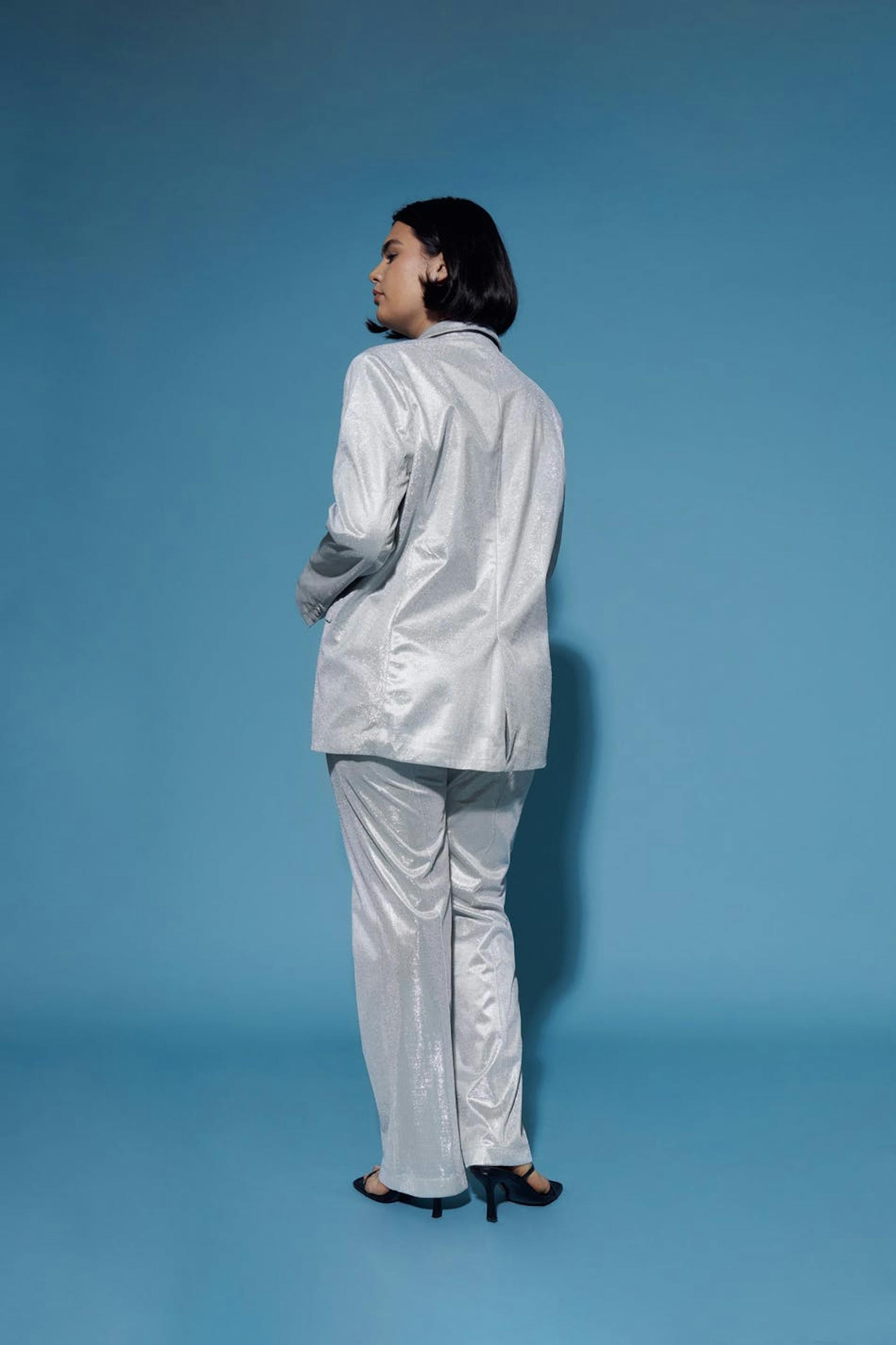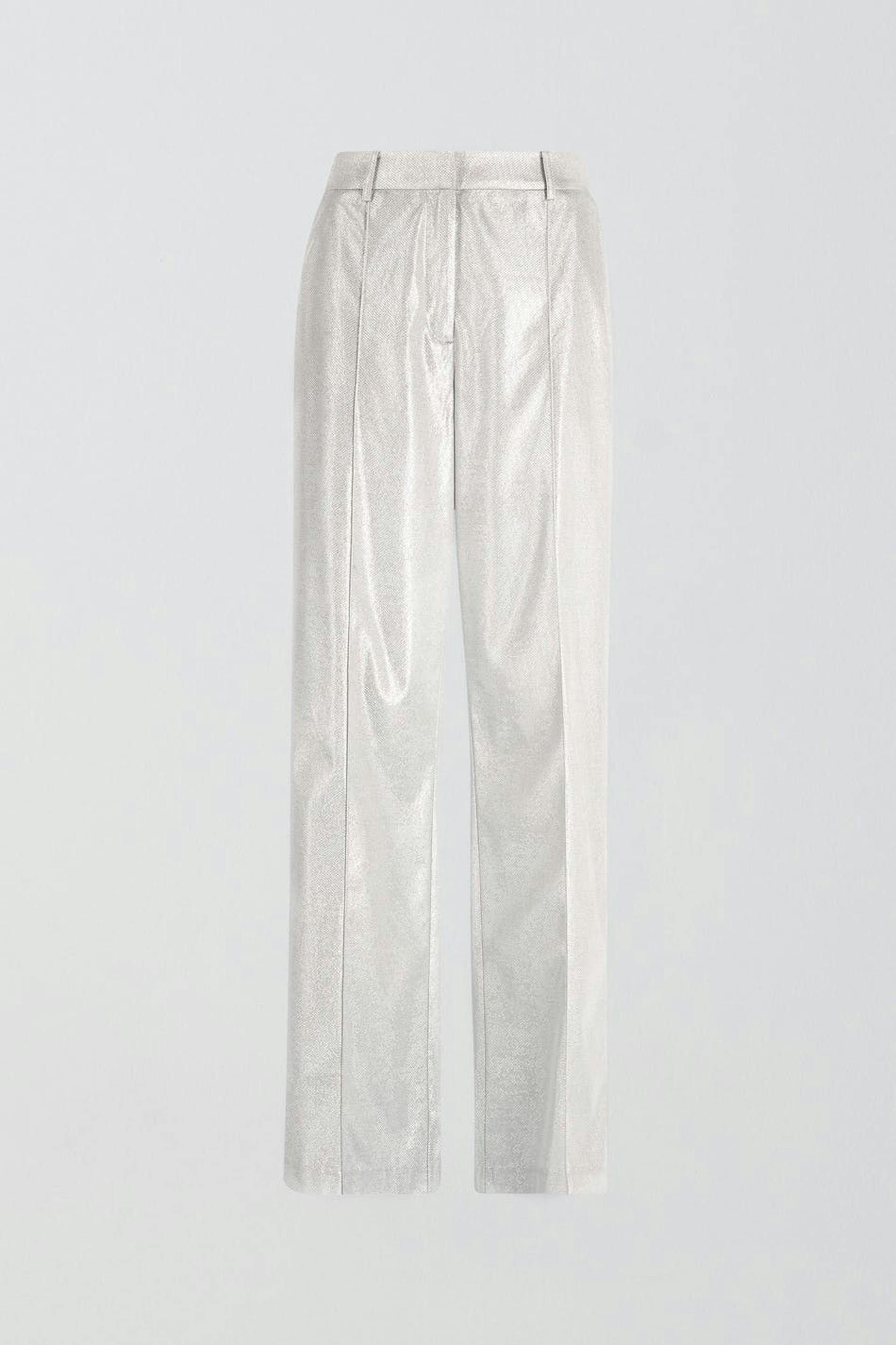 Puvunhousut suoralla mallilla. Housut ovat hopeita ja niissä on sivutaskut. Niissä on vetoketjusepalus, takataskut ja vyötärönauha vyölenkeillä.