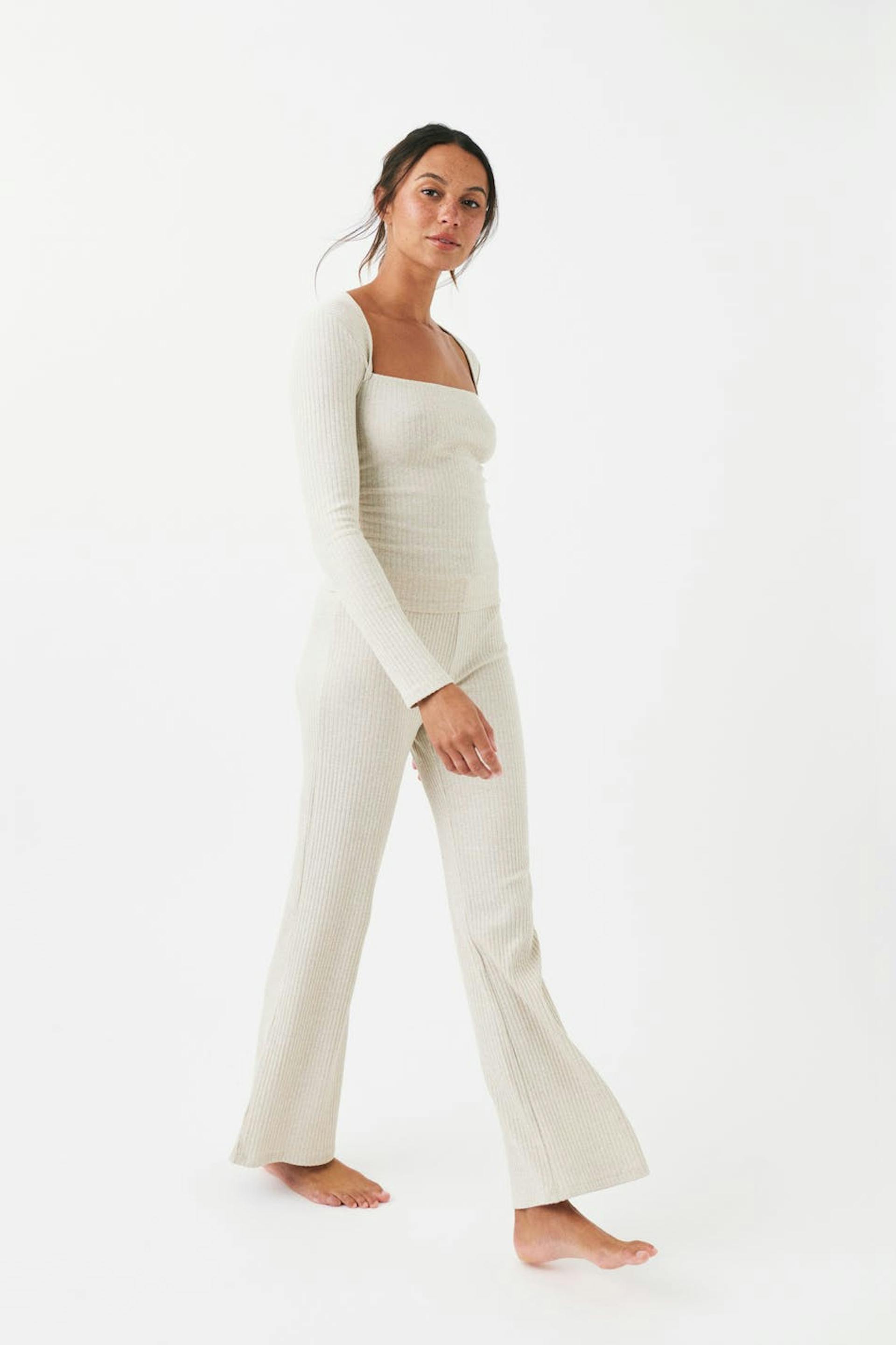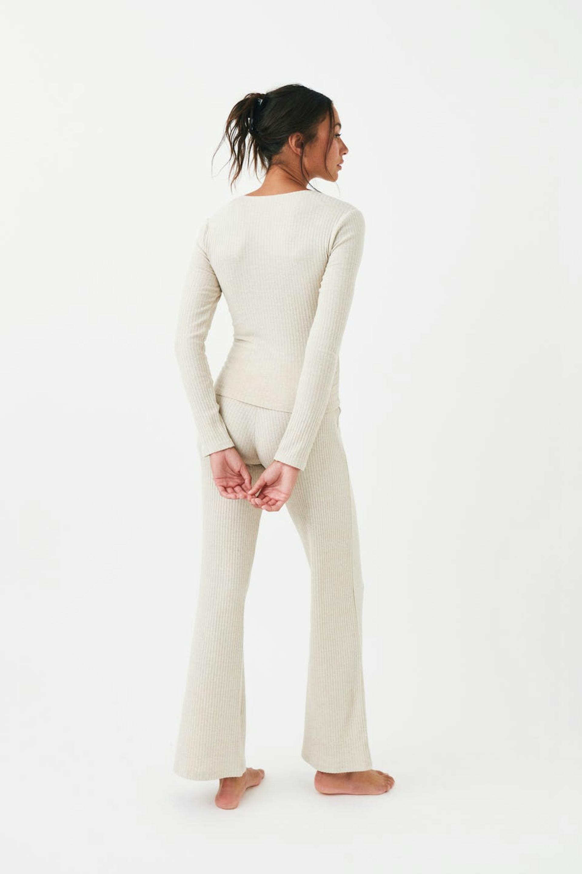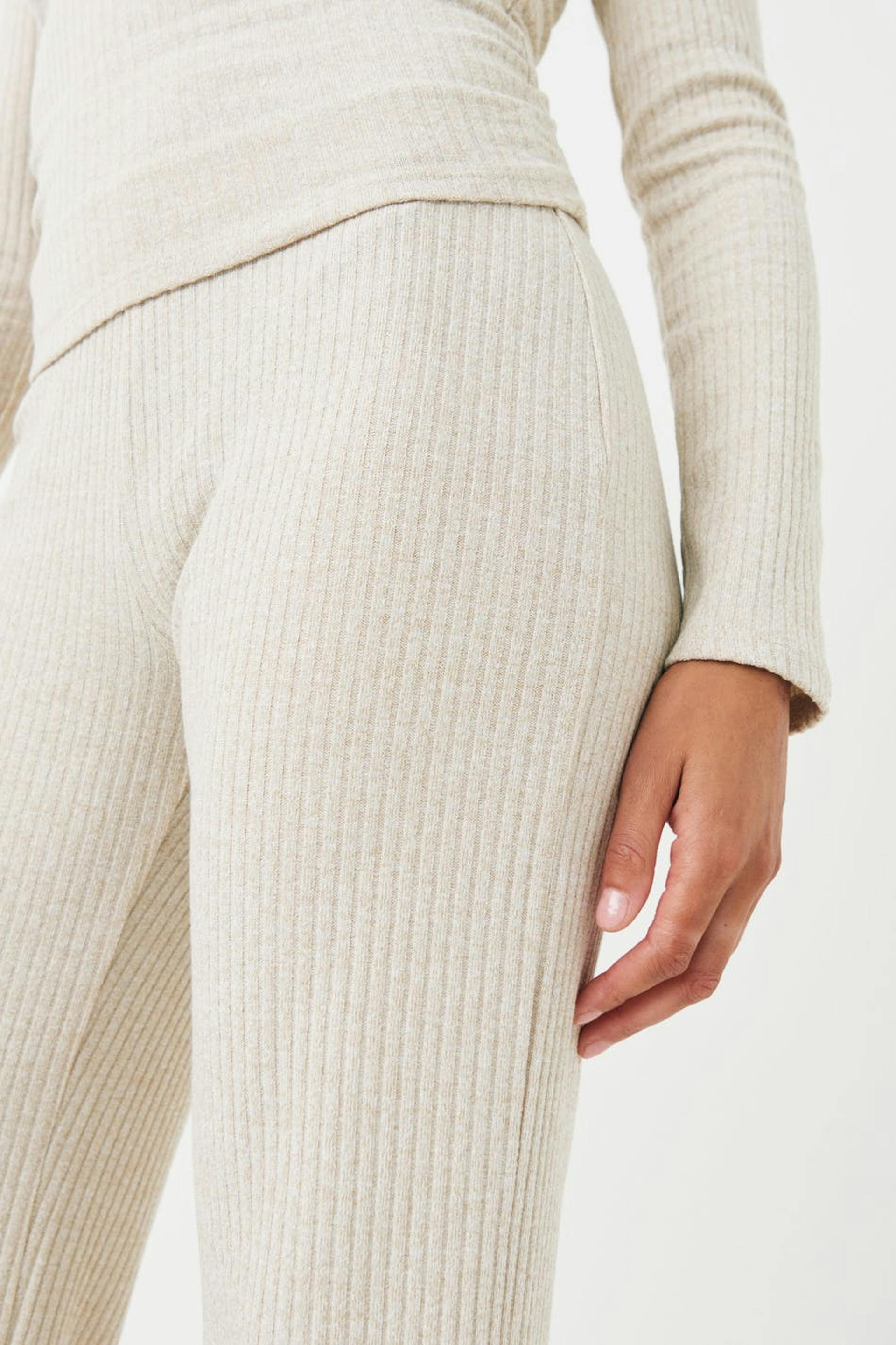 Ribatut housut matalalla vyötäröllä. Housut ovat beigejä ja niissä on normaali leikkaus. Niissä on kuminauha vyötäröllä ja normaali pituus.