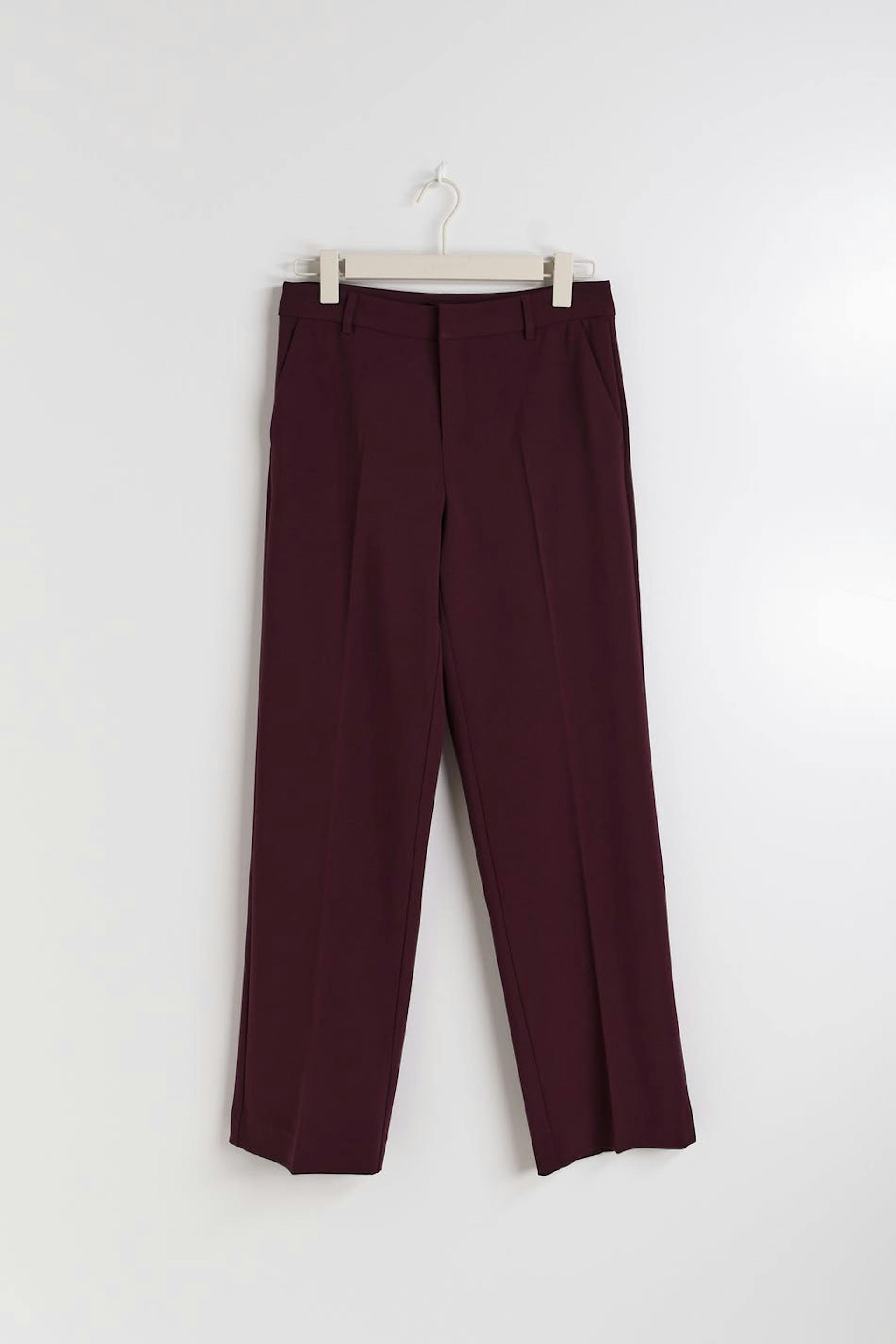 Puvunhousut laskoksilla edessä. Housut ovat punaisia ja niissä on taskut sivuilla. Niissä on viiltotaskut takana ja suorat lahkeet pidemmällä lahkeen pituudella. Sinulle, joka olet ainakin 176 cm pitkä.