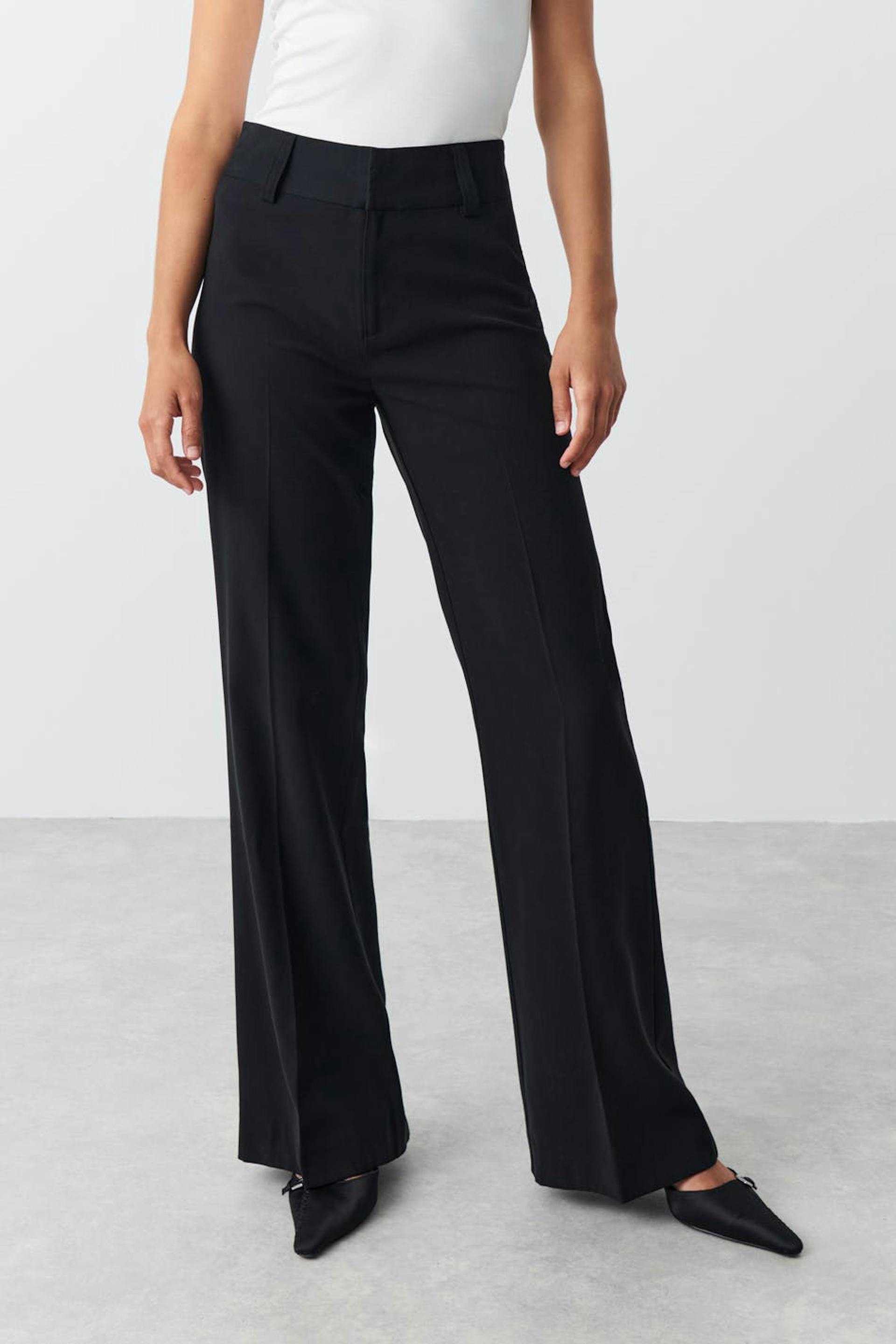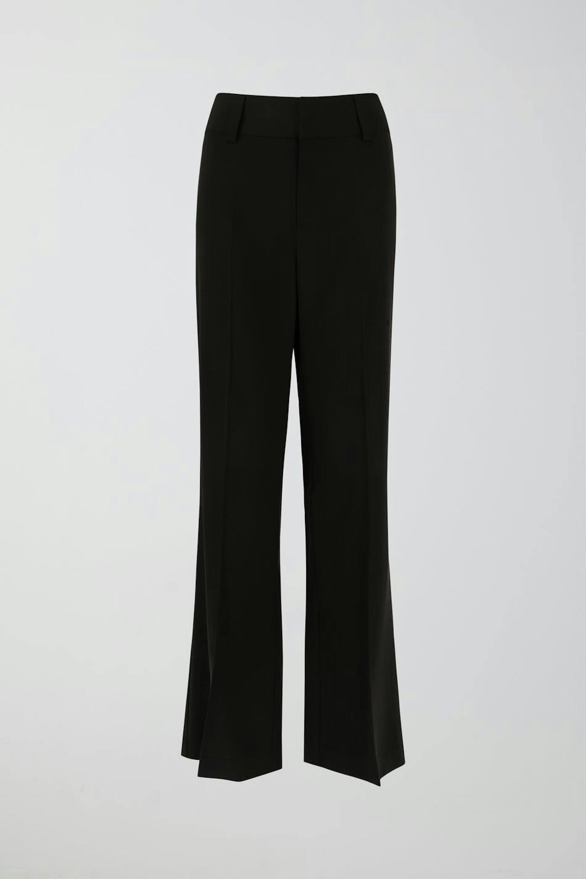 Puvunhousut laskoksilla. Housut ovat mustia ja niissä on lievästi levenevät jalat. Niissä on keskikorkea vyötärö, leveä vyötärönauha vyölenkeillä ja vetoketjusepalus hakaskiinnityksellä.