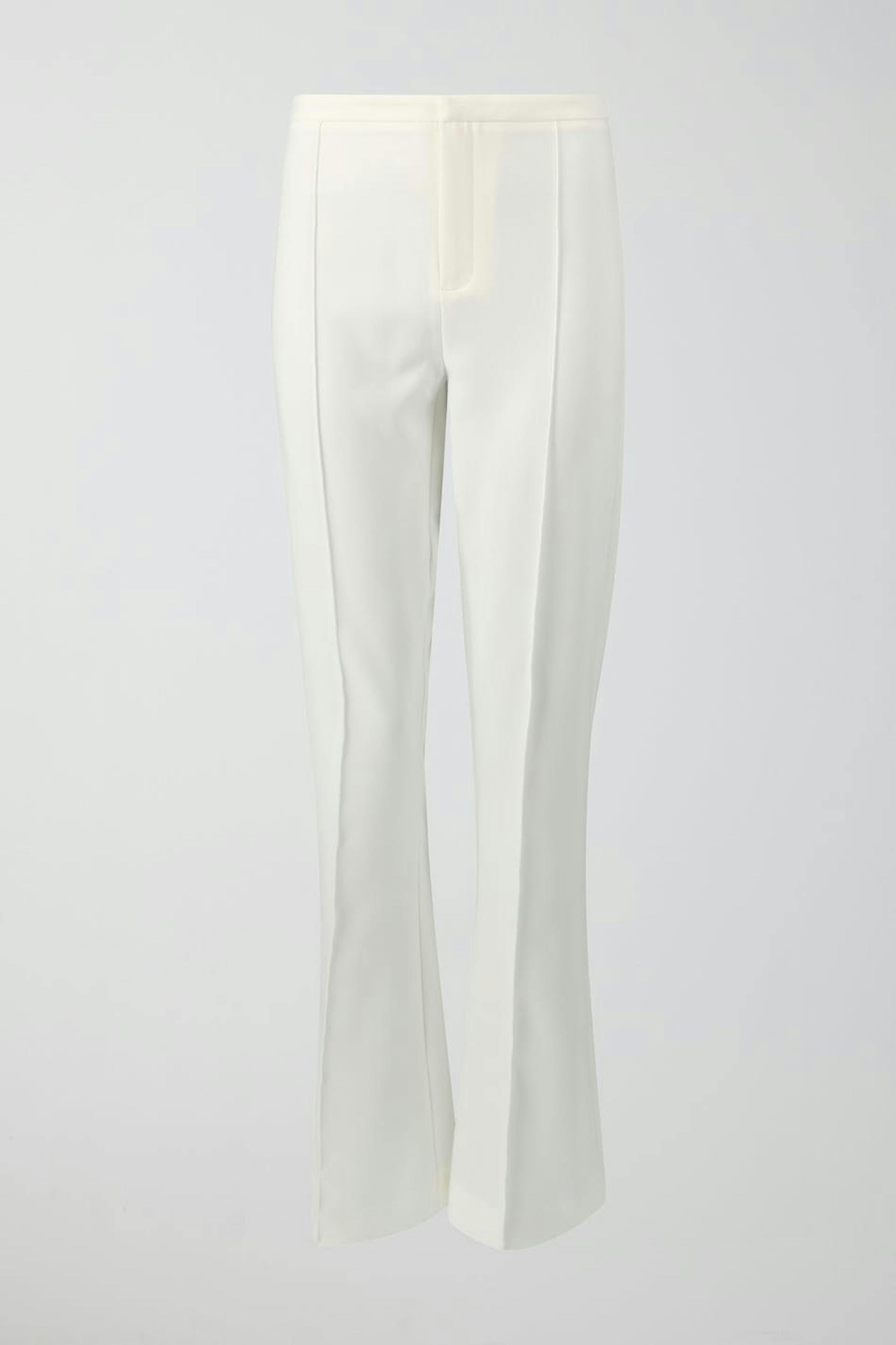 Joustavat puvunhousut korkealla vyötäröllä. Housut ovat valkoisia ja niissä on slim-leikkaus. Niissä on flare-lahkeet, vetoketjusepalus ja kahden kantin tasku takana. Sinulle, joka olet ainakin 176 cm pitkä.
