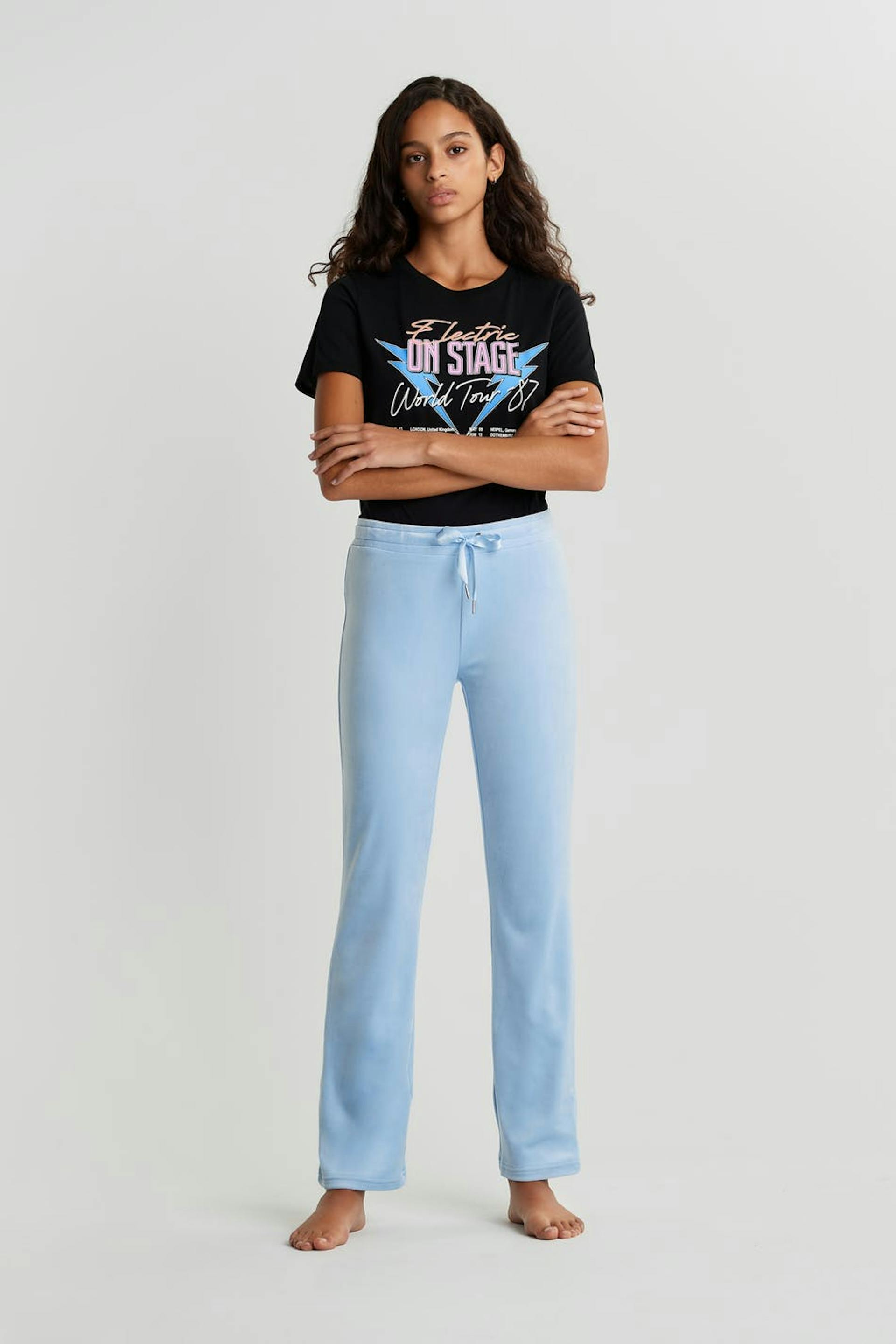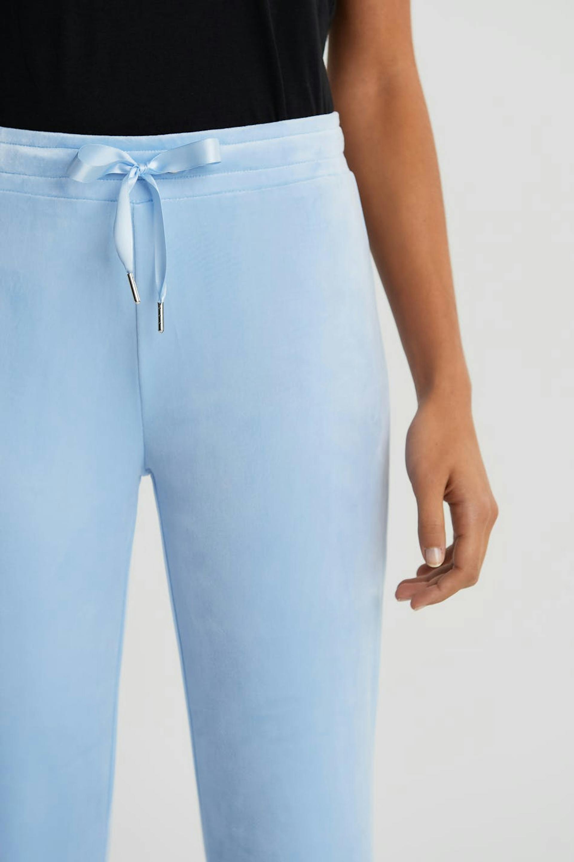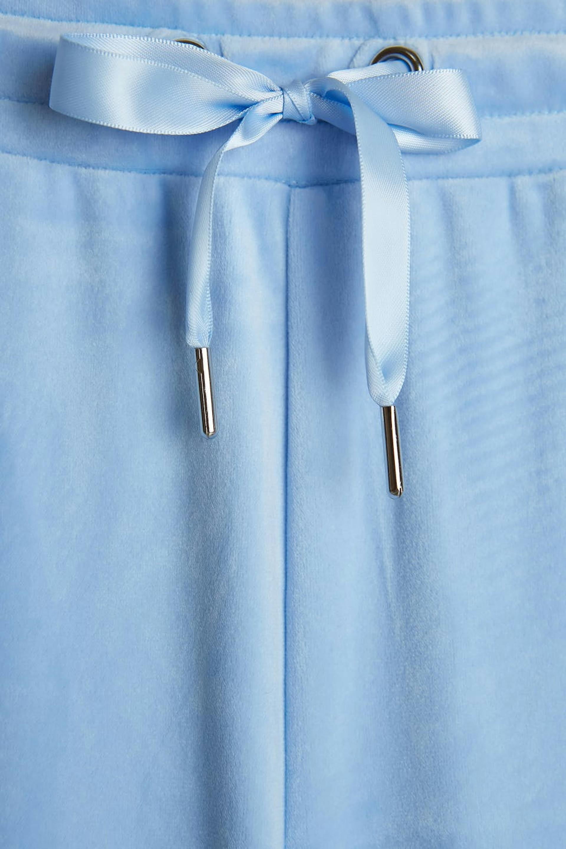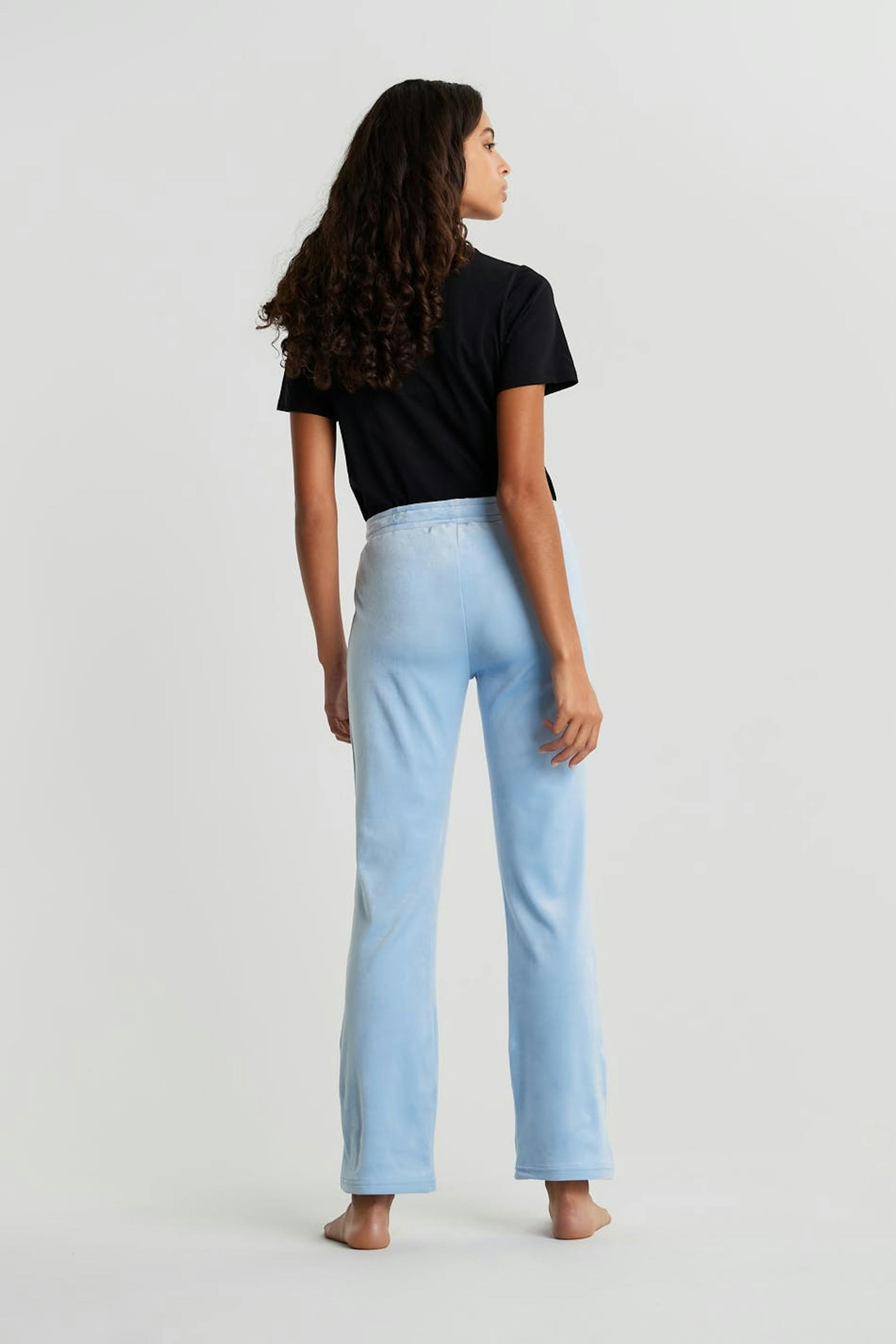 Collegehousut suorilla lahkeilla. Housut ovat vaaleansinisia ja niissä on vyötärö elastisella hihnalla ja kiristysnyörillä. Ne valmistetaan veluurista. Helposti syttyvää materiaalia.