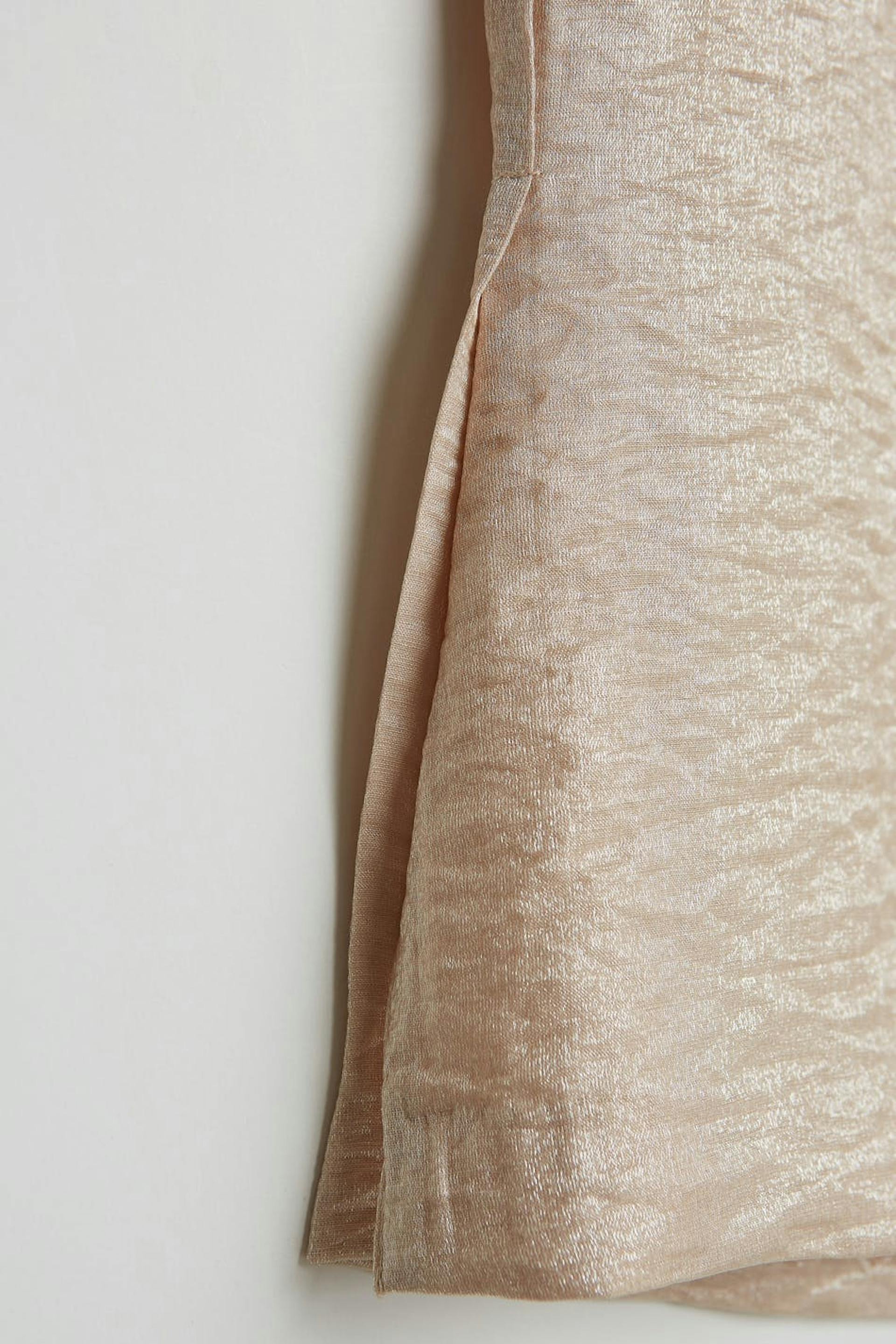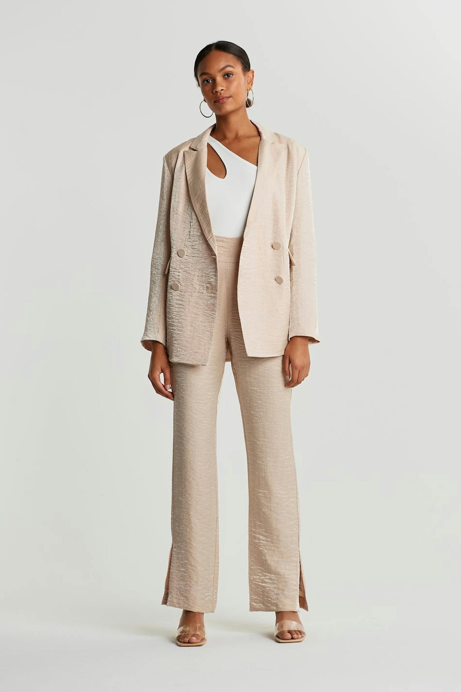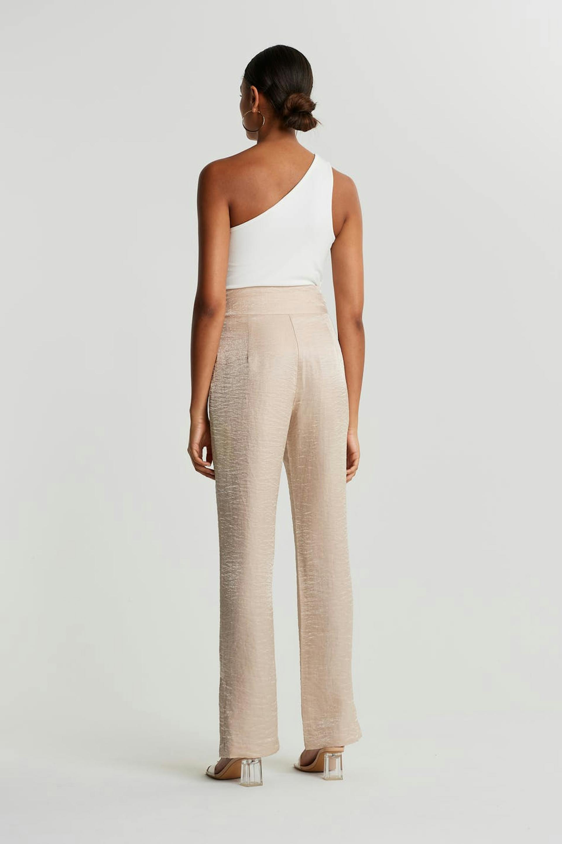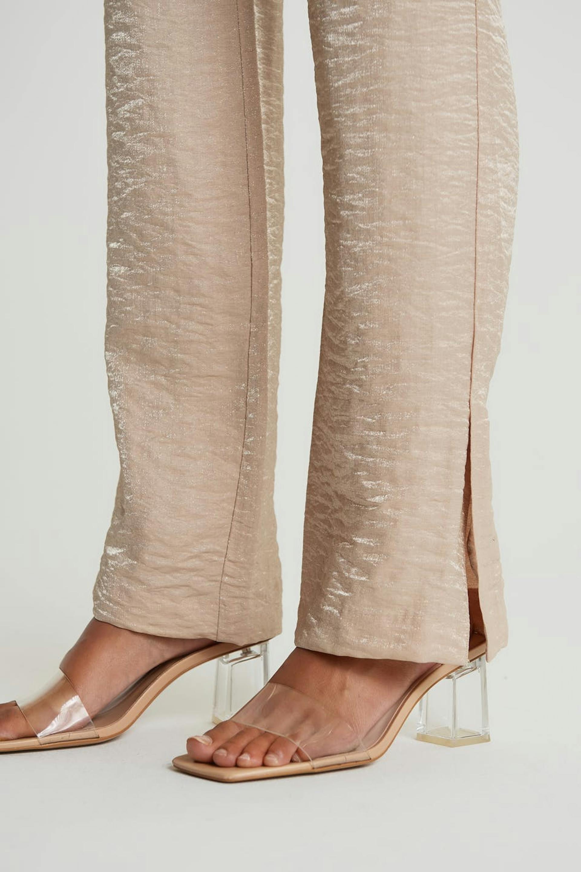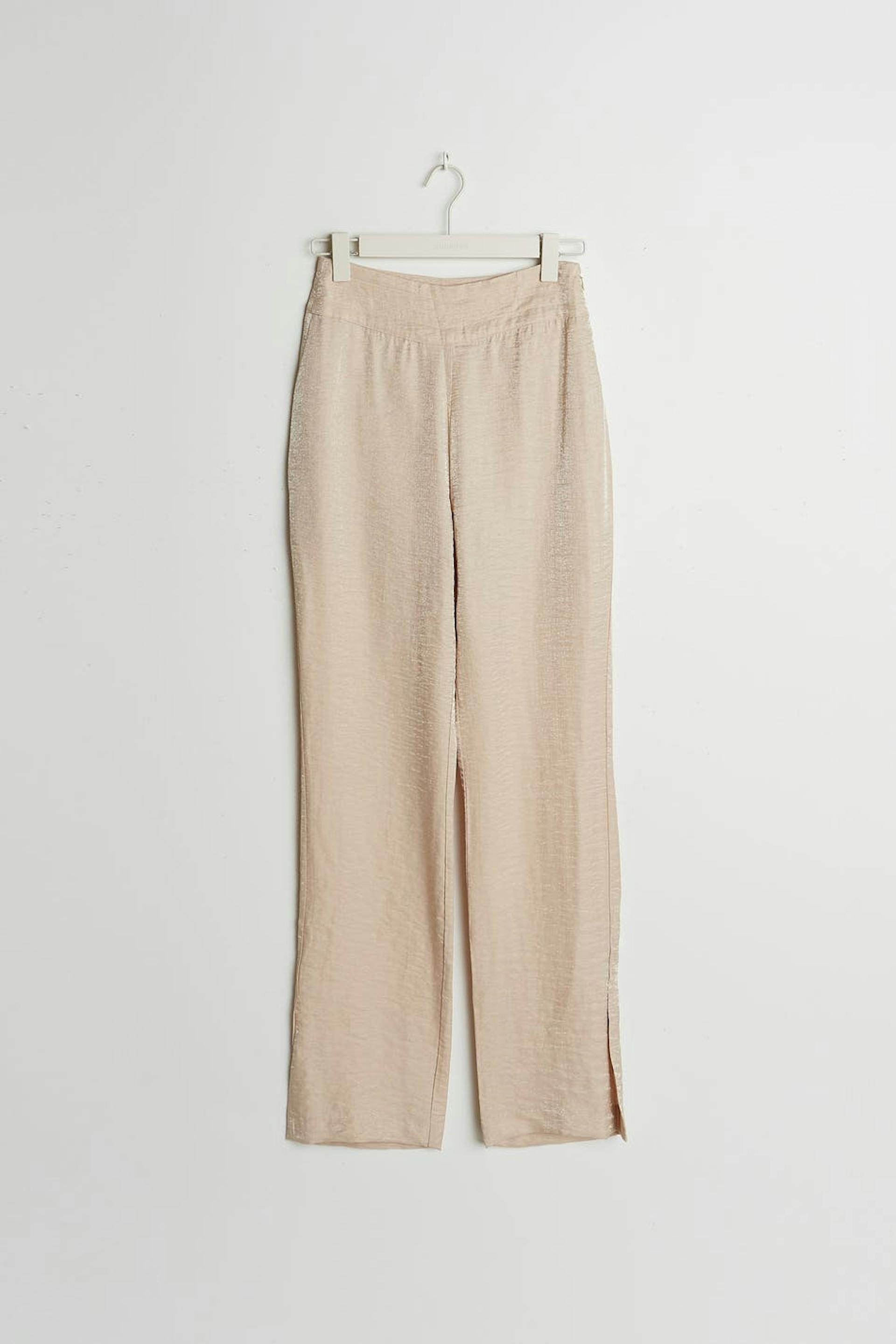 Shampanjan väriset puvunhousut korkealla vyötäröllä. Housut ovat puolueelle täydellisesti sopivia, beigejä ja kimaltelevia. Niissä on halkio sivuissa.