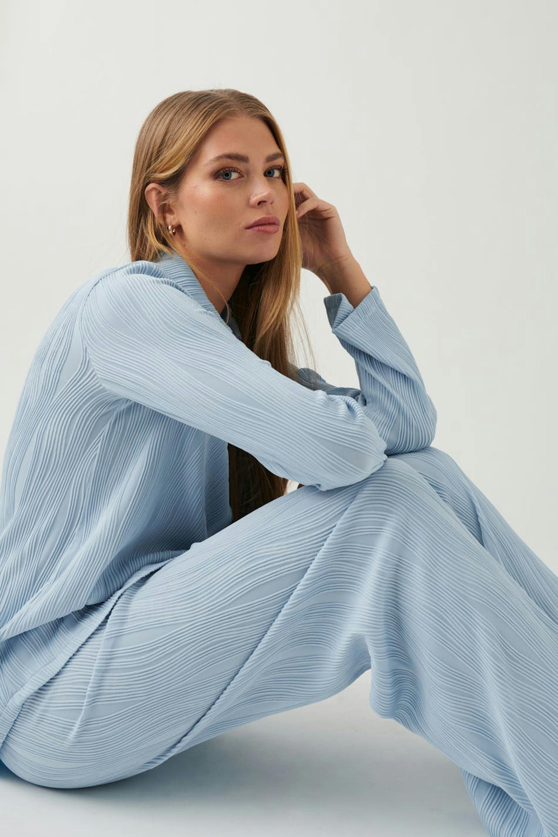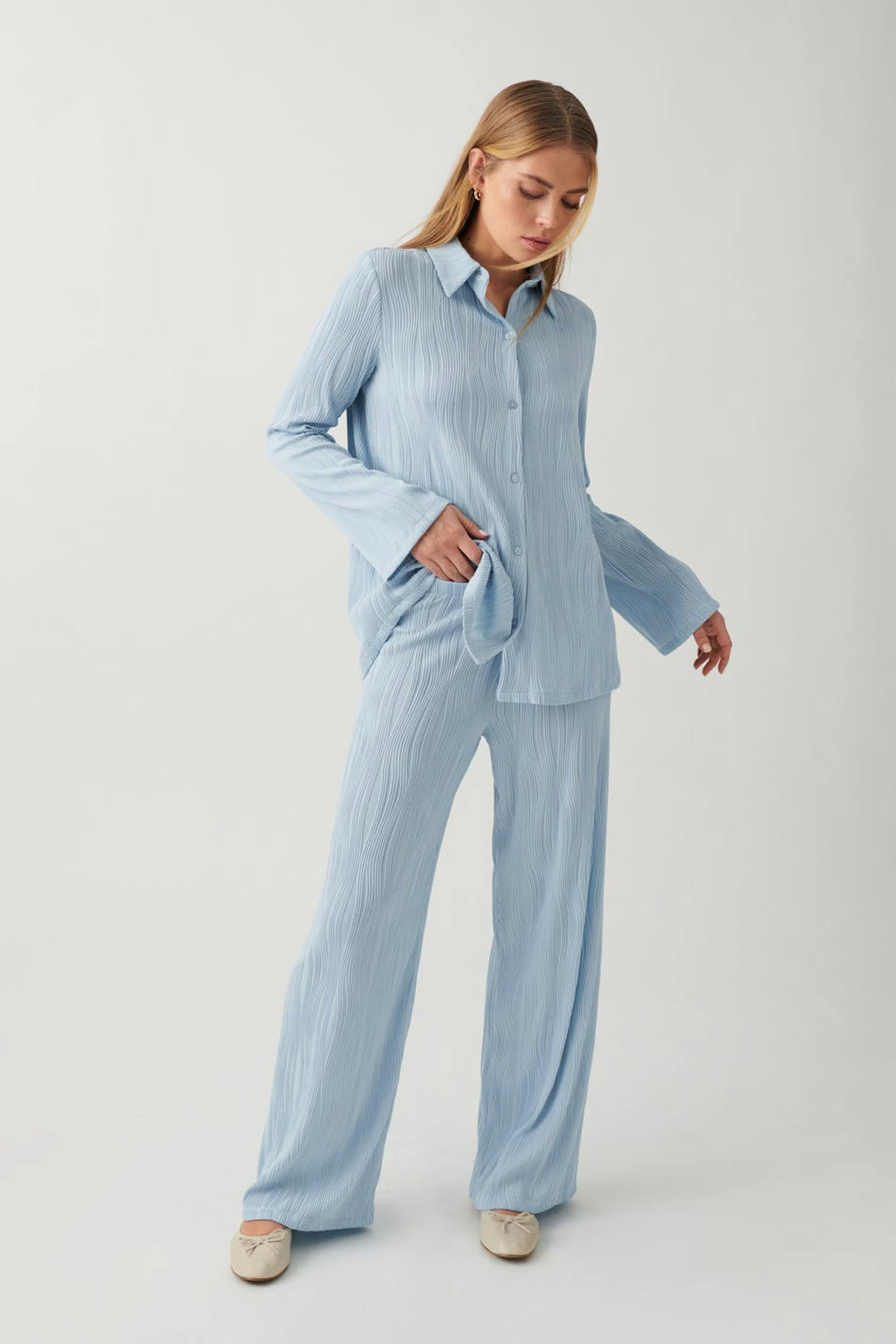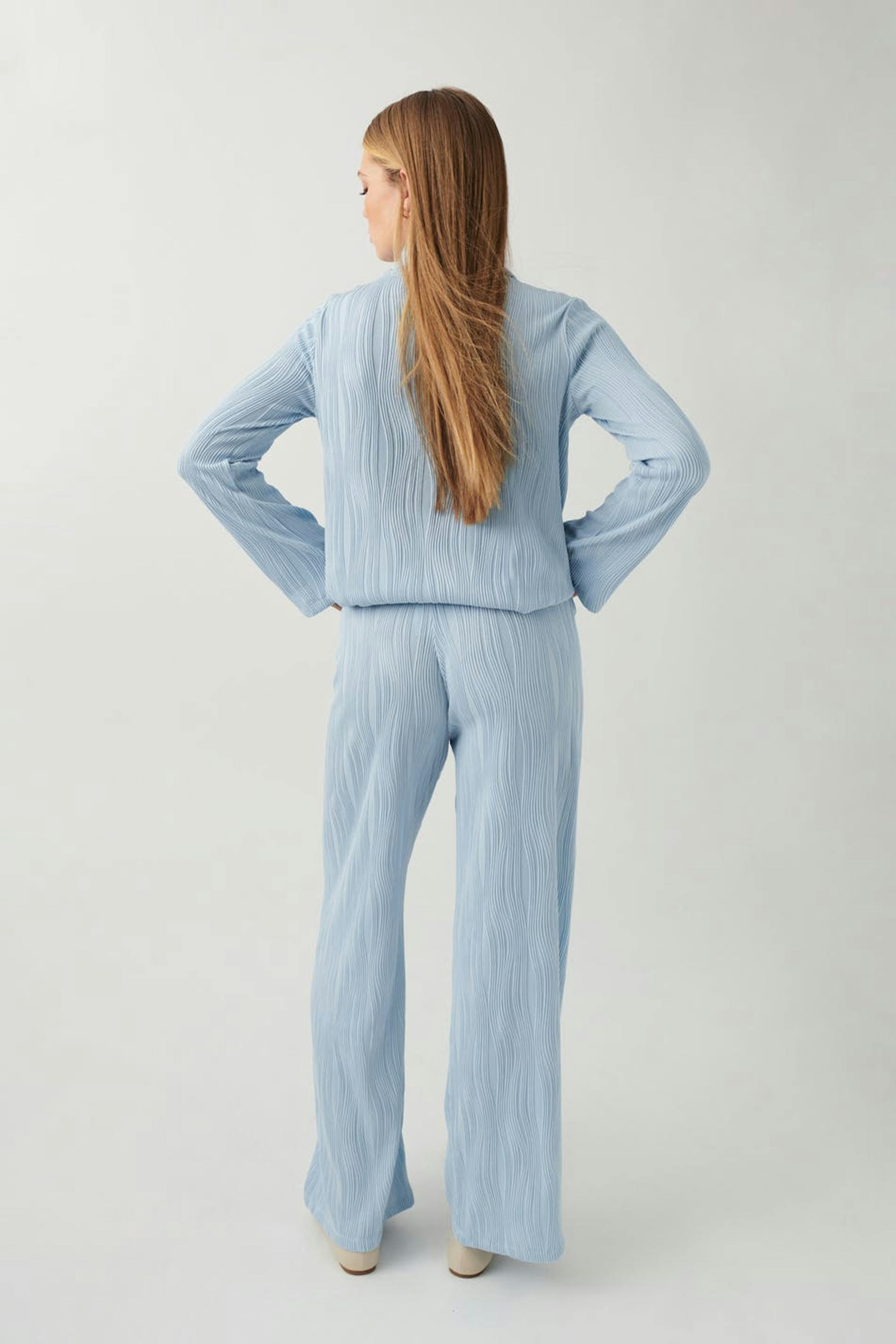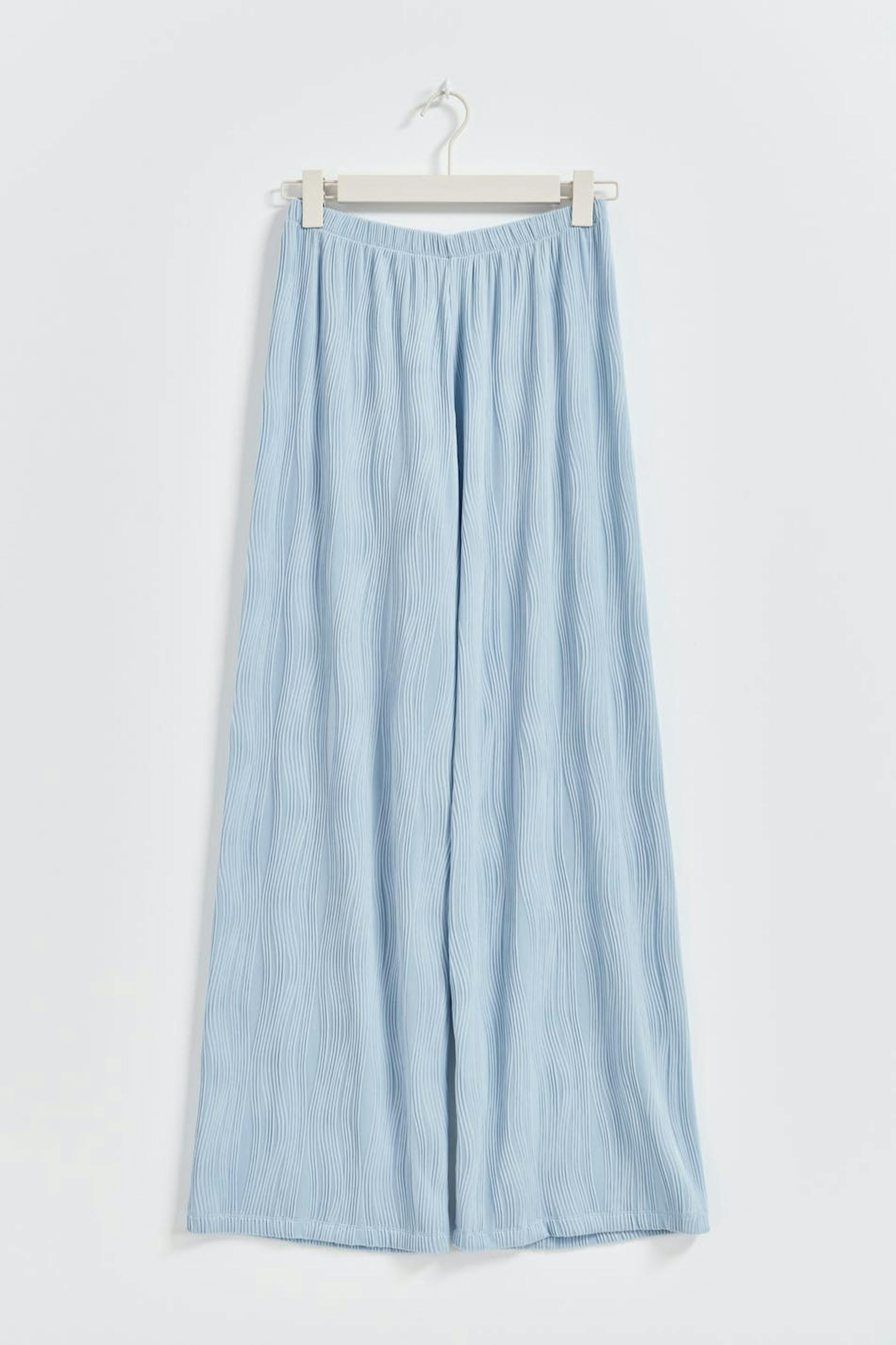 Leveät housut trikoosta rakennemateriaalilla. Housut ovat sinisiä ja niissä on normaali vyötärö. Niissä on pehmeä kuminauha vyötäröllä ja normaali pituus.