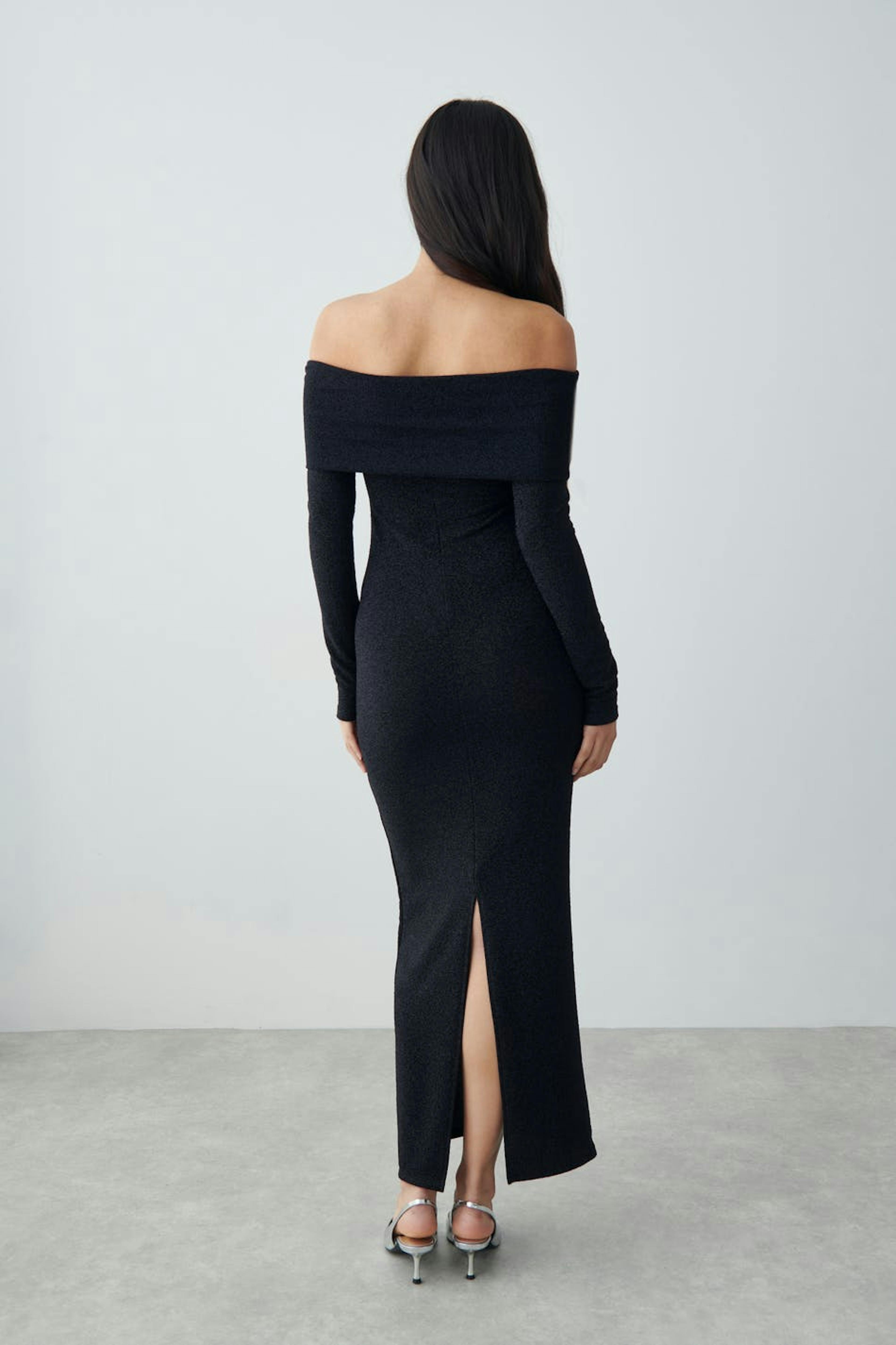 Pitkähihainen off the shoulder -mekko halkiolla takana. Mekko on musta, kimalteleva ja pitkä. Siinä on tyköistuva istuvuus ja läpikuultava, joustava laatu.