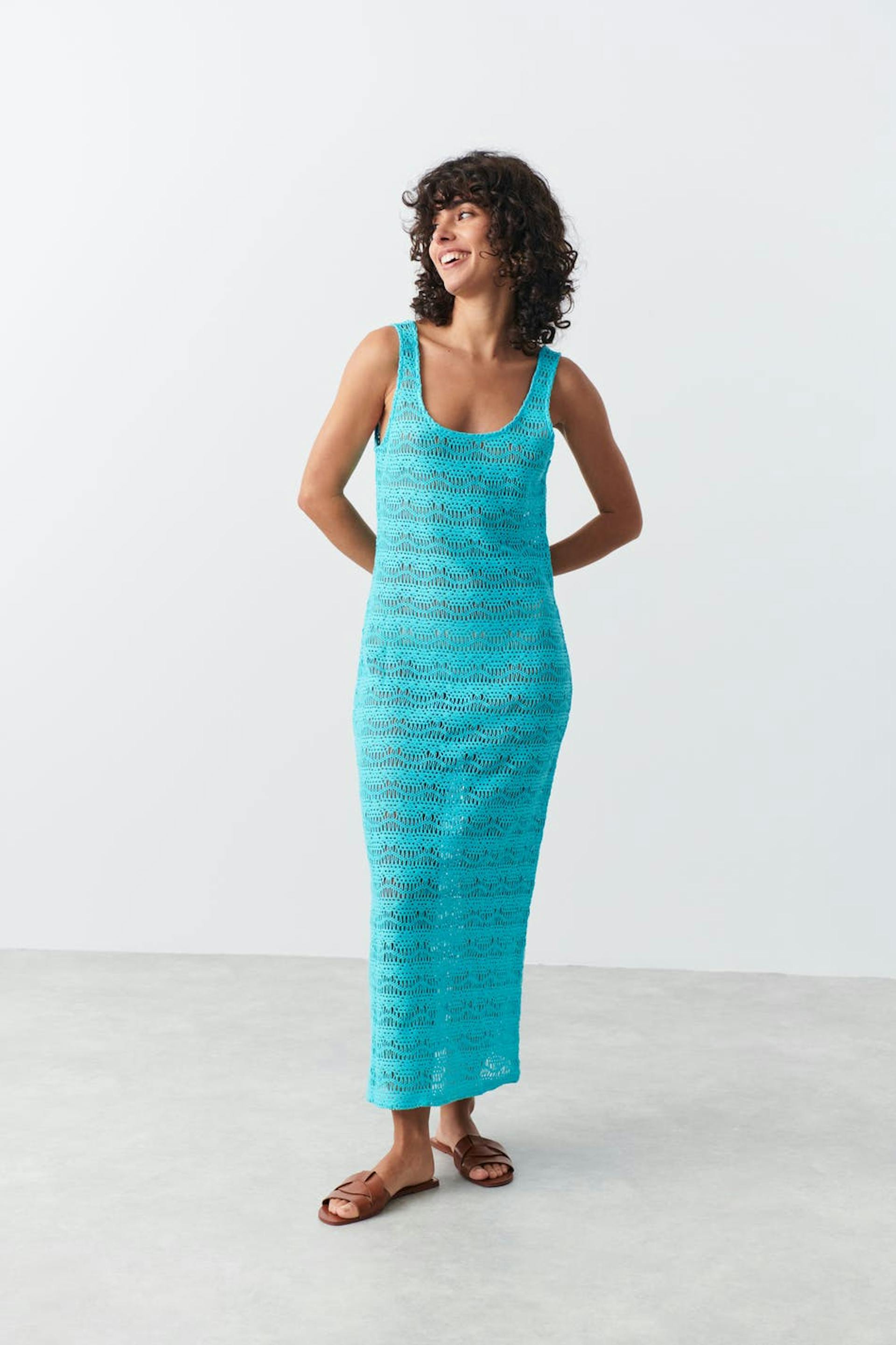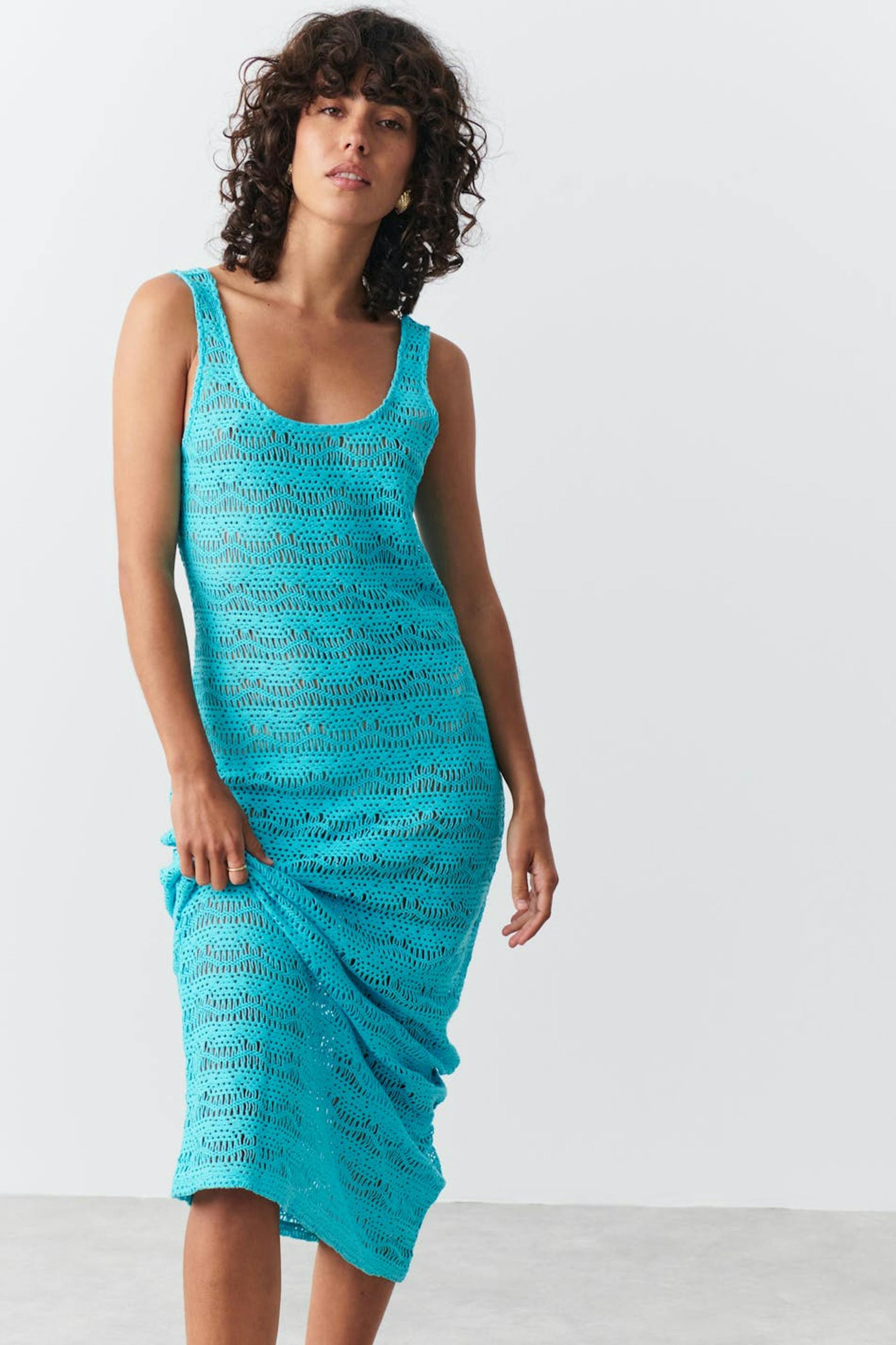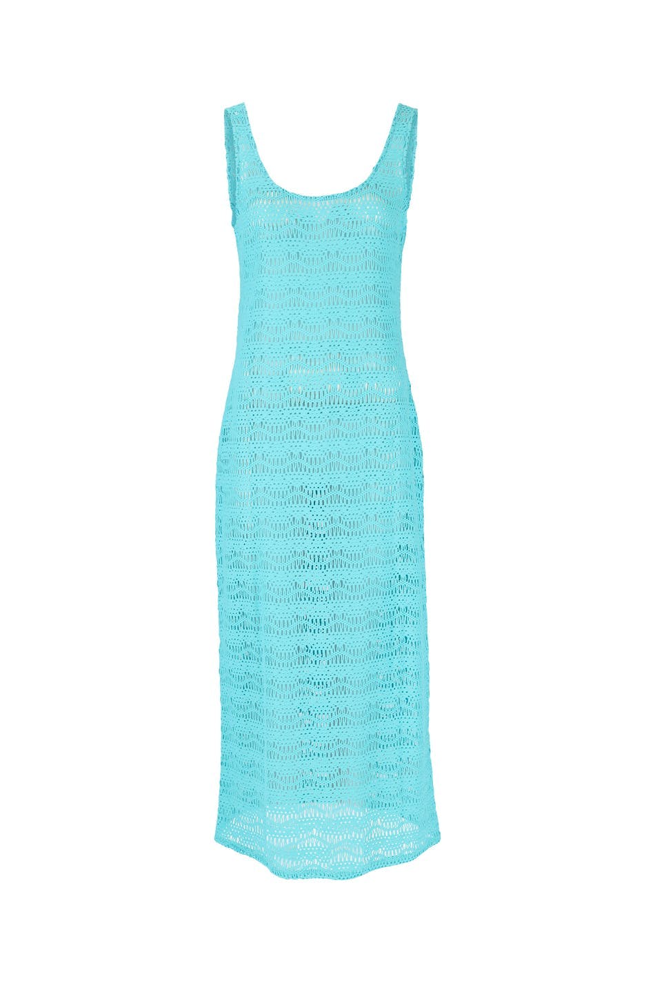 Virkattu mekko suoralla istuvuudella. Mekko on sininen. Siinä on syvä pääntie selässä.