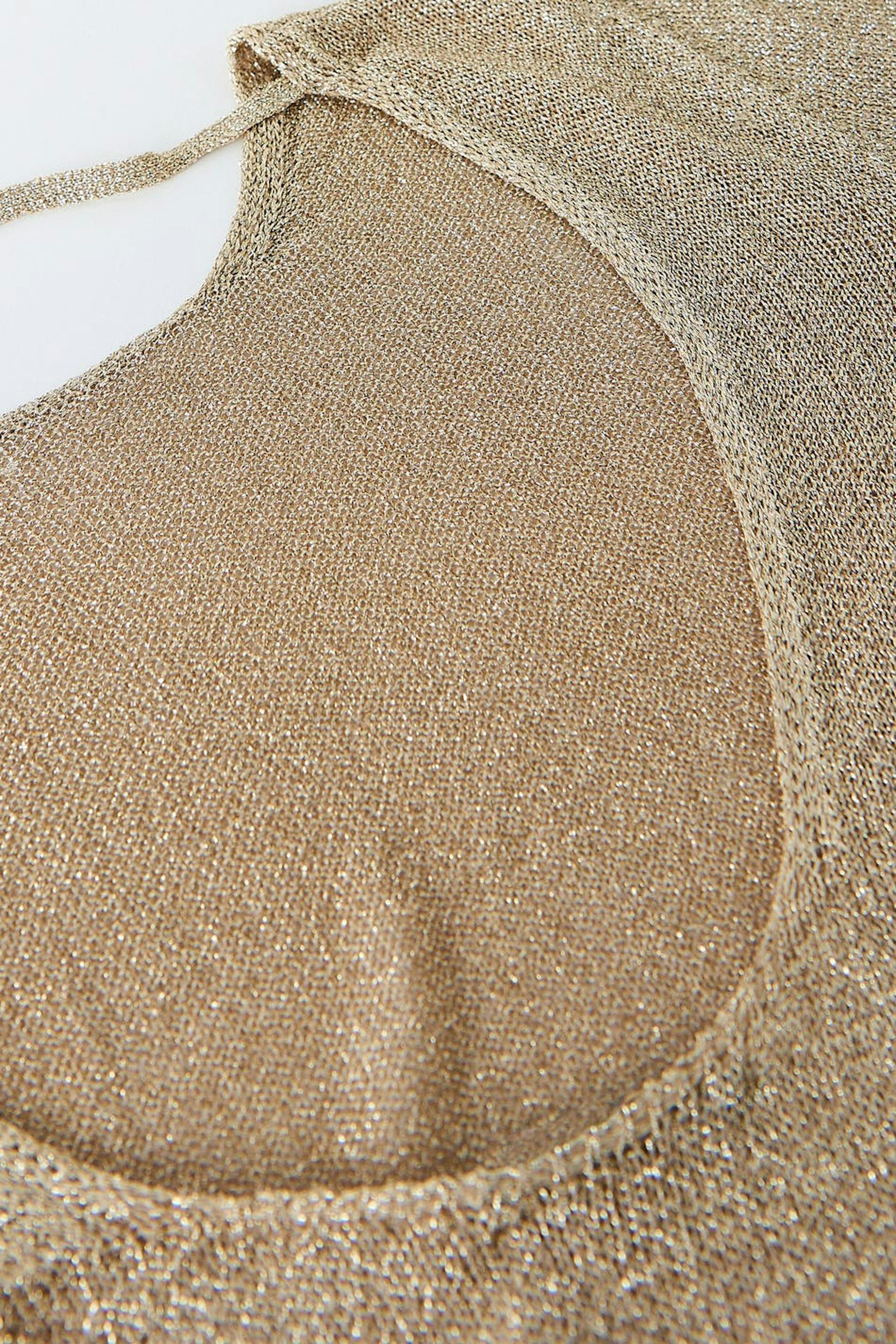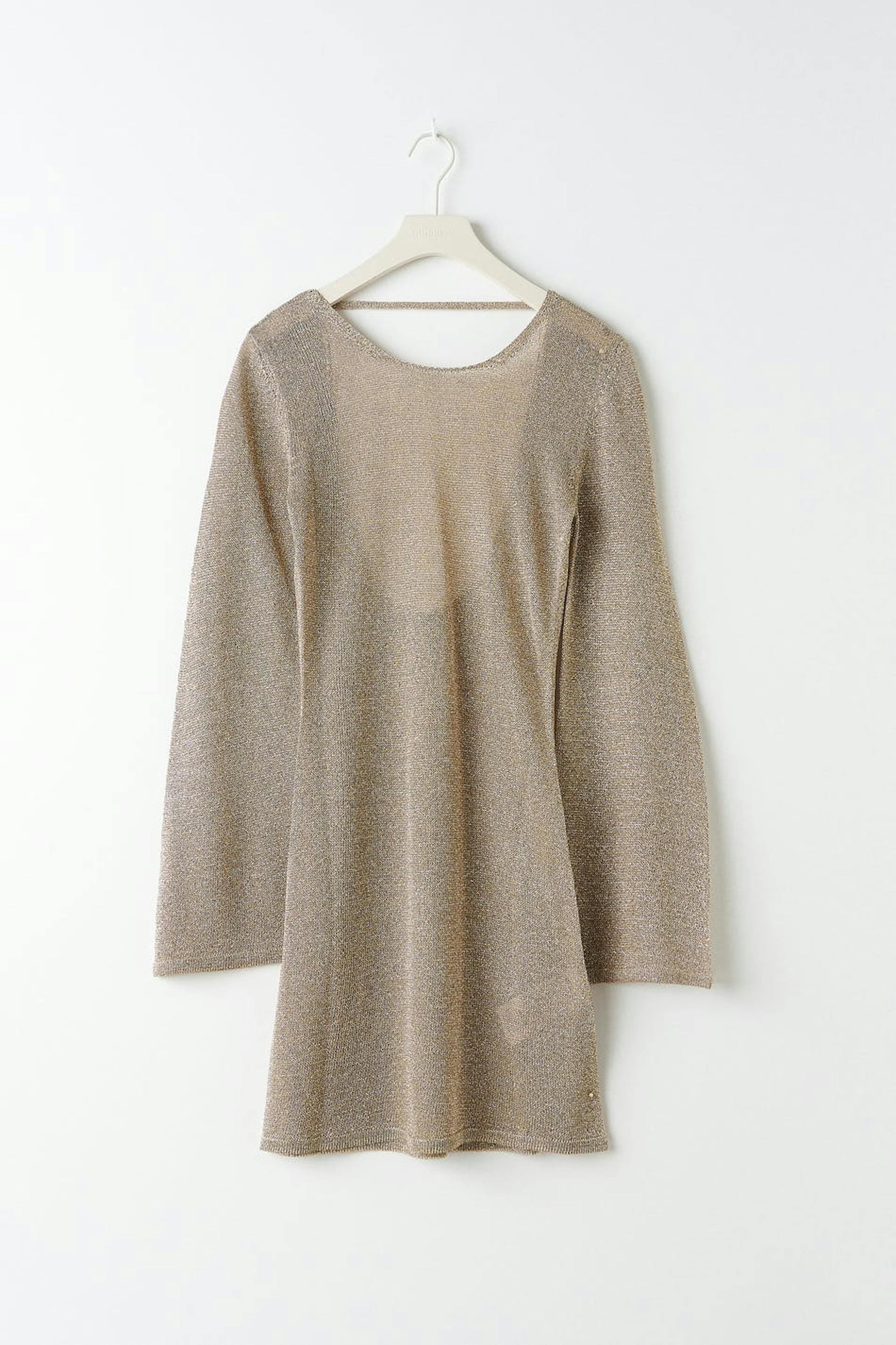Pitkähihainen neulemekko avonaisella selällä. Mekko on juhliin täydellisesti sopiva, kultainen ja lyhyt. Siinä on hohtava materiaali ja vartalonmyötäinen istuvuus levenevillä hihoilla.