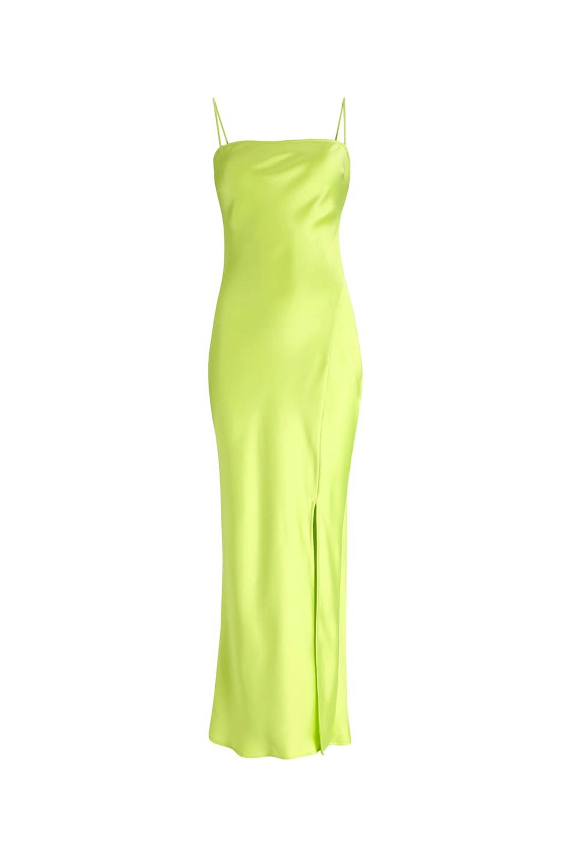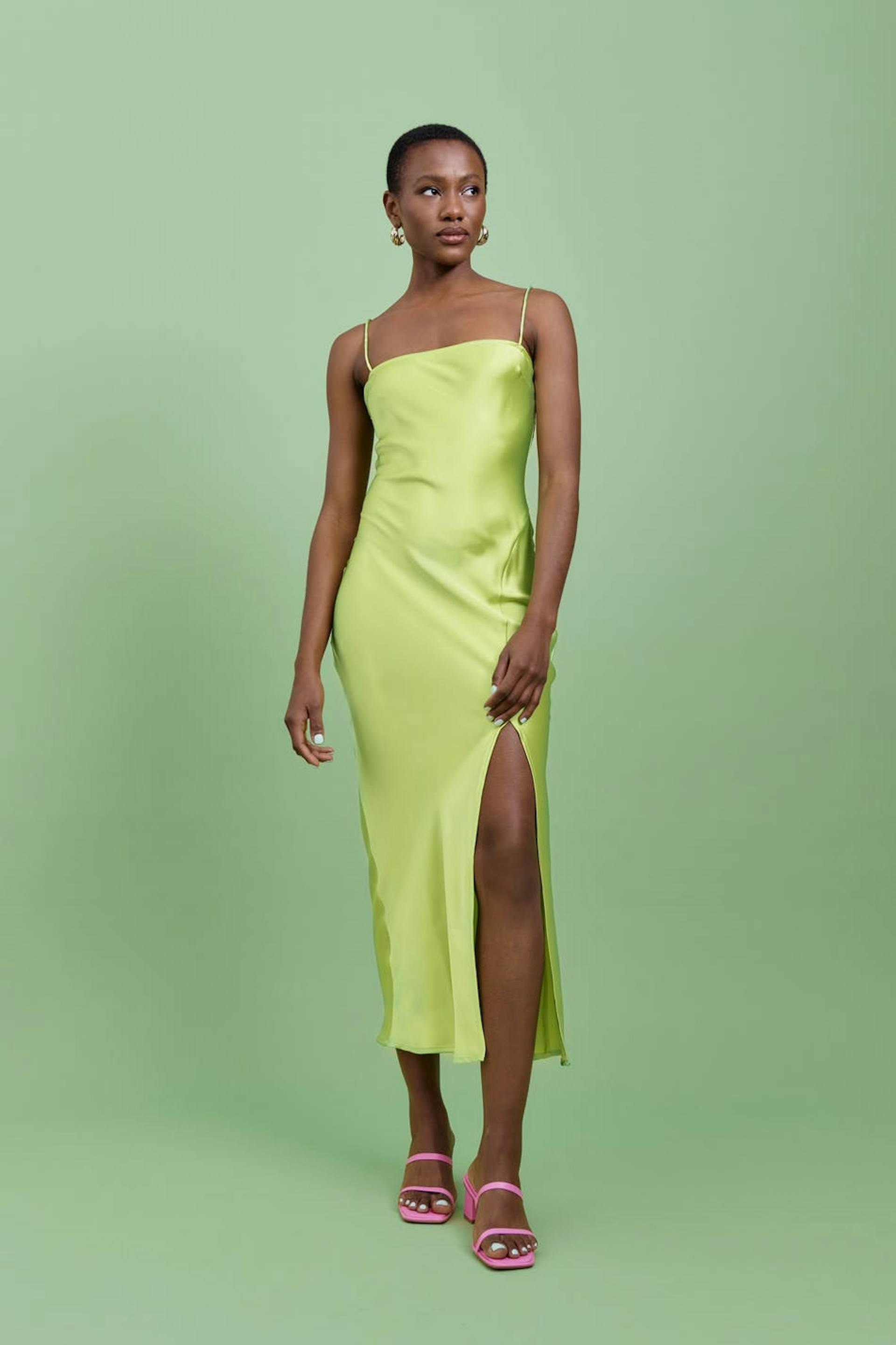 Hihaton satiinimekko halkiolla edessä. Satiinimekko on vihreä ja siinä on pehmeä, taipuisa laatu. Siinä on ohuet, säädettävät olkaimet ja midi-pituus.