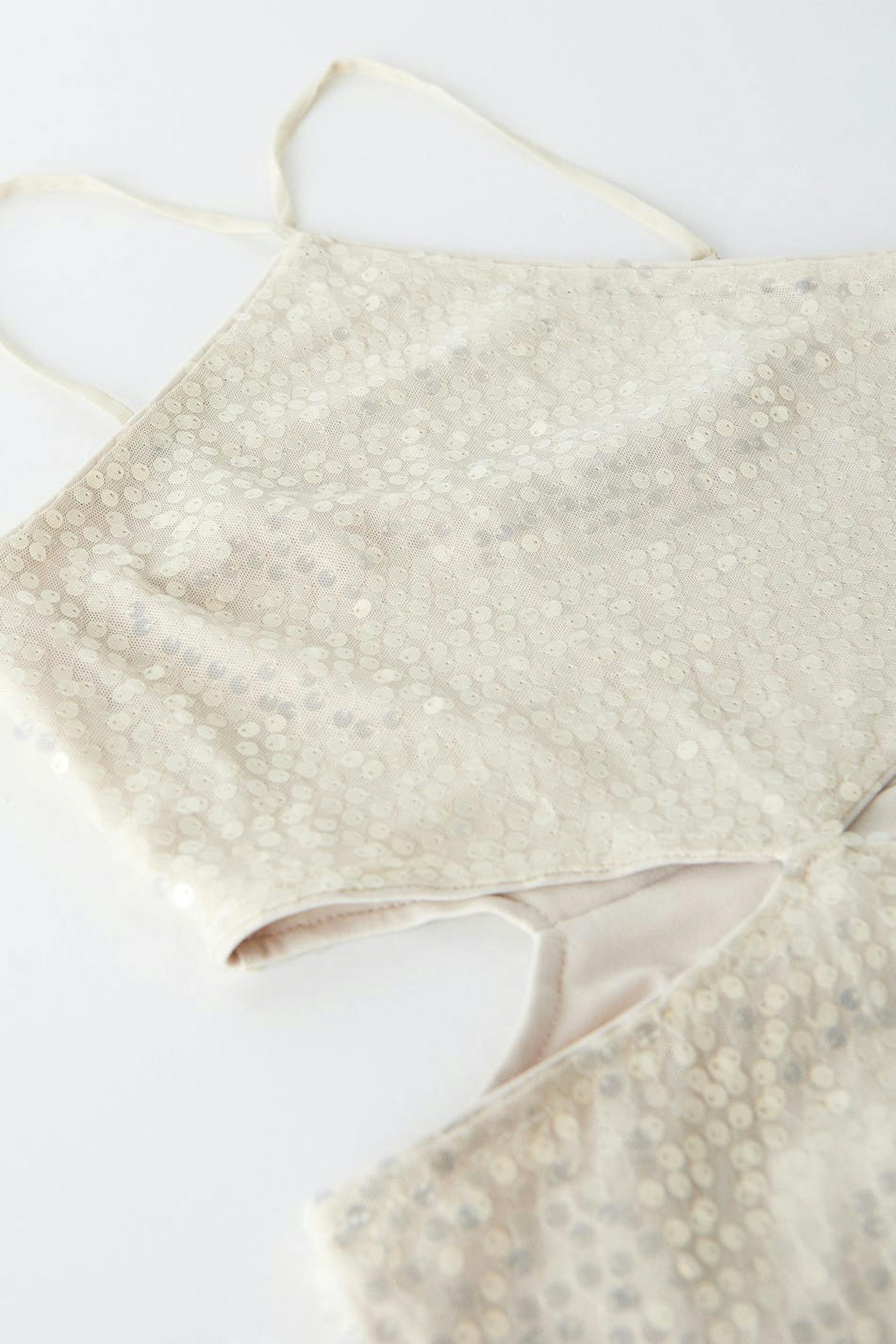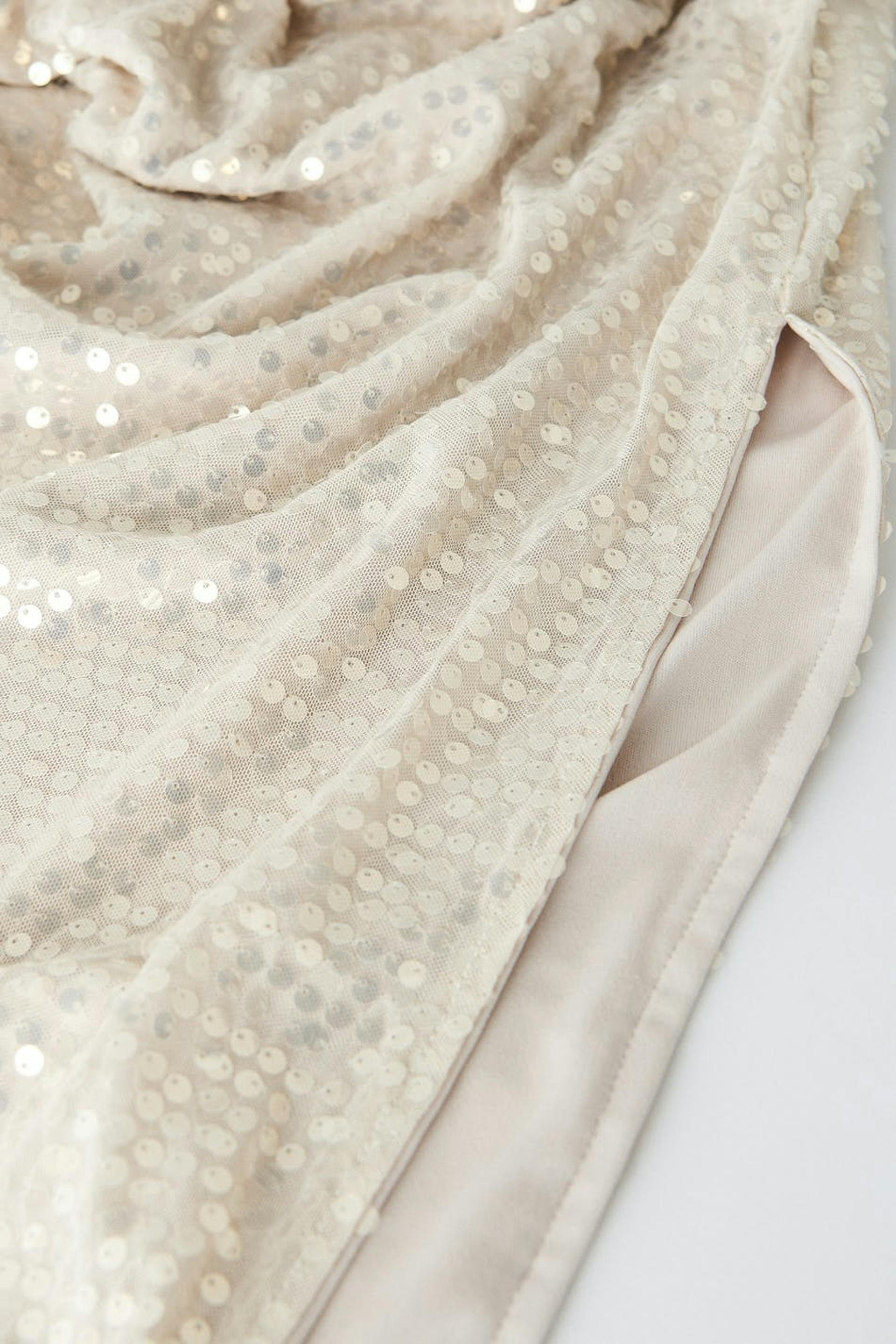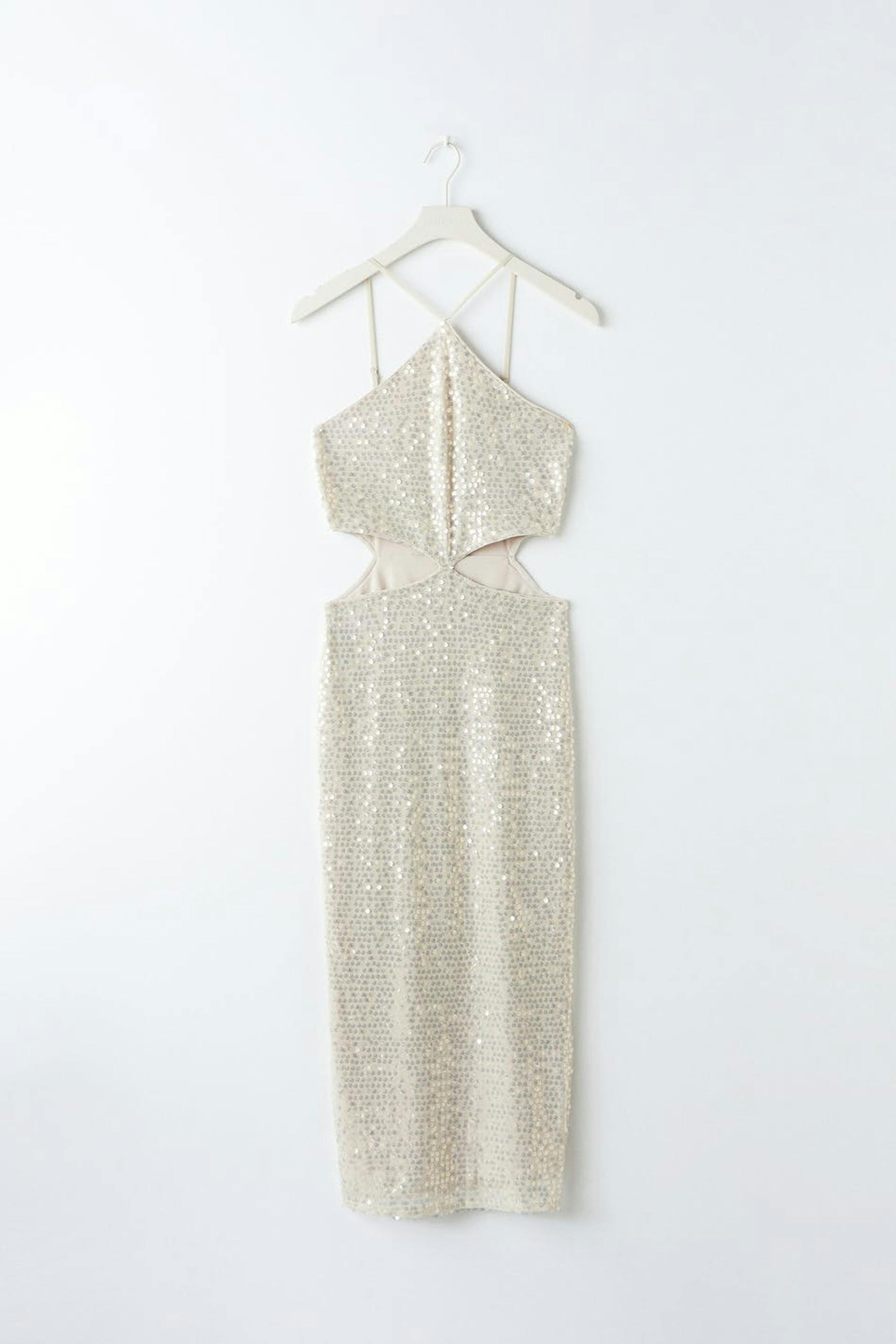 Paljettimekko leikeyksityiskohdilla sivuilla. Mekko on juhliin täydellisesti sopiva ja beige ja siinä on vartalonmyötäinen istuvuus. Siinä on midi-pituus, halkio sivulla ja ohuet, säädettävät olkaimet.